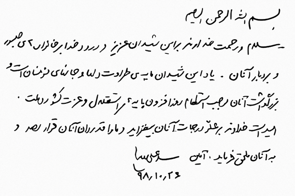 پس از اهدای سلام و تحیات الهی و تسلیت شهادت پرافتخار و عزتآفرین سپهبد حاج قاسم سلیمانی باستحضار حضرت مستطاب عالی میرساند: