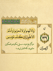 https://farsi.khamenei.ir/themes/fa_def/images/home/rect-1-n.gif حضرت آیتالله خامنهای، در دوّمین پیام تلویزیونی به ملّت ایران در پی تهاجم رژیم صهیونی، آیهی ۱۳۹ سورهی آلعمران - «وَ لا تَهِنوا وَ لا تَحزَنوا وَ اَنتُمُ الاَعلَونَ اِن کُنتُم مُؤمِنین» - را محور بیانات خود قرار داده و از ملّت ایران به خاطر وقتشناسی، متانت و شجاعت خود، تمجید و تقدیر کردند و در پایان به ملّت ایران توصیه فرمودند همین آیهی شریفه را همیشه در نظر داشته باشند. آیهی ۳۵ سورهی محمّد نیز مشابه همین آیه است که میفرماید: «فَلا تَهِنوا وَ تَدعوا اِلَى السَّلمِ وَ اَنتُمُ الاَعلَونَ وَ اللَّهُ مَعَکُم وَ لَن یَتِرَکُم اَعمالَکُم.»