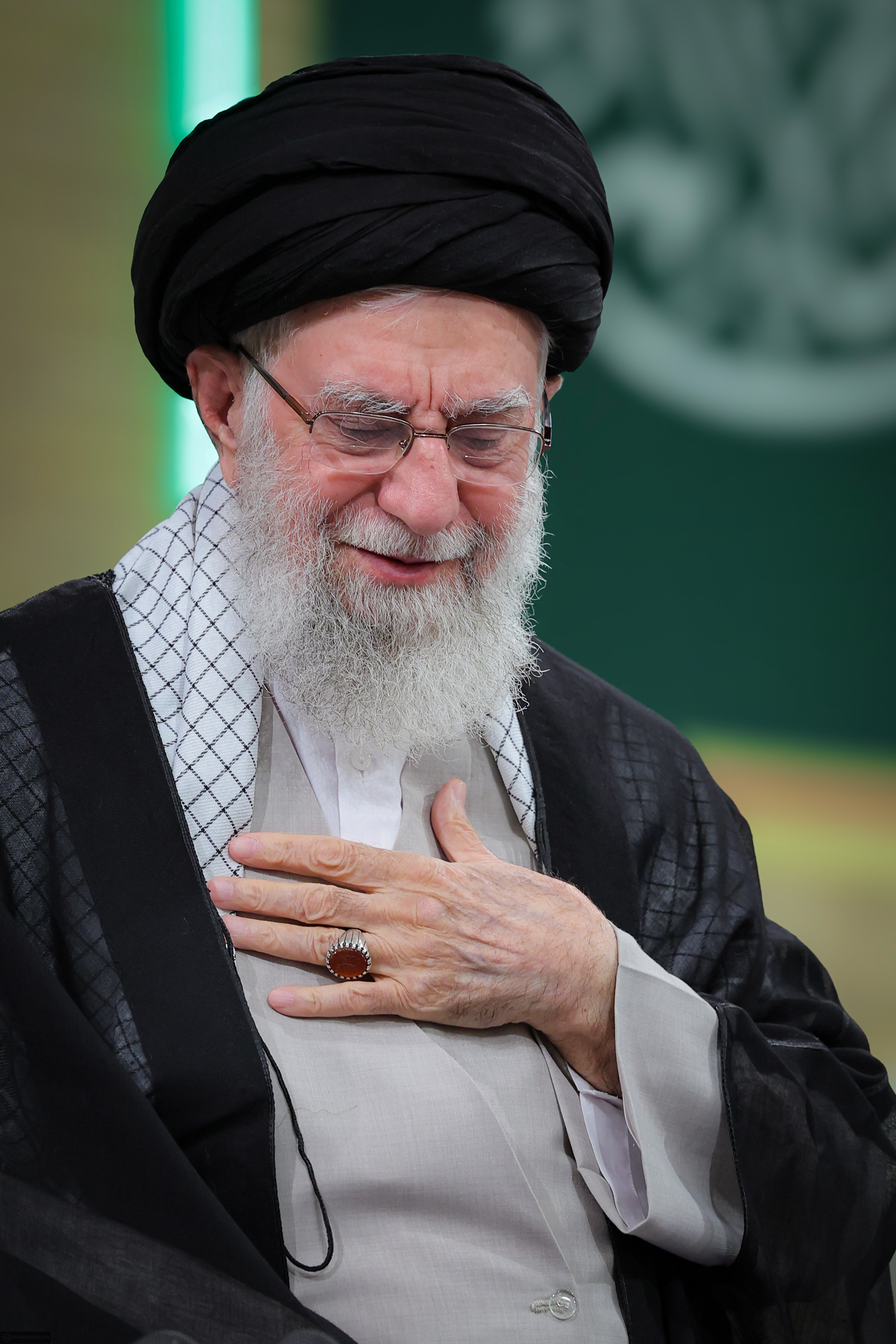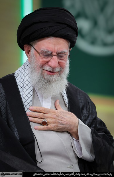 قاری قرآن شروع میکند. کمی از ملک، کمی از علق و کمی قلم... همهچیز بر مبنای مناسبت انتخاب شده. در تمام مدت قرائت، آقا با طمأنینه به تلاوت گوش سپردهاند و در پایان هم با لبخند و بلندکردن دست برای قاری، از او تشکر میکنند.