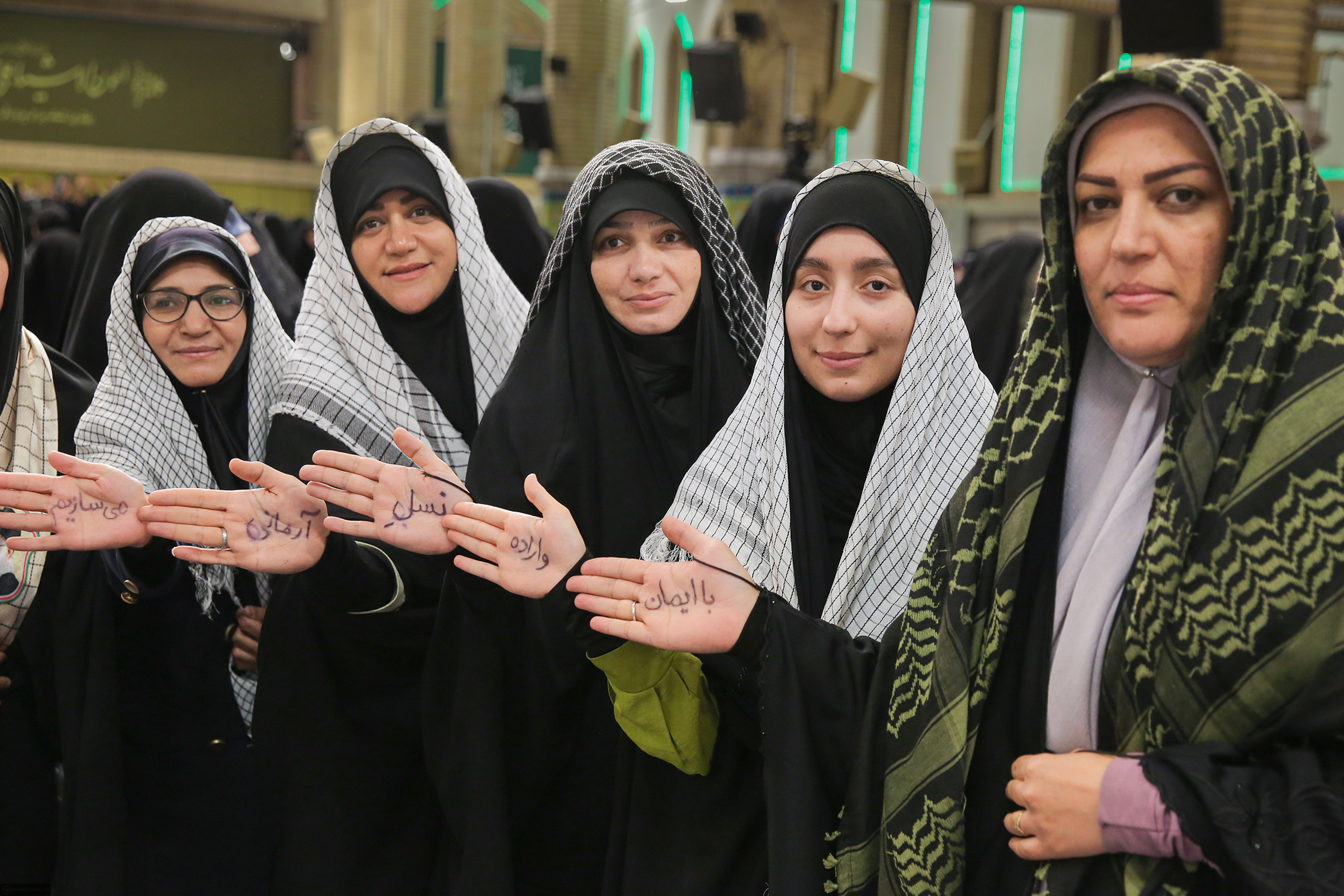 با خلوت شدن حسینیه، یکی از عکاسها از مردهایی که به هم فشرده ایستادهاند و با دستهای شعارنویسی شده و سربندها به دوربین لبخند میزنند عکس میگیرد. صدایش میکنم: «آقای عکاس! از خانمها هم بگیرید!»
