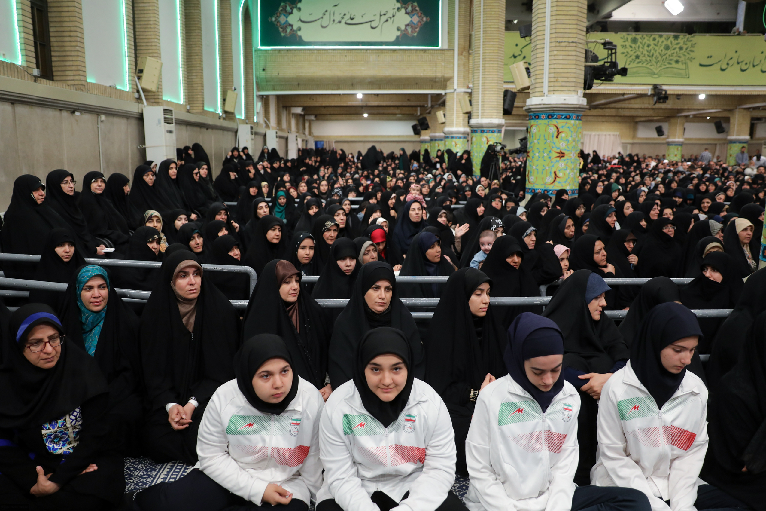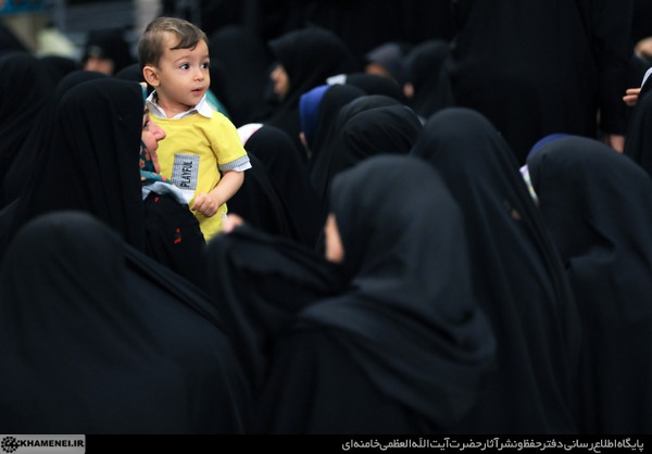 یک دقیقه به ۱۰ مانده، خادمها سعی میکنند جمعیت را بنشانند. کافی است یک نفر برای صافکردن چادرش از جا بلند بشود. جمعیتِ آماده از جا میپرند. هیچکس نمیخواهد لحظهی ورود را از دست بدهد. شعارها ادامه دارد. هنوز «این همه لشکر آمده» با اقتدار حرف اول را بین شعارها میزند. اما معلمها یک حرکت مؤدبانه و متمایز دارند. میگویند: «ای پسر فاطمه! منتظر شماییم!» همیشه این شعار را با خطاب «تو» شنیده بودم. سرمست از این دقت و ادب هستم که پرده کنار میرود و آقا وارد میشوند.