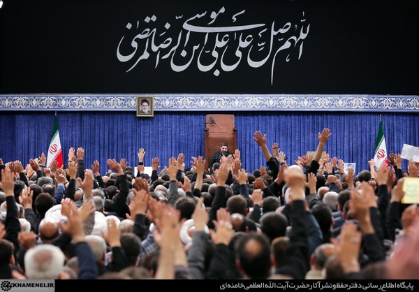 رهبر معظم انقلاب به سمت جایگاه سخنرانی میروند. جمعیت میایستد: «ما اهل کوفه نیستیم علی تنها بماند» بعضی روی نوک پا هستند، بعضی دست تکان میدهند. آقا دست بالا میبرند و مهر پدرانهشان را سوی ما روانه میکنند. سخنرانی شروع میشود. صحبتهای آقا دو بخش دارد. بخش اول پیرامون امام رضا