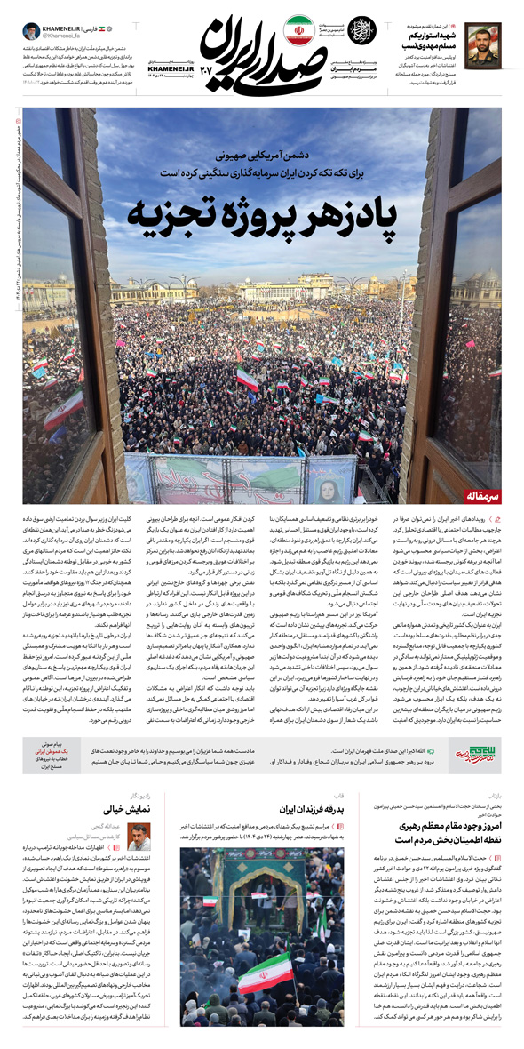 «صدای ایران»، روزنامه اینترنتی رسانهی KHAMENEI.IR که از روزهای آغازین جنگ ۱۲ روزه رژیم صهیونی علیه ایران با مأموریتی که ذکر شد آغاز به کار کرد، حال و در زمان توقف آتش سعی دارد تا بهصورت روزانه همراه ملّت ایران باشد. محورهای مهم و مرتبط را از لابهلای سیل اخبار و اطلاعات درست و نادرست بیرون کشیده، سره را از ناسره جدا کرده و وضعیت راهبردی جمهوری اسلامی ایران را آنگونه که هست روایت کند. «صدای ایران» صدای ملّت ایران خواهد بود و راوی ایستادگی و مقاومت آنها.