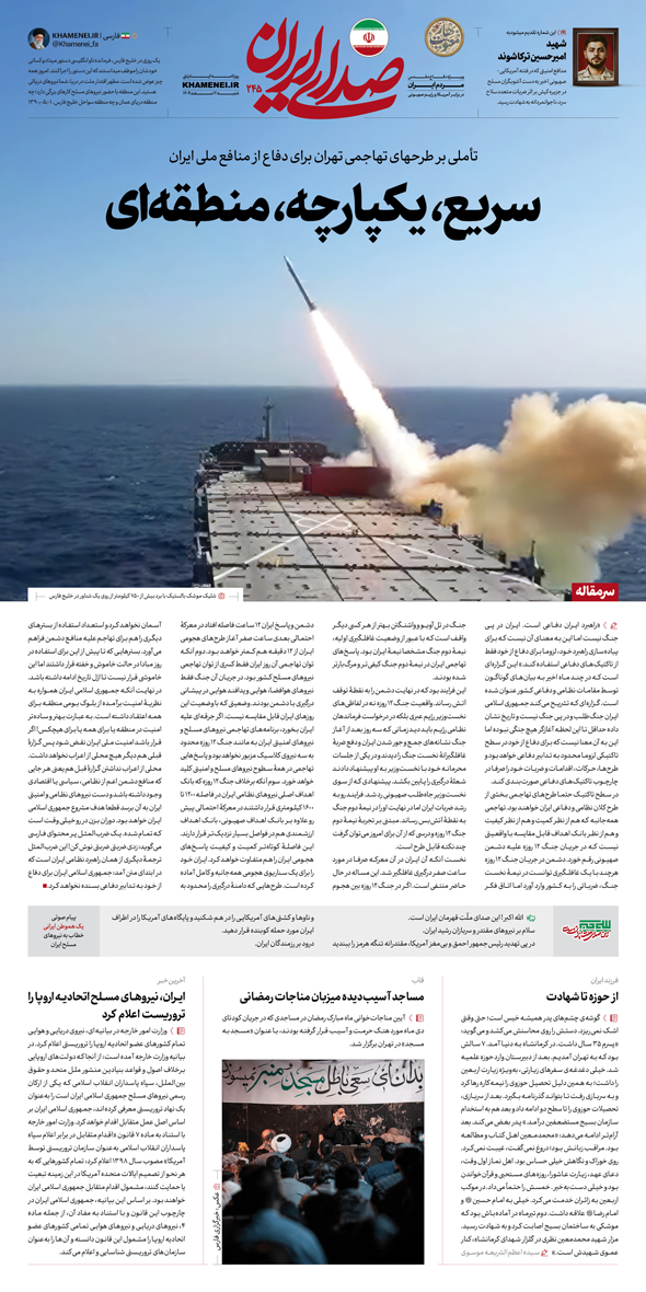 دویست و چهل و پنجمین شماره «صدای ایران»، تقدیم میشود به روح مطهر، شهید امیرحسین ترکاشوند، مدافع امنیتی که در فتنه آمریکایی-صهیونی اخیر به دست آشوبگران مسلح در جزیره کیش بر اثر ضربات متعدد سلاح سرد، ناجوانمردانه به شهادت رسید.