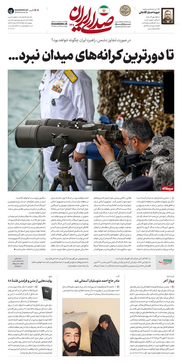«صدای ایران»، روزنامه اینترنتی رسانهی KHAMENEI.IR که از روزهای آغازین جنگ ۱۲ روزه رژیم صهیونی علیه ایران با مأموریتی که ذکر شد آغاز به کار کرد، حال و در زمان توقف آتش سعی دارد تا بهصورت روزانه همراه ملّت ایران باشد. محورهای مهم و مرتبط را از لابهلای سیل اخبار و اطلاعات درست و نادرست بیرون کشیده، سره را از ناسره جدا کرده و وضعیت راهبردی جمهوری اسلامی ایران را آنگونه که هست روایت کند. «صدای ایران» صدای ملّت ایران خواهد بود و راوی ایستادگی و مقاومت آنها.