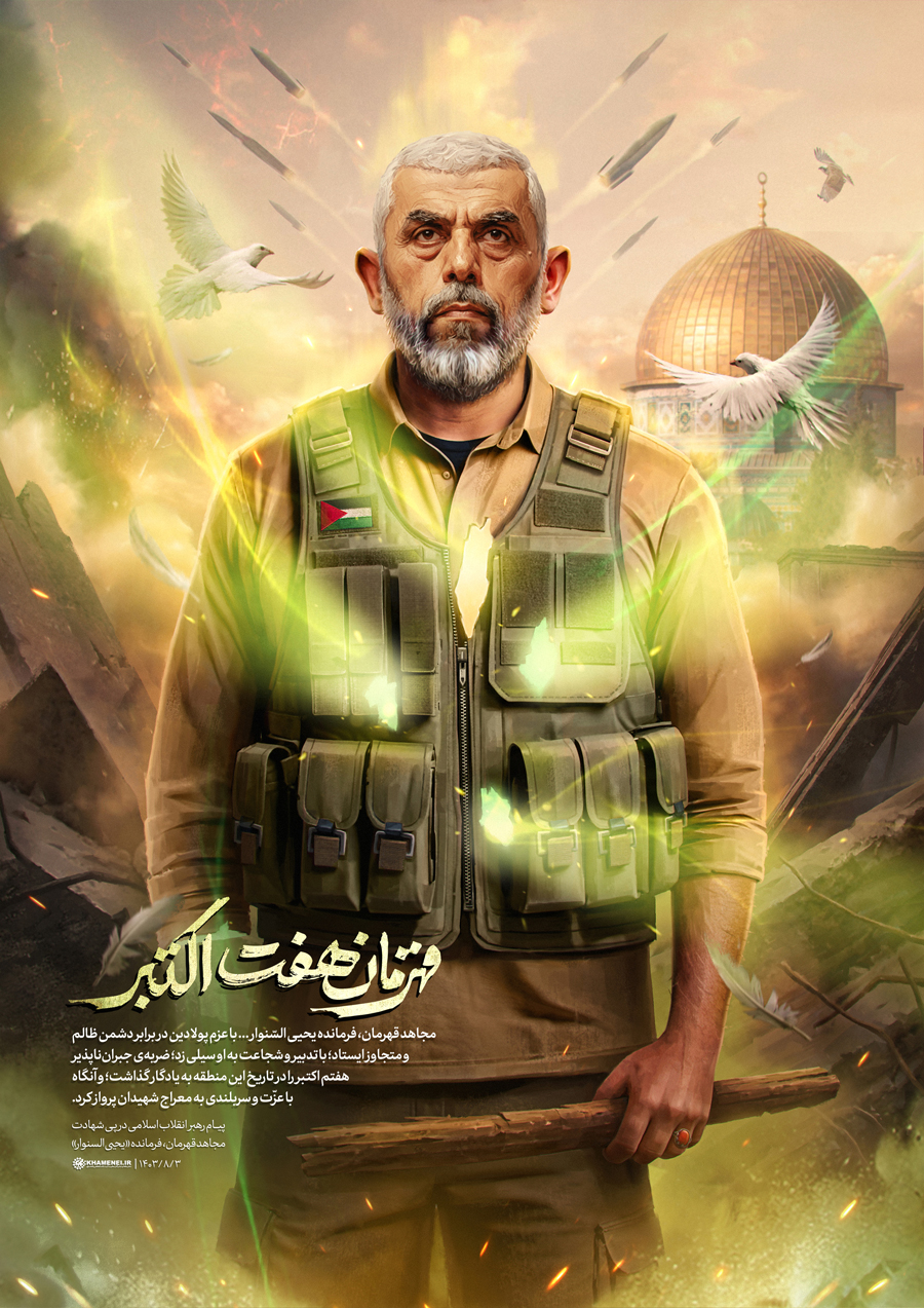 قهرمان هفت اکتبر![]() حضرت آیت الله خامنهای: «مجاهد قهرمان، فرمانده یحیی السّنوار... با عزم پولادین در برابر دشمن ظالم و متجاوز ایستاد؛ با تدبیر و شجاعت به او سیلی زد؛ ضربهی جبرانناپذیر هفتم اکتبر را در تاریخ این منطقه به یادگار گذاشت؛ و آنگاه با عزّت و سربلندی به معراج شهیدان پرواز کرد.» ۱۴۰۳/۰۷/۲۸ رسانه KHAMENEI.IR براساس این بخش از پیام رهبر انقلاب اسلامی در پی شهادت مجاهد قهرمان فرمانده یحیی السنوار، لوح «قهرمان هفت اکتبر» را منتشر میکند.