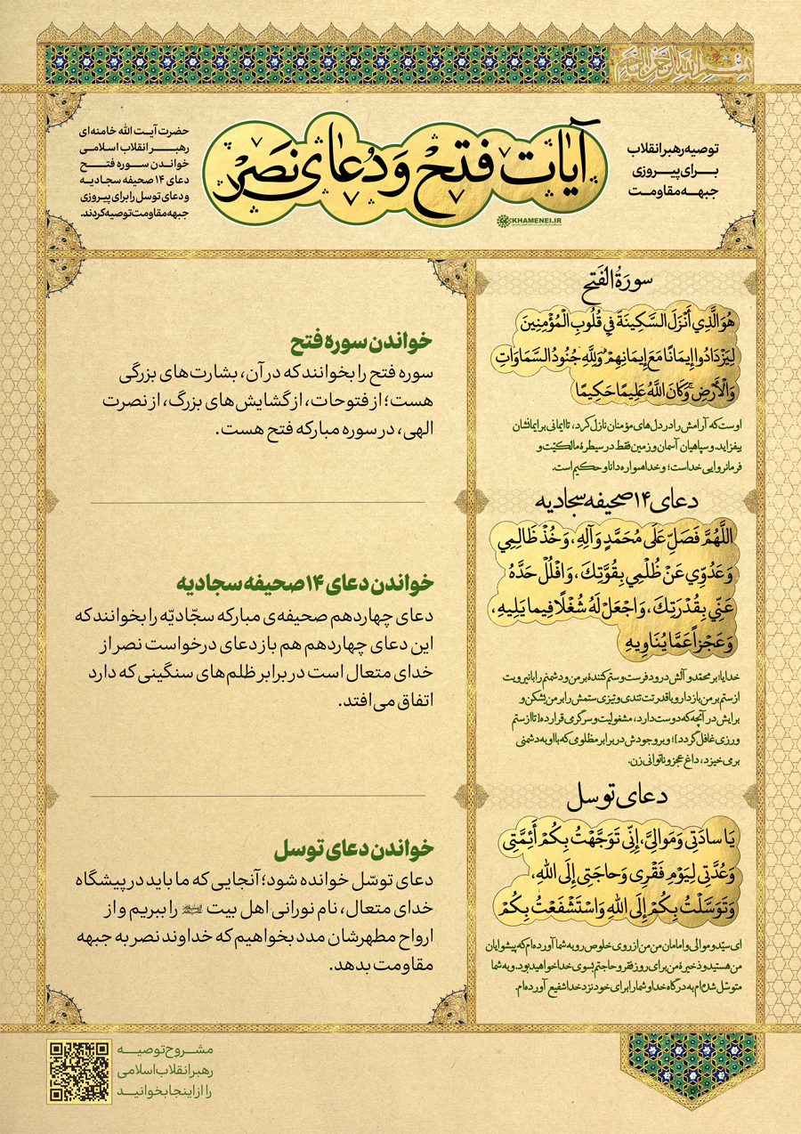 اطلاع نگاشت | آیات فتح و دعای نصر؛ توصیه رهبر انقلاب برای پیروزی جبهه مقاومت حضرت آیتالله خامنهای رهبر انقلاب اسلامی، خواندن سوره فتح، دعای چهاردهم صحیفه سجادیه و دعای توسل را برای موفقیت جبهه مقاومت توصیه کردند.در این