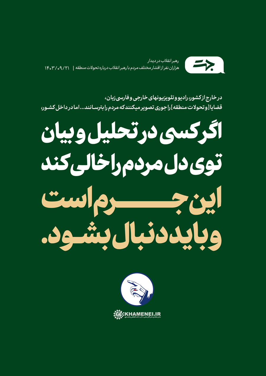 هزاران نفر از اقشار مختلف مردم صبح امروز (چهارشنبه) با حضور در حسینیه امام خمینی(ره) با حضرت آیتالله خامنهای رهبر معظم انقلاب اسلامی دیدار کردند. حضرت آیتالله خامنهای در این دیدار درباره تحولات اخیر منطقه سخنرانی کردند.