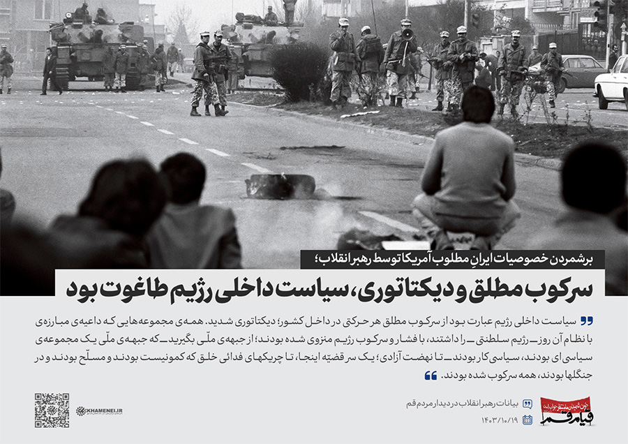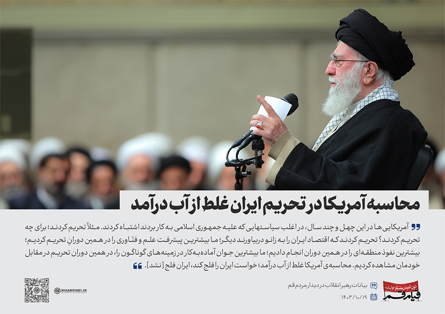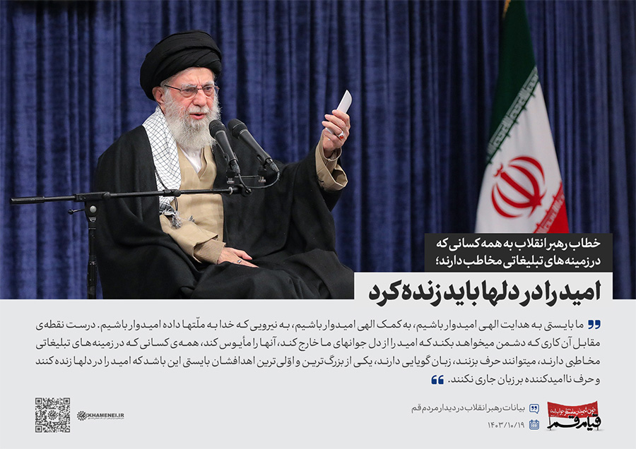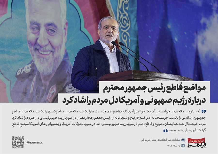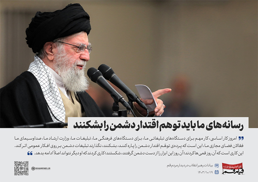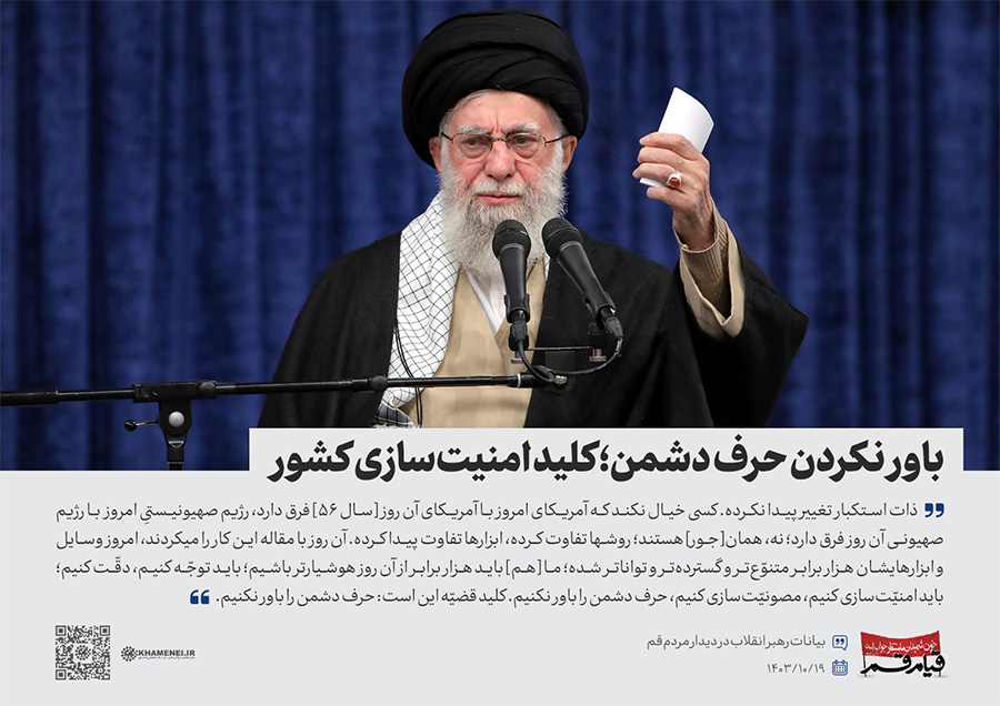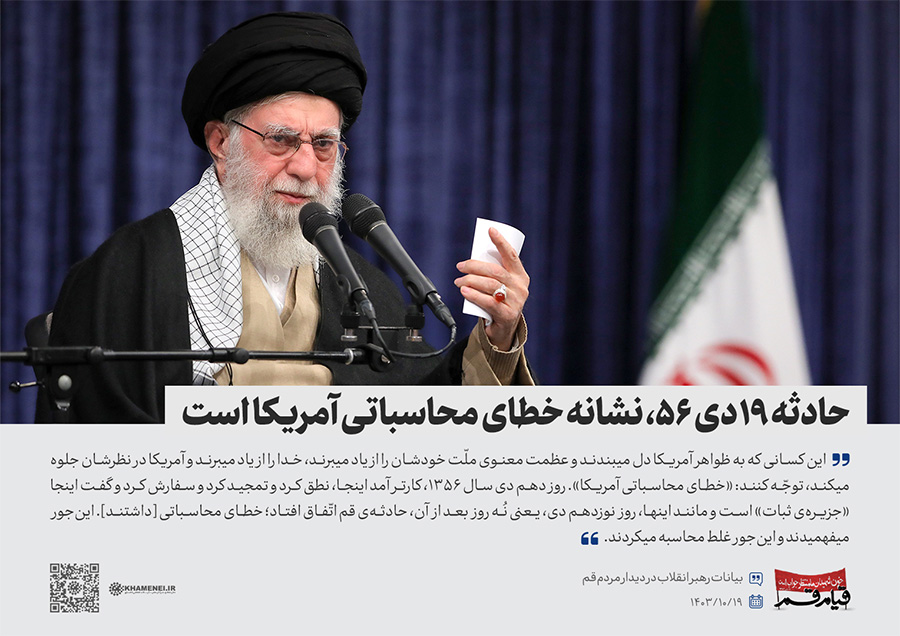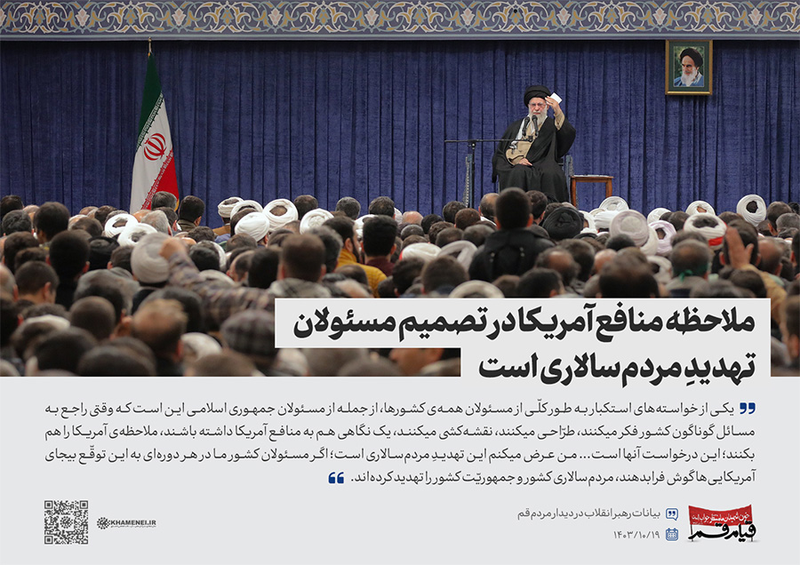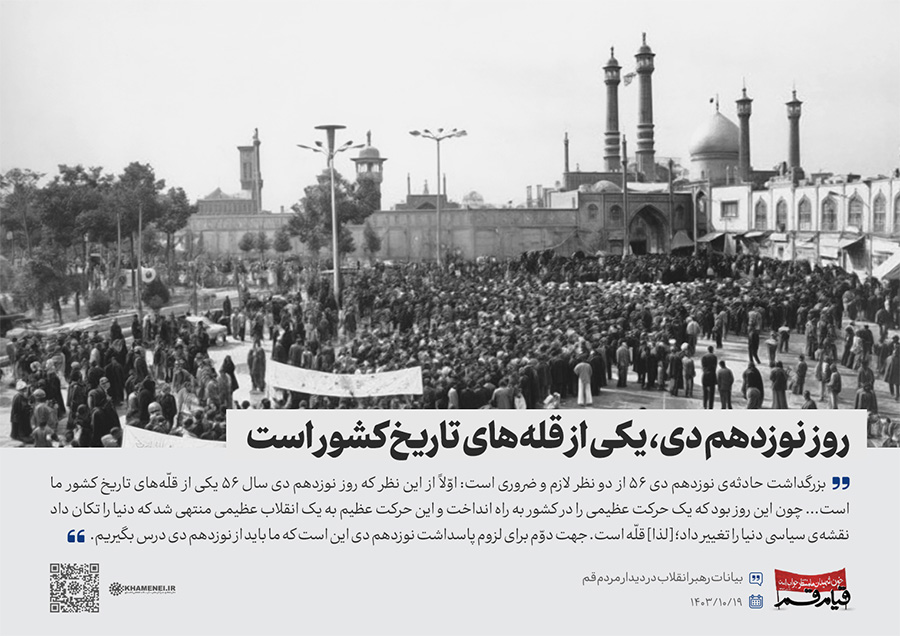 سخننگاشت | دیدار مردم قم به مناسبت سالگرد قیام ۱۹ دی قم در سال ۱۳۵۶ در حمایت از حضرت امام خمینی(ره) علیه رژیم پهلوی، هزاران نفر از اقشار مختلف مردم این شهر، صبح چهارشنبه (۱۴۰۳/۱۰/۱۹) با حضور در حسینیه امام خمینی تهران، با رهبر انقلاب اسلامی دیدار کردند.رسانه KHAMENEI.IR در این مجموعه سخننگاشت مروری بر بیانات رهبر انقلاب داشته است.