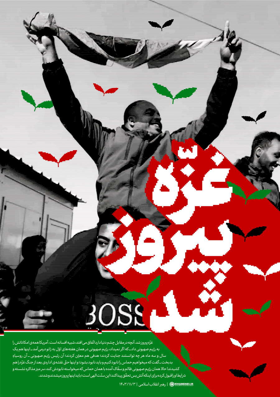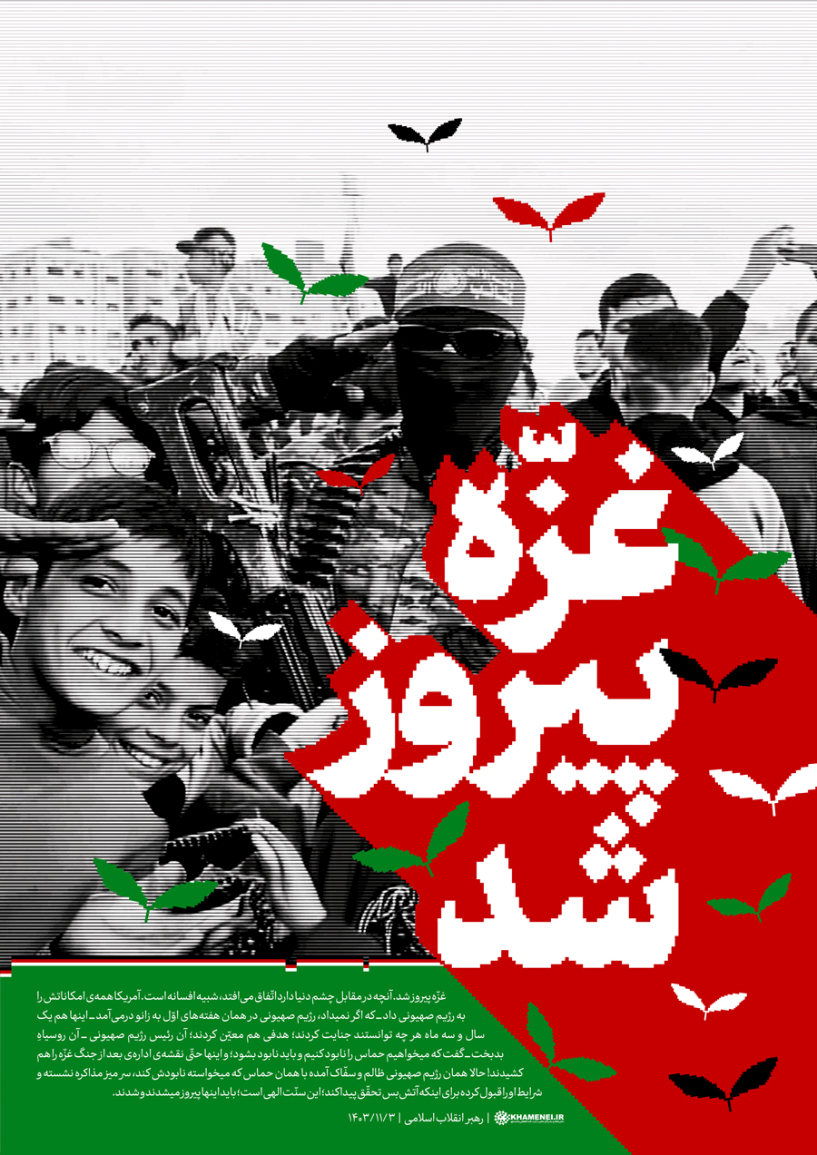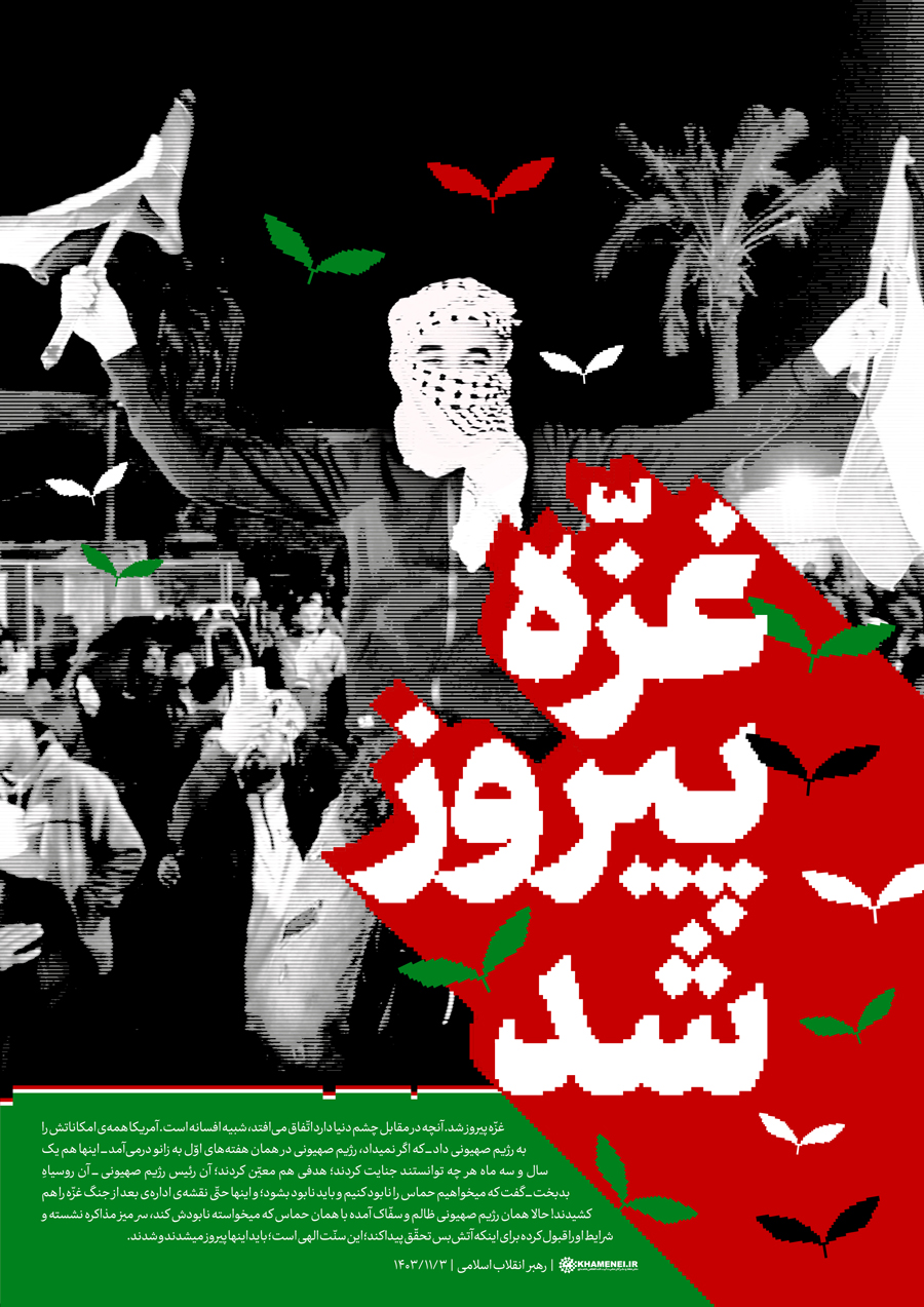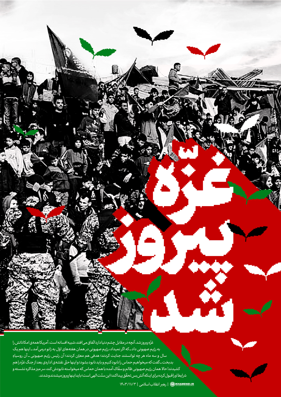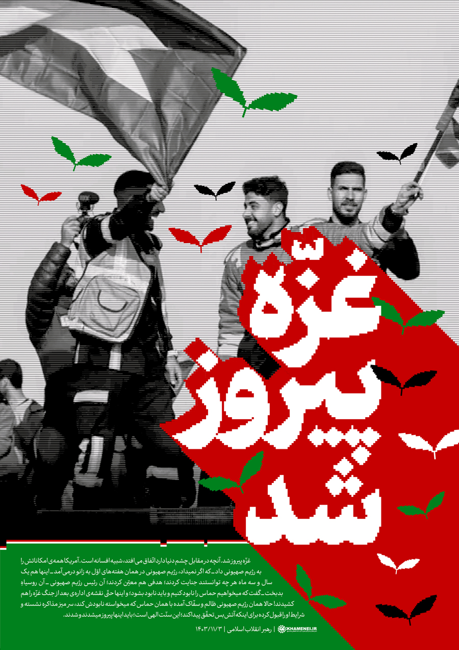 غزه پیروز شد حضرت آیتالله خامنهای: «غزّه پیروز شد. آنچه در مقابل چشم دنیا دارد اتّفاق میافتد، شبیه افسانه است. آمریکا همهی امکاناتش را به رژیم صهیونی داد ــ که اگر نمیداد، رژیم صهیونی در همان هفتههای اوّل به زانو درمیآمد ــ اینها هم یک سال و سه ماه هر چه توانستند جنایت کردند؛ هدفی هم معیّن کردند؛ آن رئیس رژیم صهیونی ــ آن روسیاهِ بدبخت ــ گفت که میخواهیم حماس را نابود کنیم و باید نابود بشود؛ و اینها حتّی نقشهی ادارهی بعد از جنگ غزّه را هم کشیدند! حالا همان رژیم صهیونی ظالم و سفّاک آمده با همان حماس که میخواسته نابودش کند، سر میز مذاکره نشسته و شرایط او را قبول کرده برای اینکه آتشبس تحقّق پیدا کند؛ این سنّت الهی است؛ باید اینها پیروز میشدند و شدند.» ۱۴۰۳/۱۱/۰۳رسانه KHAMENEI.IR براساس این بخش از بیانات رهبر انقلاب، لوح «غزه پیروز شد» را منتشر میکند.