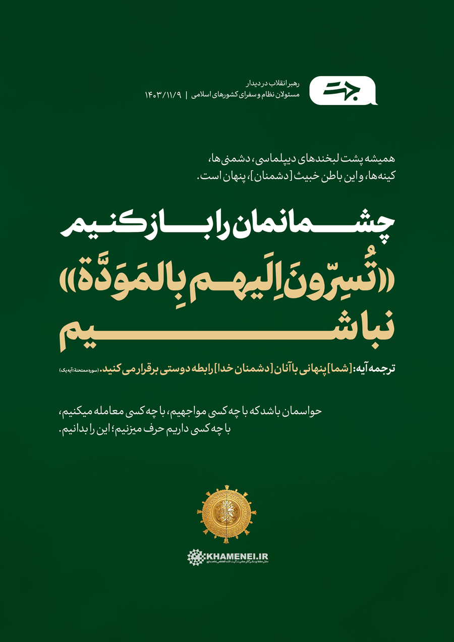 جهت | چشمانمان را باز کنیم «تُسِرّونَ اِلَیهِم بِالمَوَدَّة» نباشیم حضرت آیتالله خامنهای: «همیشه پشت لبخندهای دیپلماسی، دشمنیها، کینهها، و این باطن خبیث [دشمنان]، پنهان است. چشمانمان را باز کنیم... «تُسِرّونَ اِلَیهِم بِالمَوَدَّة» نباشیم (ترجمه آیه: [شما] پنهانى با آنان [دشمنان خدا] رابطه دوستى برقرار مى کنید. (سوره ممتحنة ؛ آیه یک)) حواسمان باشد که با چه کسی مواجهیم، با چه کسی معامله میکنیم، با چه کسی داریم حرف میزنیم؛ این را بدانیم.» ۱۴۰۳/۱۱/۰۹رسانه KHAMENEI.IR در «جهت» مروری بر بیانات رهبر انقلاب اسلامی داشته است.