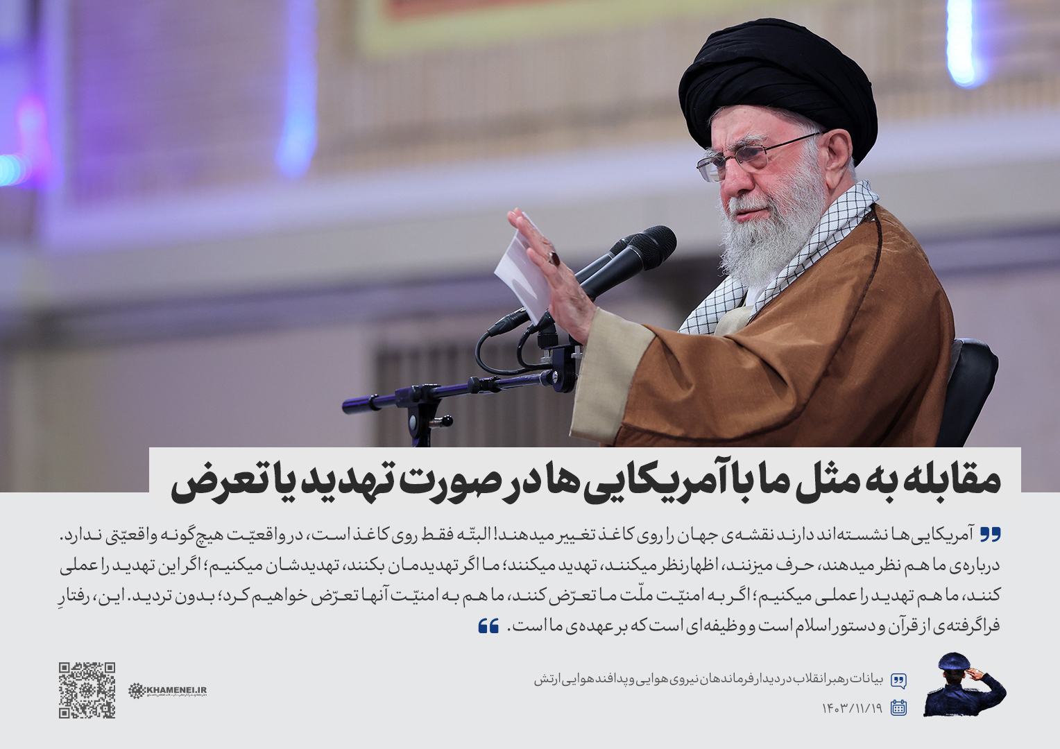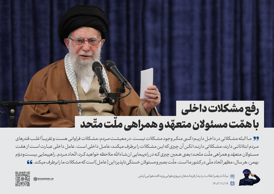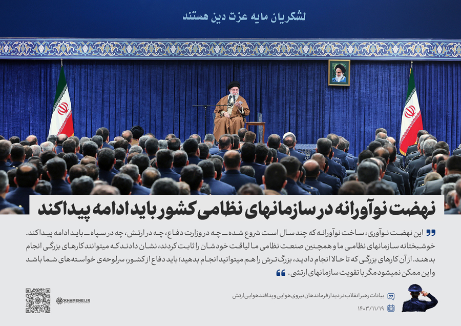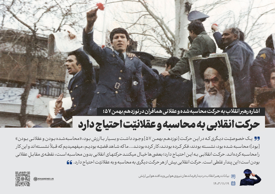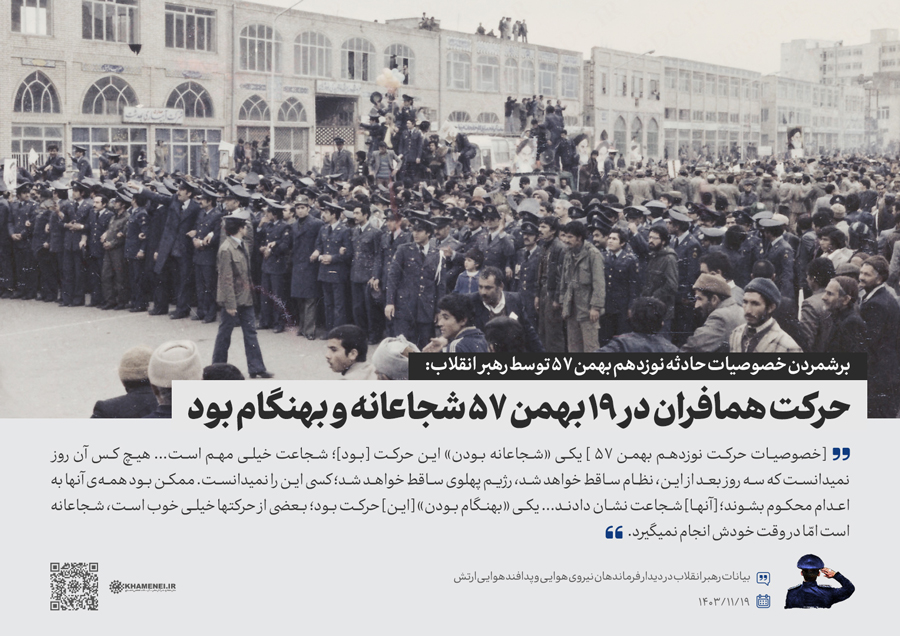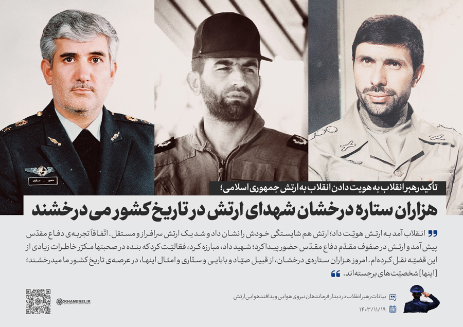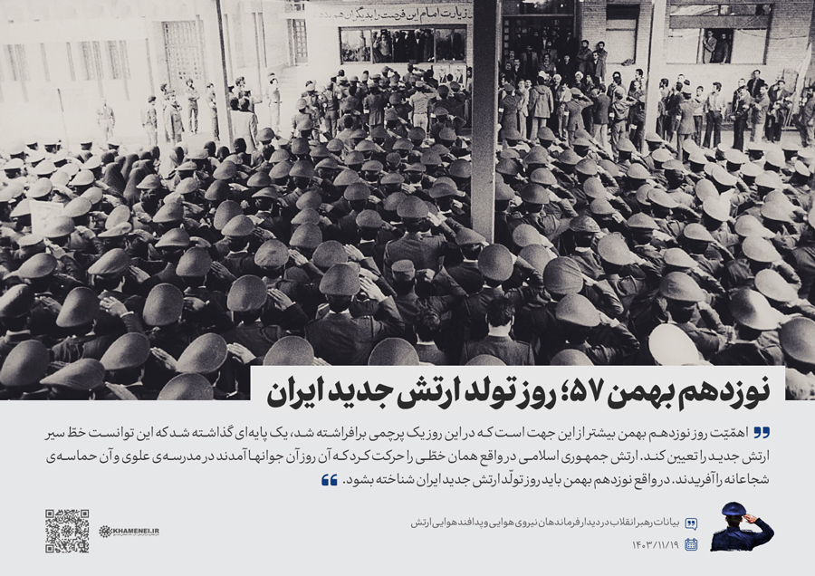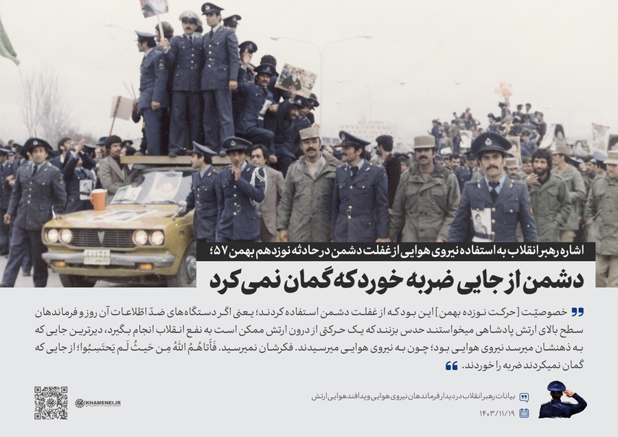 همزمان با دهه فجر و در سالروز بیعت تاریخی جمعی از همافران با حضرت امام خمینی(ره) در ۱۹ بهمن سال ۱۳۵۷، جمعی از فرماندهان و کارکنان نیروی هوایی و پدافند هوایی ارتش جمهوری اسلامی ایران صبح امروز (جمعه) با رهبر انقلاب اسلامی دیدار کردند. رسانه KHAMENEI.IR در این مجموعه سخننگاشت مروری بر بیانات رهبر انقلاب داشته است.