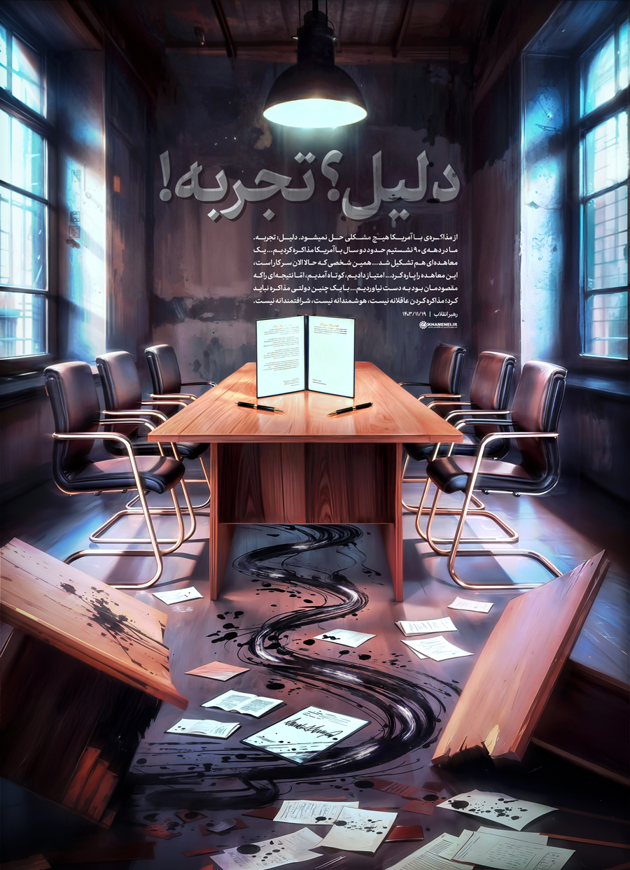 دلیل؟ تجربه! حضرت آیتالله خامنهای: «از مذاکرهی با آمریکا هیچ مشکلی حل نمیشود. دلیل: تجربه. ما در دههی ۹۰ نشستیم حدود دو سال با آمریکا مذاکره کردیم... یک معاهدهای هم تشکیل شد... همین شخصی که حالا الان سر کار است، این معاهده را پاره کرد... امتیاز دادیم، کوتاه آمدیم، امّا نتیجهای را که مقصودمان بود به دست نیاوردیم... با یک چنین دولتی مذاکره نباید کرد؛ مذاکره کردن عاقلانه نیست، هوشمندانه نیست، شرافتمندانه نیست.» ۱۴۰۳/۱۱/۱۹رسانه KHAMENEI.IR براساس این بخش از بیانات رهبر انقلاب، لوح «دلیل؟ تجربه!» را منتشر میکند.