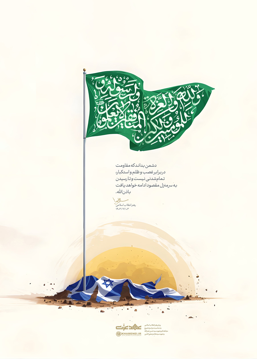 مقاومت تمام شدنی نیست حضرت آیتالله خامنهای: «دشمن بداند که مقاومت در برابر غصب و ظلم و استکبار، تمامشدنی نیست و تا رسیدن به سرمنزل مقصود ادامه خواهد یافت باذناللّه.» ۱۴۰۳/۱۲/۳ رسانه KHAMENEI.IR براساس پیام رهبر انقلاب اسلامی به مناسبت مراسم تشییع مجاهد کبیر شهید سیدحسن نصرالله و شهید سیدهاشم صفیّ الدّین، لوح «مقاومت تمام شدنی نیست» را منتشر میکند.