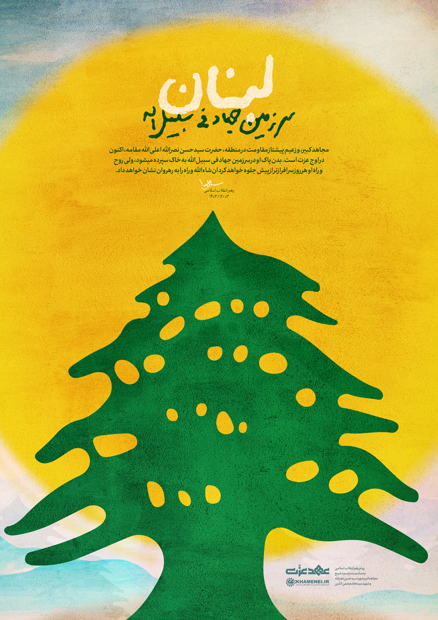 لبنان، سرزمین جهاد فی سبیلالله حضرت آیتالله خامنهای: «مجاهد کبیر، و زعیم پیشتاز مقاومت در منطقه، حضرت سیدحسن نصرالله اعلیالله مقامه، اکنون در اوج عزت است. بدن پاک او در سرزمین جهاد فی سبیلالله به خاک سپرده میشود، ولی روح و راه او هر روز سرافرازتر از پیش جلوه خواهد کرد انشاءالله و راه را به رهروان نشان خواهد داد.» ۱۴۰۳/۱۲/۳رسانه KHAMENEI.IR براساس پیام رهبر انقلاب اسلامی به مناسبت مراسم تشییع مجاهد کبیر شهید سیّدحسن نصرالله و شهید سیّدهاشم صفیّ الدّین، لوح «لبنان، سرزمین جهاد فی سبیلالله» را منتشر میکند.
