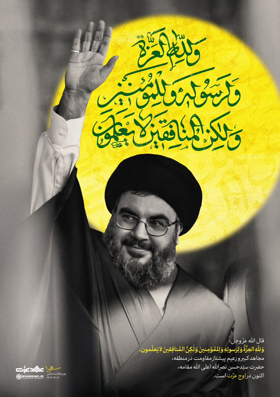 و للّٰه العزة و لرسوله و للمؤمنین حضرت آیتالله خامنهای: «قال اللّه عزّ و جل: وَ لِلّٰهِ العِزَّةُ وَ لِرَسولِهِ وَ لِلمُؤمِنینَ وَ لٰکِنَّ المُنافِقینَ لا یَعلَمون.مجاهد کبیر و زعیم پیشتاز مقاومت در منطقه، حضرت سیّدحسن نصراللّه (اعلی اللّه مقامه)، اکنون در اوج عزّت است.» ۱۴۰۳/۱۲/۳ رسانه KHAMENEI.IR براساس پیام رهبر انقلاب اسلامی به مناسبت مراسم تشییع مجاهد کبیر شهید سیدحسن نصرالله و شهید سیدهاشم صفیّ الدّین، لوح «و للّٰه العزة و لرسوله و للمؤمنین» را منتشر میکند.