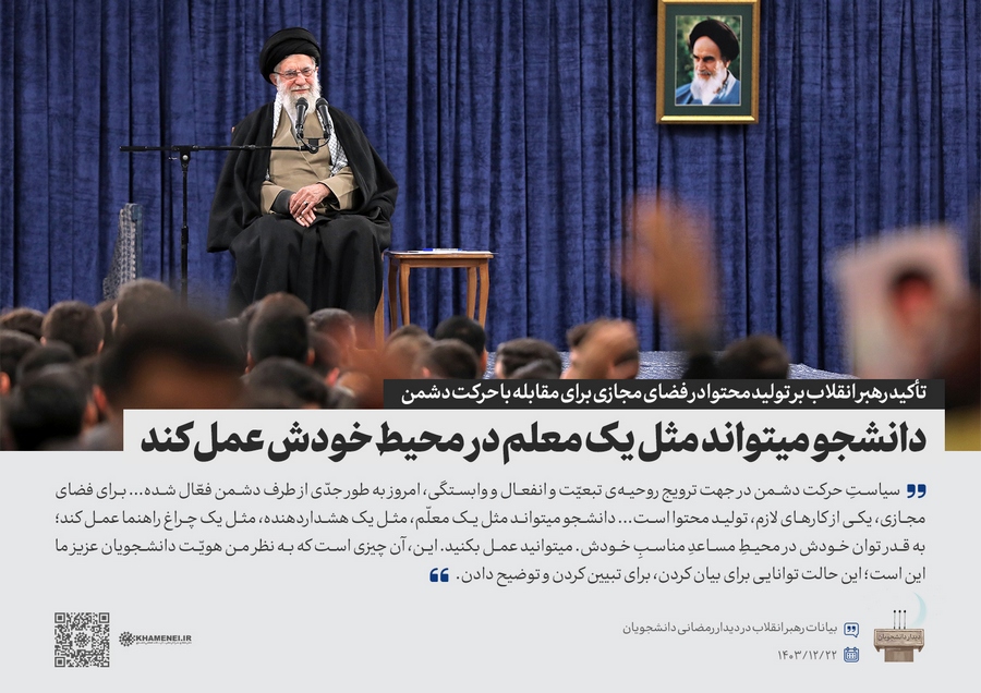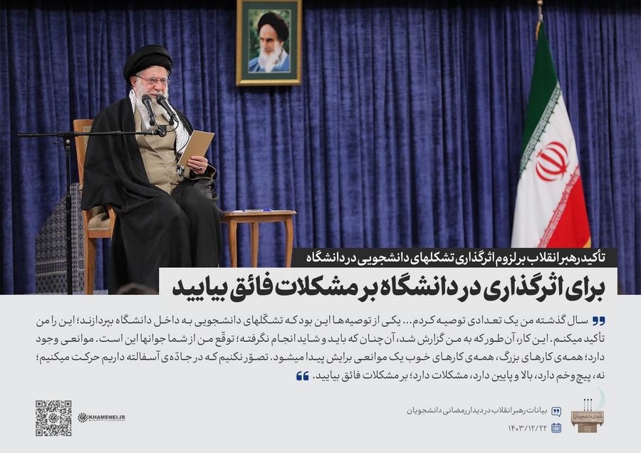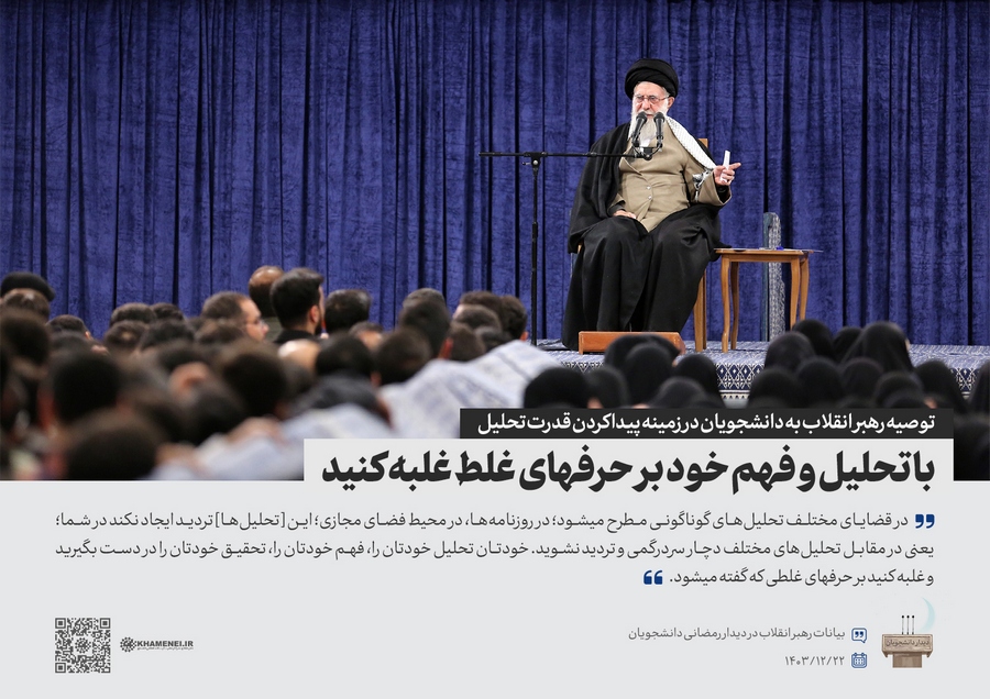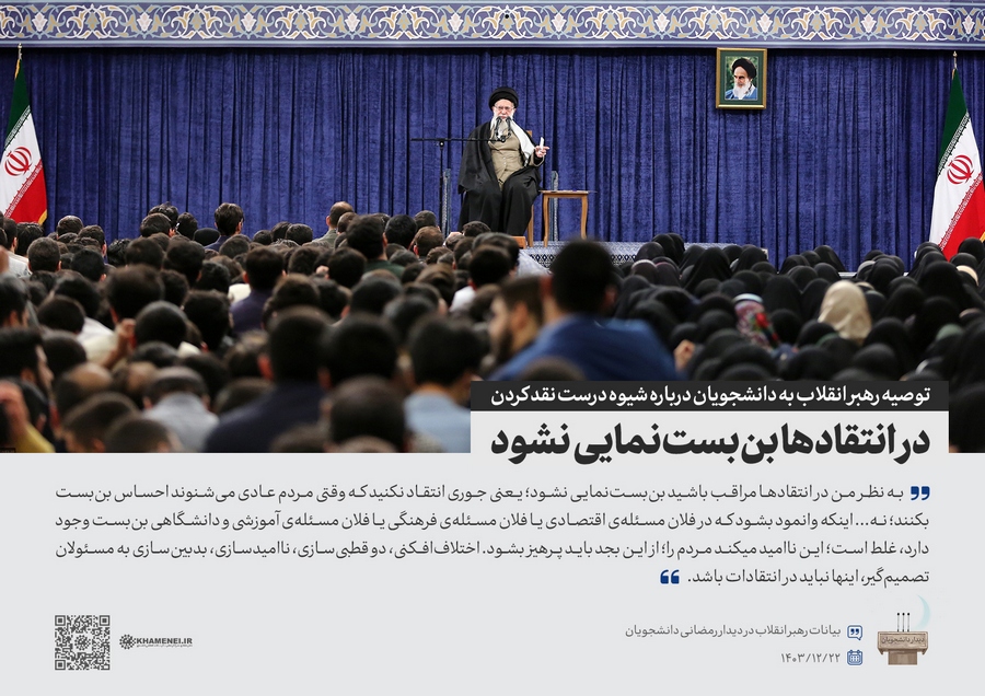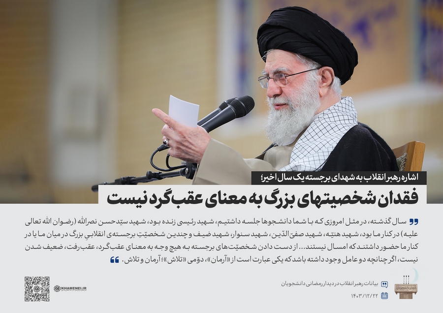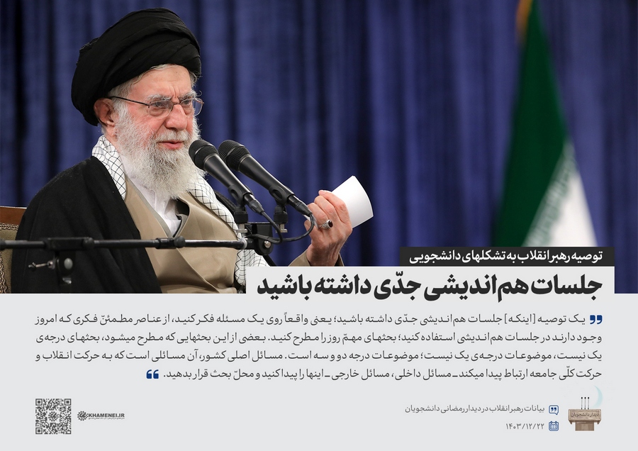 سخننگاشت | دیدار رمضانی دانشجویان جمعی از دانشجویان و فعالان تشکلهای دانشجویی سراسر کشور عصر چهارشنبه (۱۴۰۳/۱۲/۲۲) در یازدهمین روز از ماه مبارک رمضان با حضرت آیتالله خامنهای دیدار کردند.رسانه KHAMENEI.IR در این مجموعه سخننگاشت مروری بر بیانات رهبر انقلاب داشته است. در این