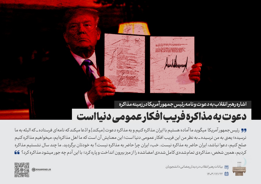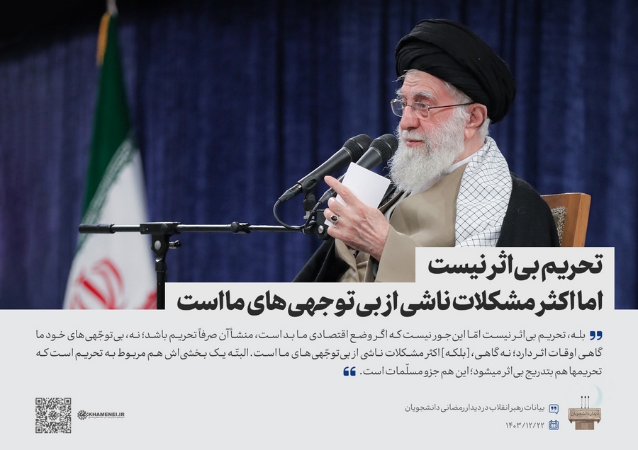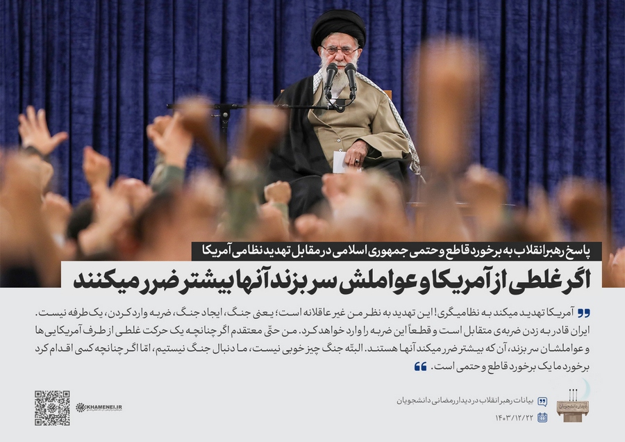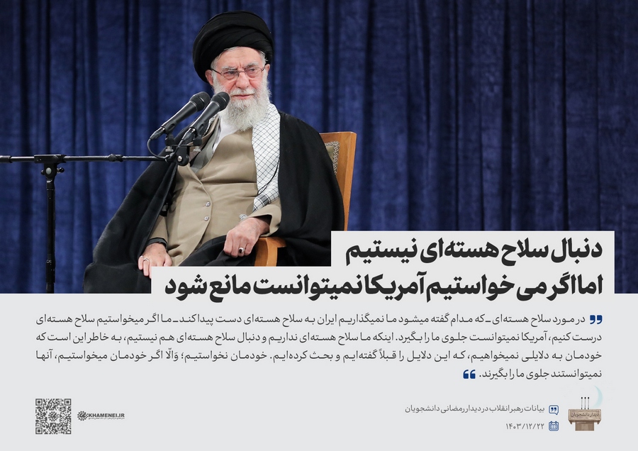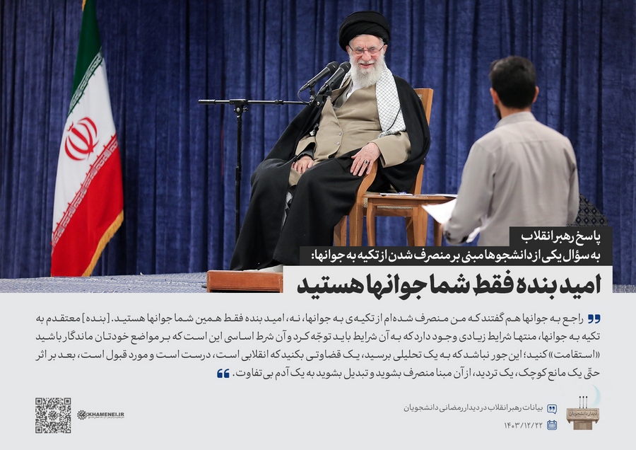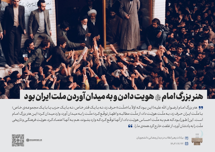 سخننگاشت | دیدار رمضانی دانشجویان جمعی از دانشجویان و فعالان تشکلهای دانشجویی سراسر کشور عصر چهارشنبه (۱۴۰۳/۱۲/۲۲) در یازدهمین روز از ماه مبارک رمضان با حضرت آیتالله خامنهای دیدار کردند.رسانه KHAMENEI.IR در این مجموعه سخننگاشت مروری بر بیانات رهبر انقلاب داشته است. در این