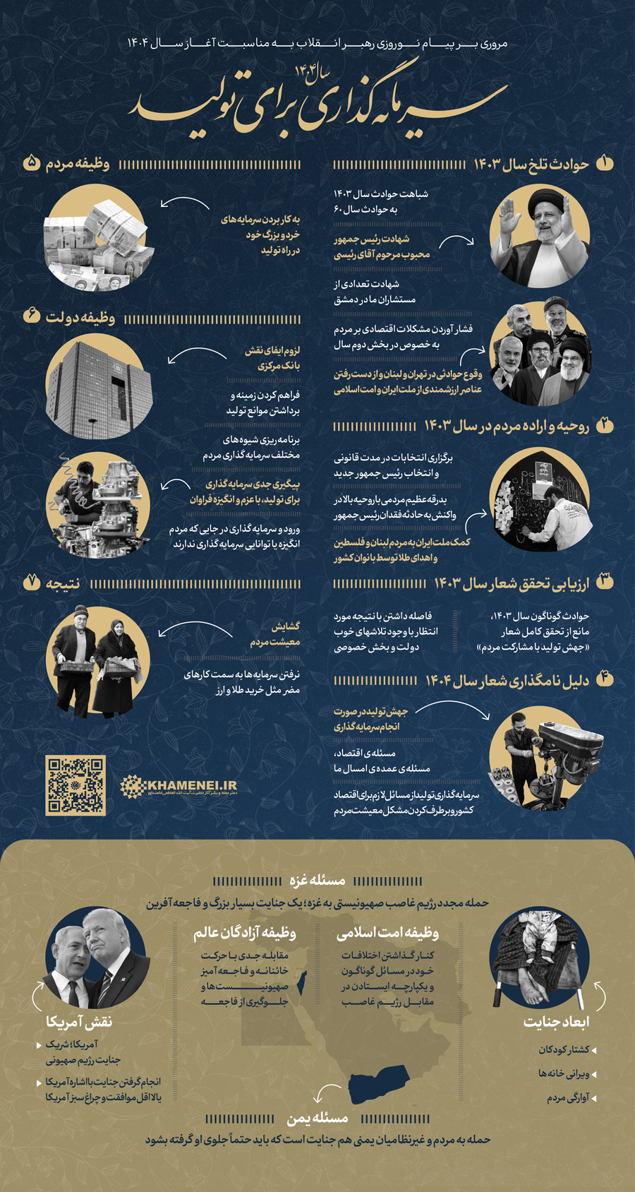 اطلاع نگاشت | سرمایهگذاری برای تولید حضرت آیتالله خامنهای رهبر انقلاب اسلامی در پیامی بهمناسبت آغاز سال ۱۴۰۴، سال جدید را سال «سرمایهگذاری برای تولید» نامگذاری کردند.رسانه KHAMENEI.IR در اطلاعنگاشت «سرمایهگذاری برای تولید» مروری بر پیام نوروزی رهبر انقلاب به مناسبت آغاز سال ۱۴۰۴ داشته است.