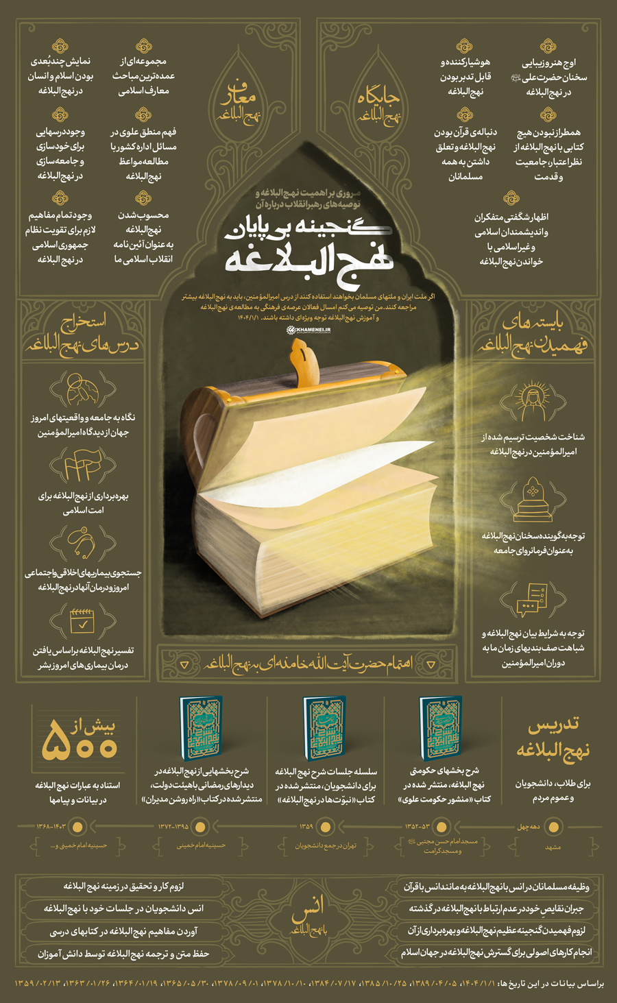 اطلاعنگاشت | گنجینه بیپایان نهجالبلاغه![]() به همین مناسبت رسانهی KHAMENEI.IR مجموعه نکات رهبر انقلاب درباره نهجالبلاغه را در این اطلاعنگاشت مرور کرده است. در این