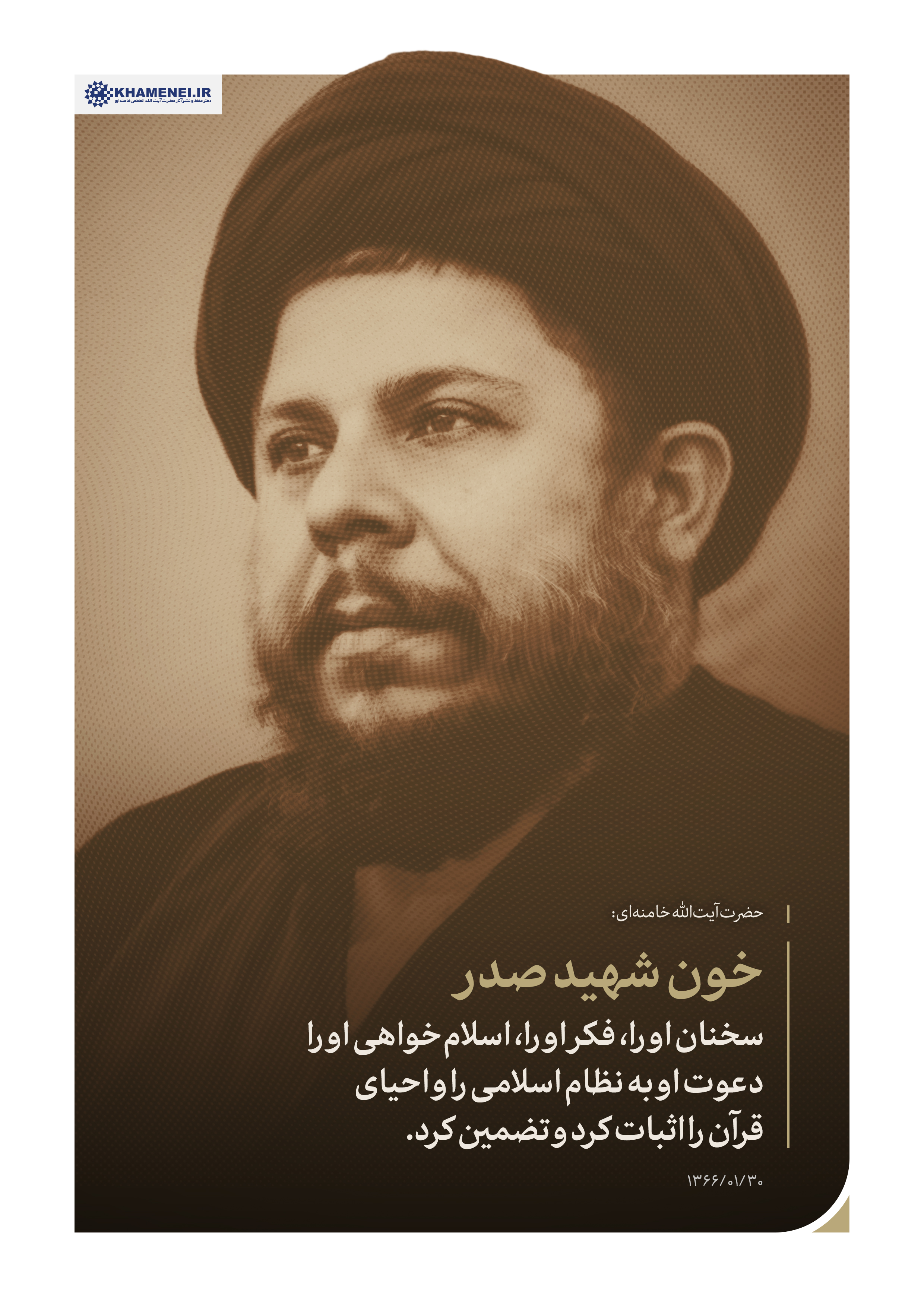 سخننگاشت | شهید صدر؛ نابغه علمی و انقلابی حضرت آیتالله خامنهای: «شهید صدر بیشک یک نابغه و یک ستاره درخشان بود. از جنبه علمی، جامعیت و تحقیق و نوآوری و شجاعت علمی را یکجا دارا بود. در اصول، در فقه، در فلسفه و در هر آنچه با این دانشها ارتباط مییابد در زمره بنیانگذاران و صاحبان مکتب محسوب میشد.» ۱۳۷۹/۱۰/۲۹رسانه KHAMENEI.IR به مناسبت سالروز شهادت شهید آیتالله سیدمحمدباقر صدر، در ۱۹ فروردینماه ۱۳۵۹، مجموعه سخننگاشت «شهید صدر؛ نابغه علمی و انقلابی» را منتشر میکند.