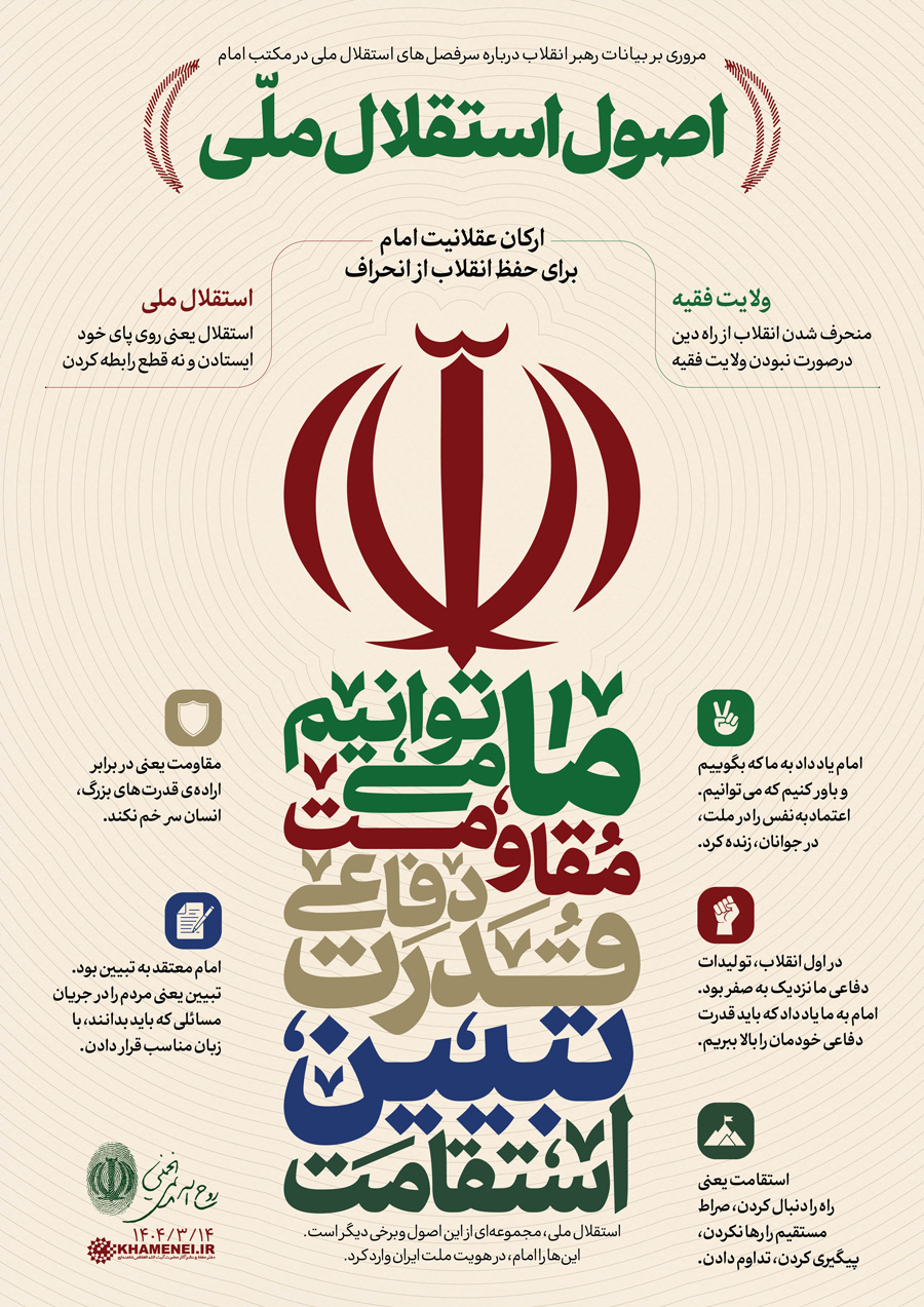اطلاعنگاشت | اصول استقلال ملّی حضرت آیتالله خامنهای: «من آن معنایی را که در ذهن مبارک امام بود و در کلمات ایشان تکرار میشد، در ذیل کلمهی «استقلال ملّی» معرّفی میکنم؛ وقتی فکر میکنم، میبینم هیچ تعبیری مناسبتر از «استقلال ملّی» وجود ندارد... بسیاری از سرفصلهایی که در بیانات امام تکرار شده است و ایشان مکرّر روی آنها تکیه کردند، در ذیل عنوان «استقلال ملّی» میگنجند.» ۱۴۰۴/۰۳/۱۴رسانه KHAMENEI.IR بر همین اساس در اطلاعنگاشت «اصول استقلال ملّی»، مروری بر بیانات رهبر انقلاب درباره سرفصلهای استقلال ملّی در مکتب امام داشته است.