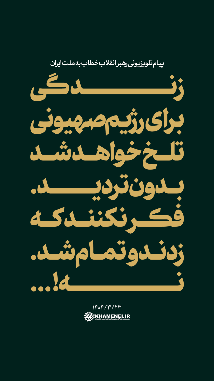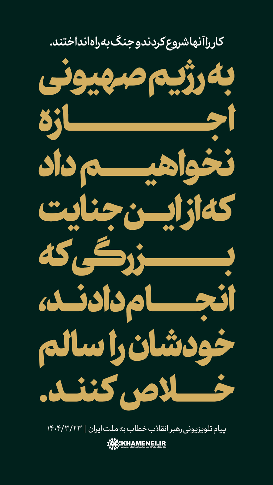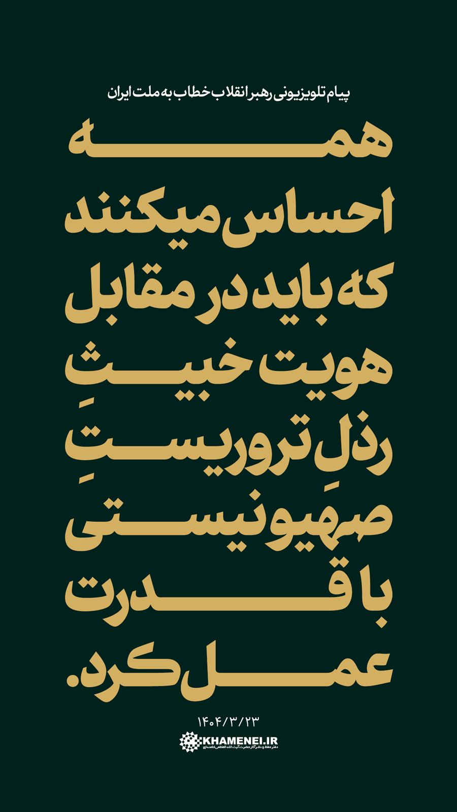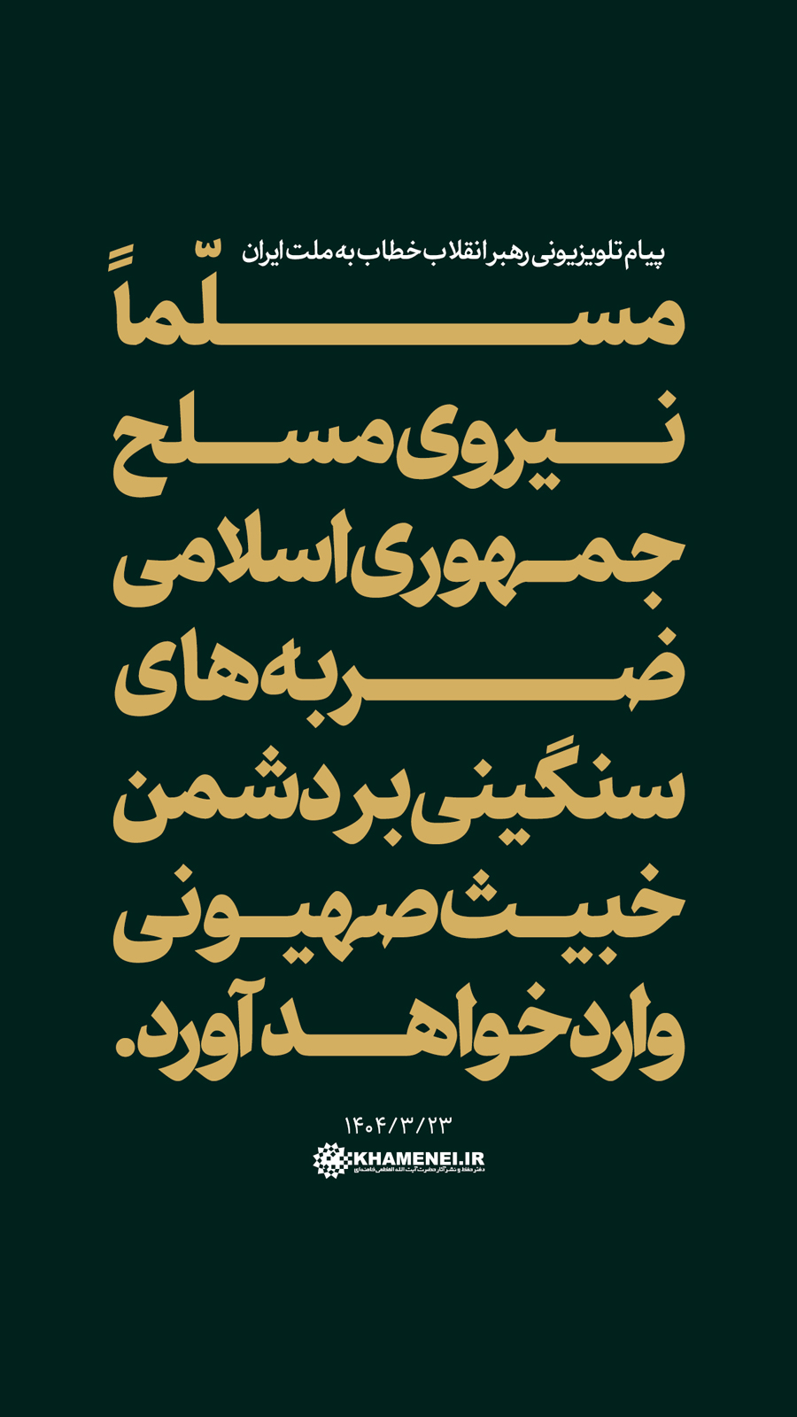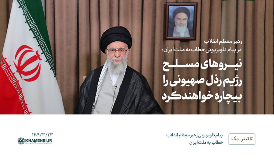 در پی جنایت سحرگاه امروز رژیم صهیونیستی علیه کشور عزیزمان، حضرت آیتالله خامنهای رهبر معظم انقلاب اسلامی امشب در پیامی تلویزیونی خطاب به ملت ایران تأکید کردند: رژیم خبیث و رذل صهیونی دچار خطا و غلطی بزرگ شد که عواقب آن او را بیچاره خواهد کرد. ملت بزرگ ایران مطمئن باشند که نیروهای مسلح به پشتیبانی آنها با قدرت عمل خواهد کرد و ضربههای سنگینی به این رژیم خواهد زد و این رژیم از این خباثت بزرگ، سالم خلاصی نخواهد یافت.