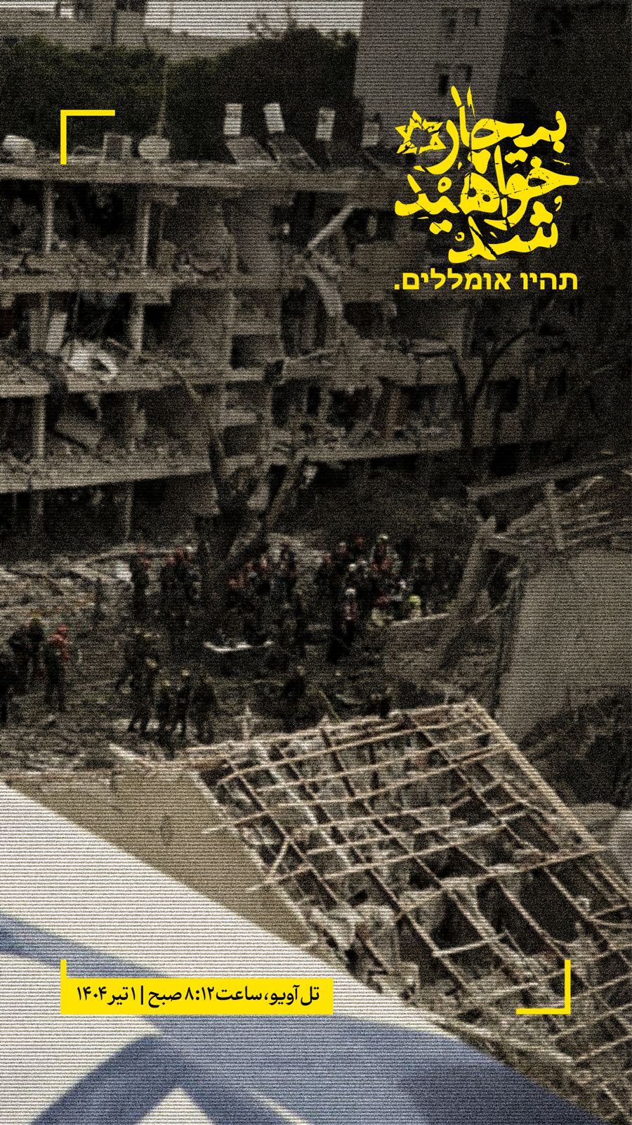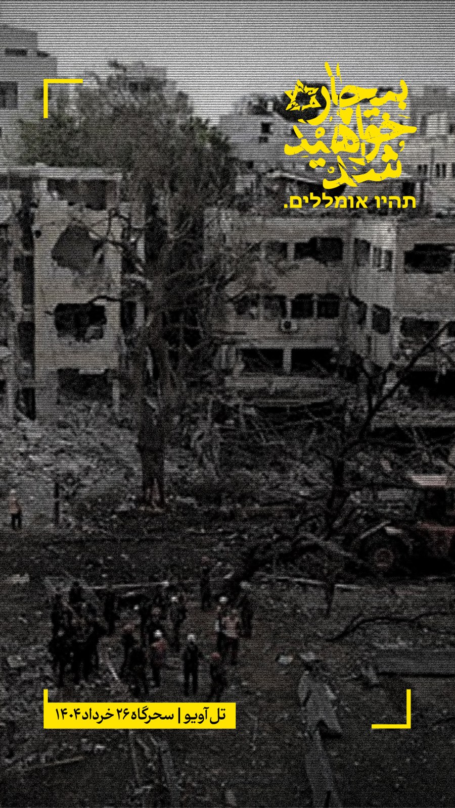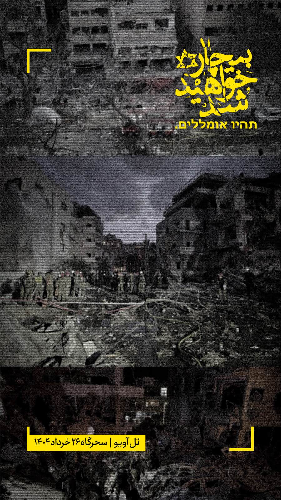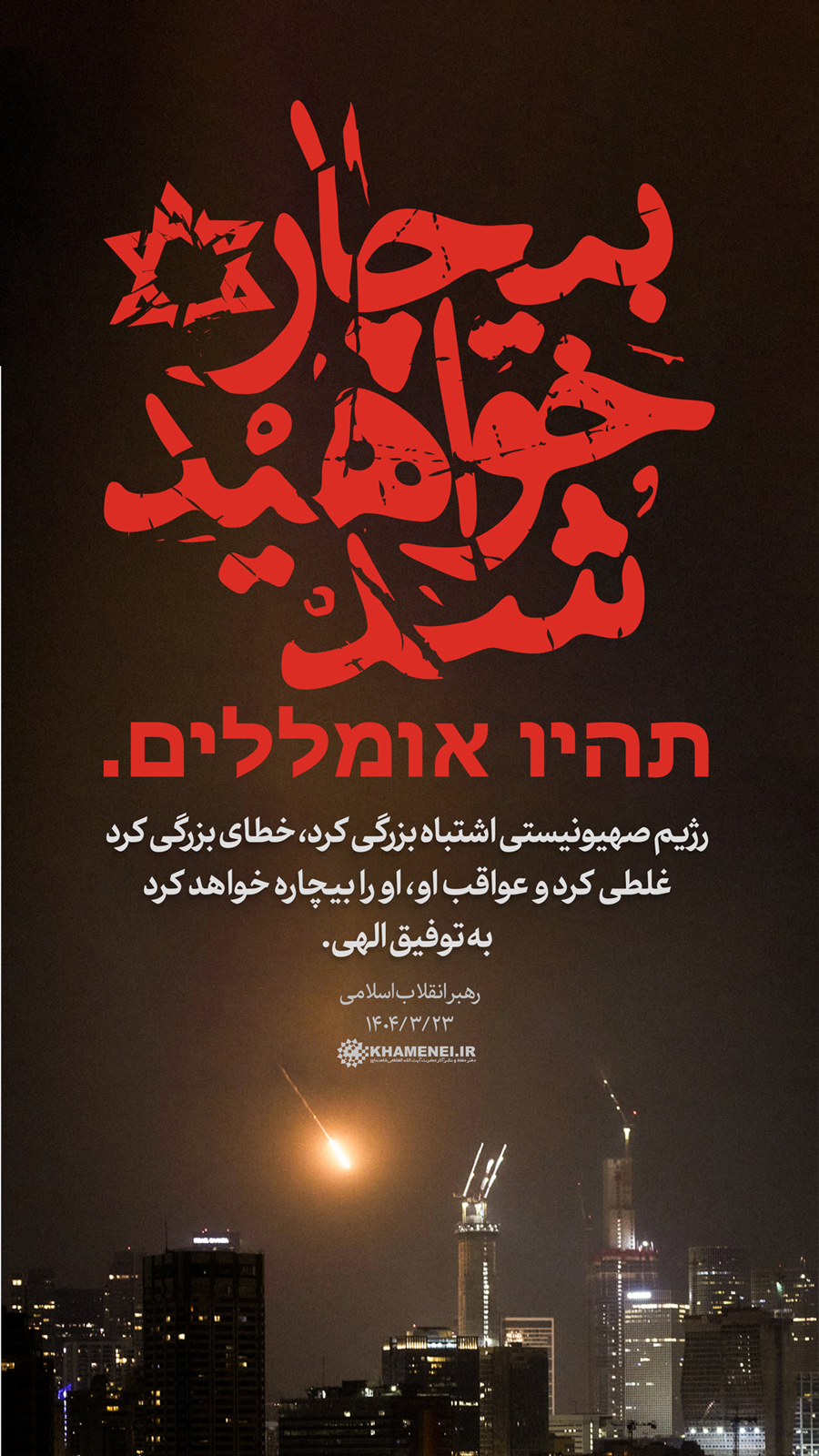 بیچاره خواهید شد | תהיו אומללים حضرت آیتالله خامنهای: «رژیم صهیونیستی اشتباه بزرگی کرد، خطای بزرگی کرد، غلطی کرد و عواقب آن، او را بیچاره خواهد کرد، به توفیق الهی. ملّت ایران از خون شهدای گرانقدر نخواهد گذشت، از تجاوز به آسمان کشورش صرفنظر نخواهد کرد. نیروهای مسلّح ما آماده هستند و مسئولین کشور و همهی آحاد مردم پشت سر نیروهای مسلّحند.» ۱۴۰۴/۰۳/۲۳رسانه KHAMENEI.IR براساس این بخش از پیام تلویزیونی رهبر انقلاب خطاب به ملت ایران، مجموعه لوح «بیچاره خواهید شد | תהיו אומללים» را منتشر میکند. [دریافت نشان] [دریافت تصاویر حساب کاربری]