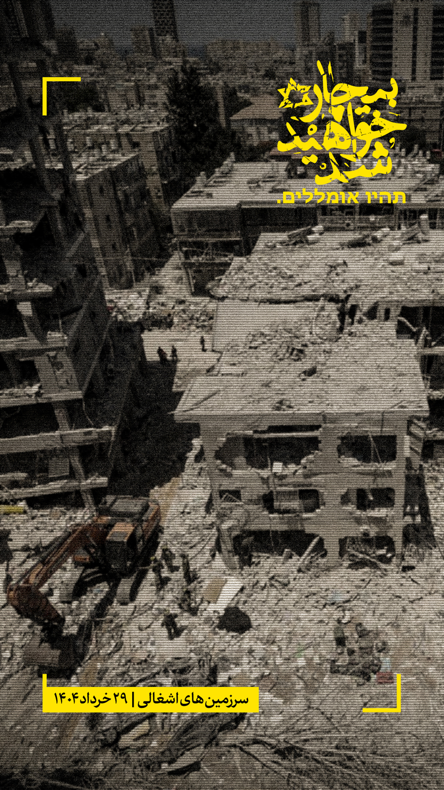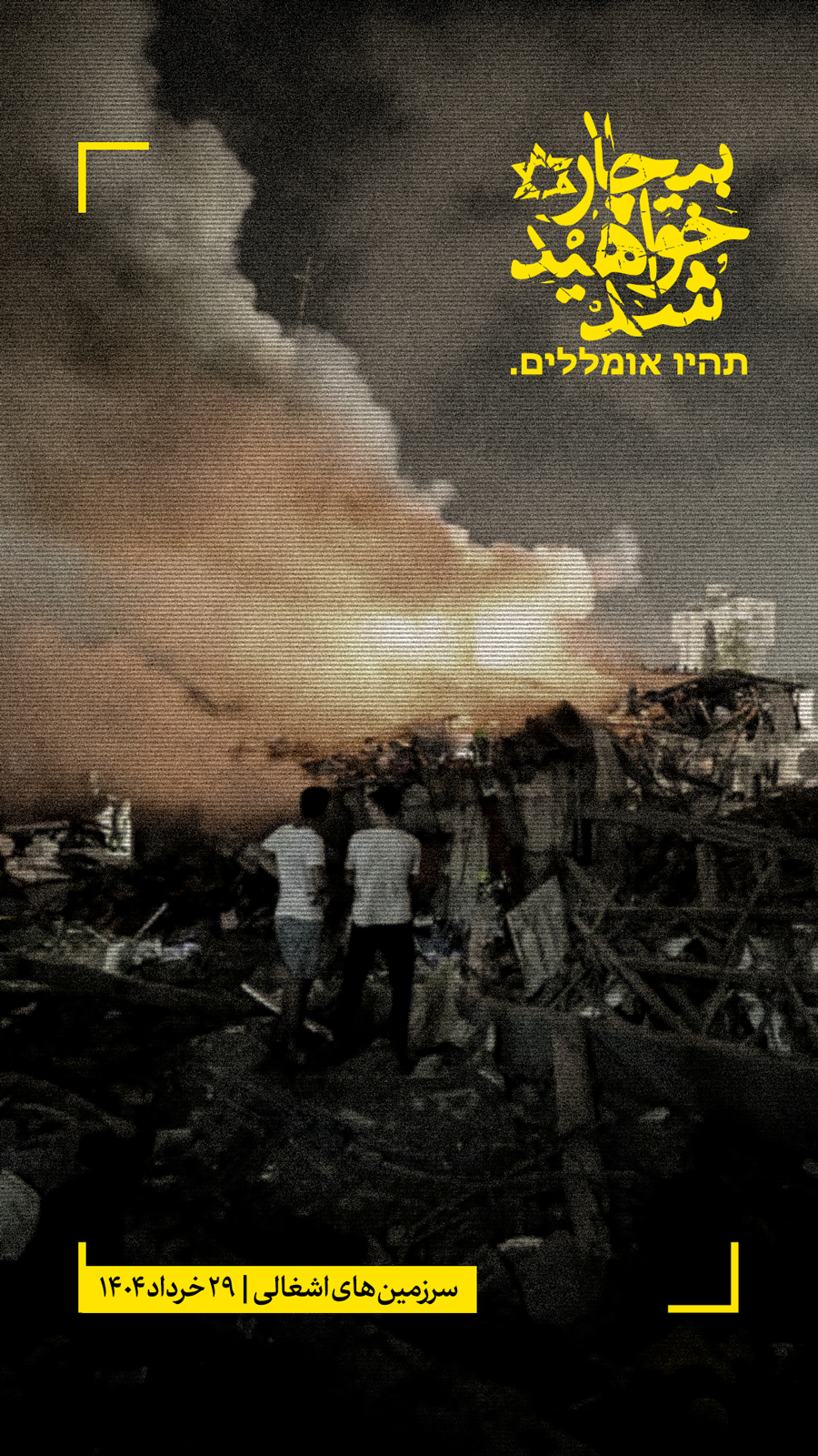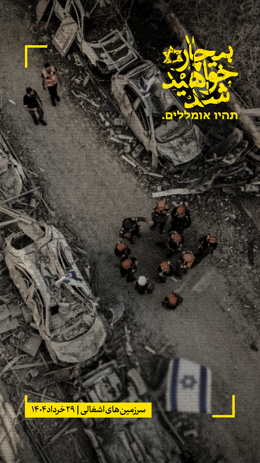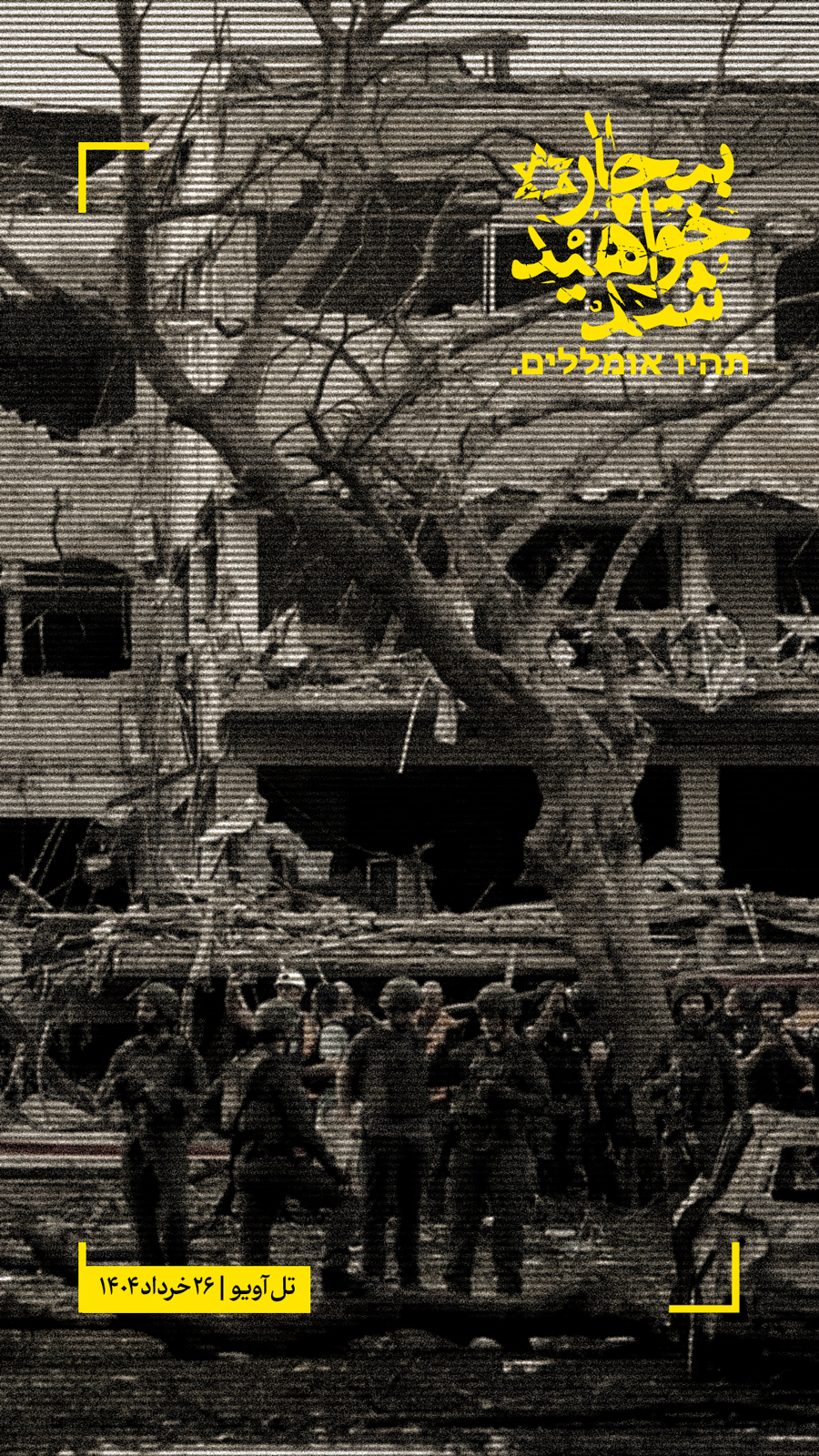 بیچاره خواهید شد | תהיו אומללים حضرت آیتالله خامنهای: «رژیم صهیونیستی اشتباه بزرگی کرد، خطای بزرگی کرد، غلطی کرد و عواقب آن، او را بیچاره خواهد کرد، به توفیق الهی. ملّت ایران از خون شهدای گرانقدر نخواهد گذشت، از تجاوز به آسمان کشورش صرفنظر نخواهد کرد. نیروهای مسلّح ما آماده هستند و مسئولین کشور و همهی آحاد مردم پشت سر نیروهای مسلّحند.» ۱۴۰۴/۰۳/۲۳رسانه KHAMENEI.IR براساس این بخش از پیام تلویزیونی رهبر انقلاب خطاب به ملت ایران، مجموعه لوح «بیچاره خواهید شد | תהיו אומללים» را منتشر میکند. [دریافت نشان] [دریافت تصاویر حساب کاربری]