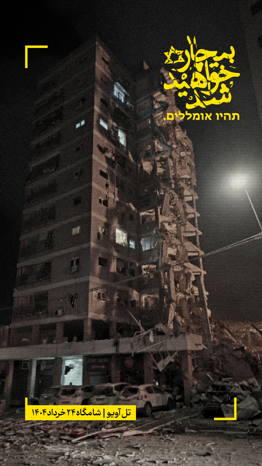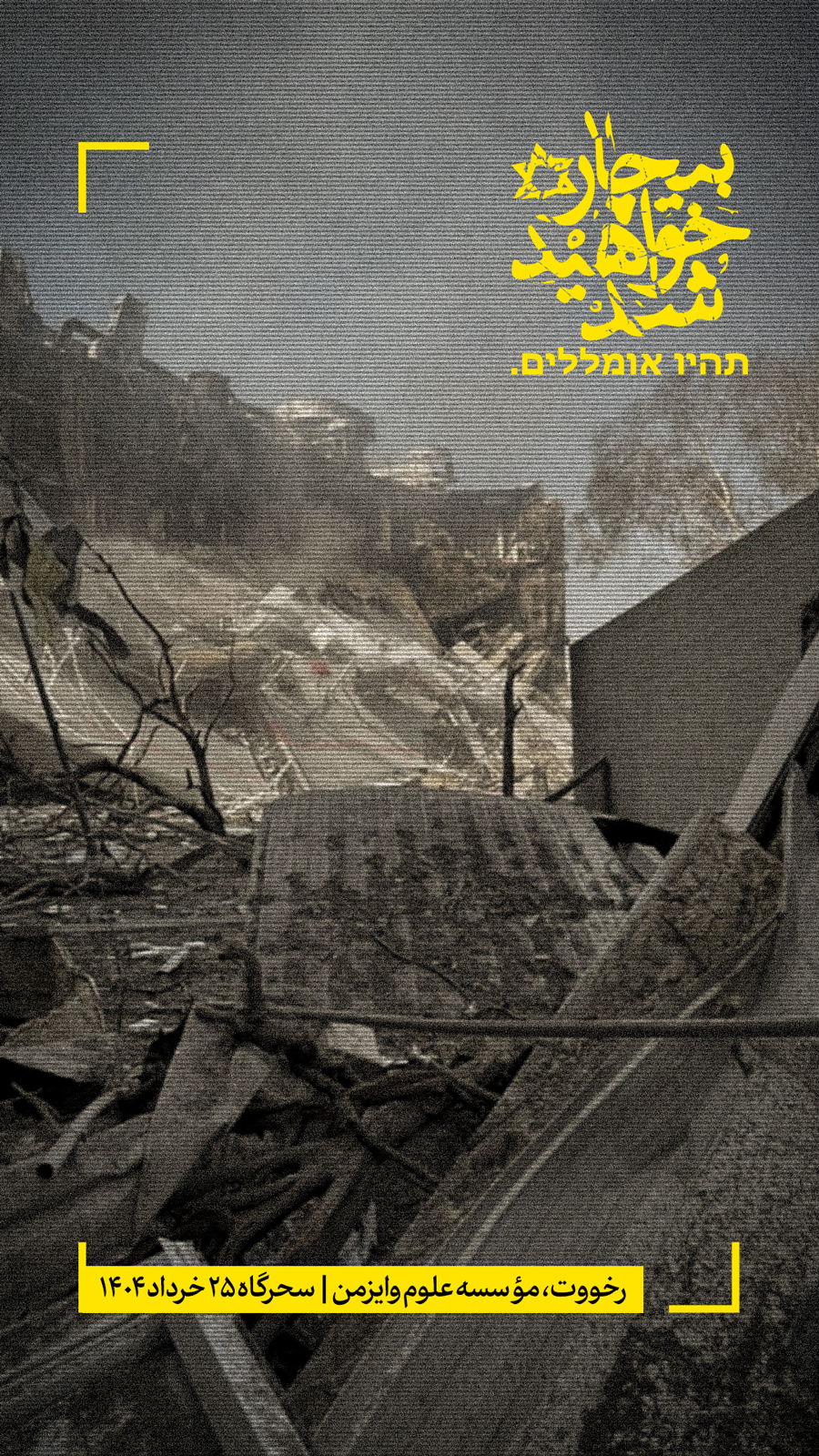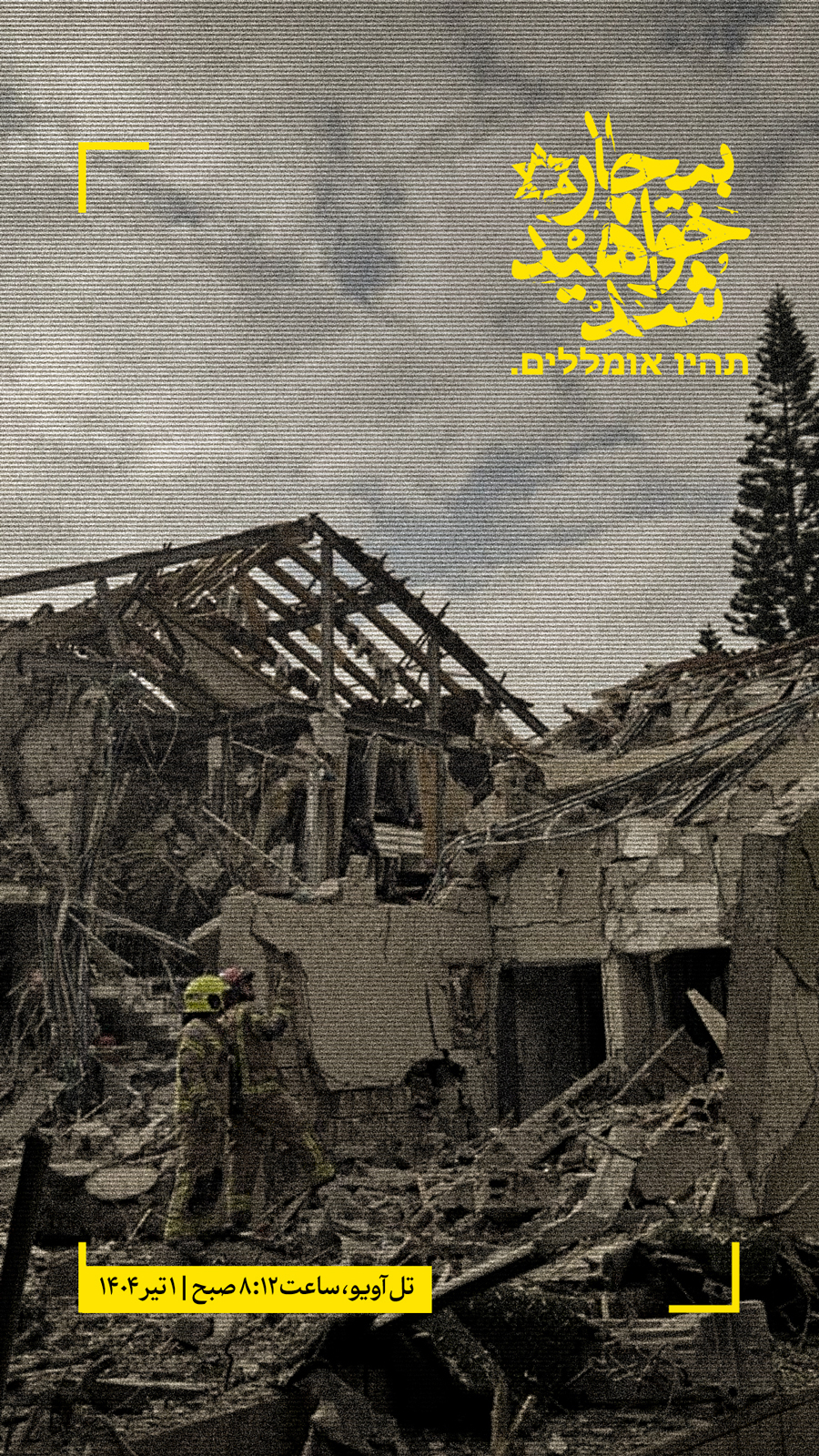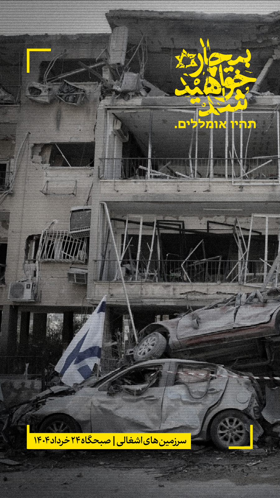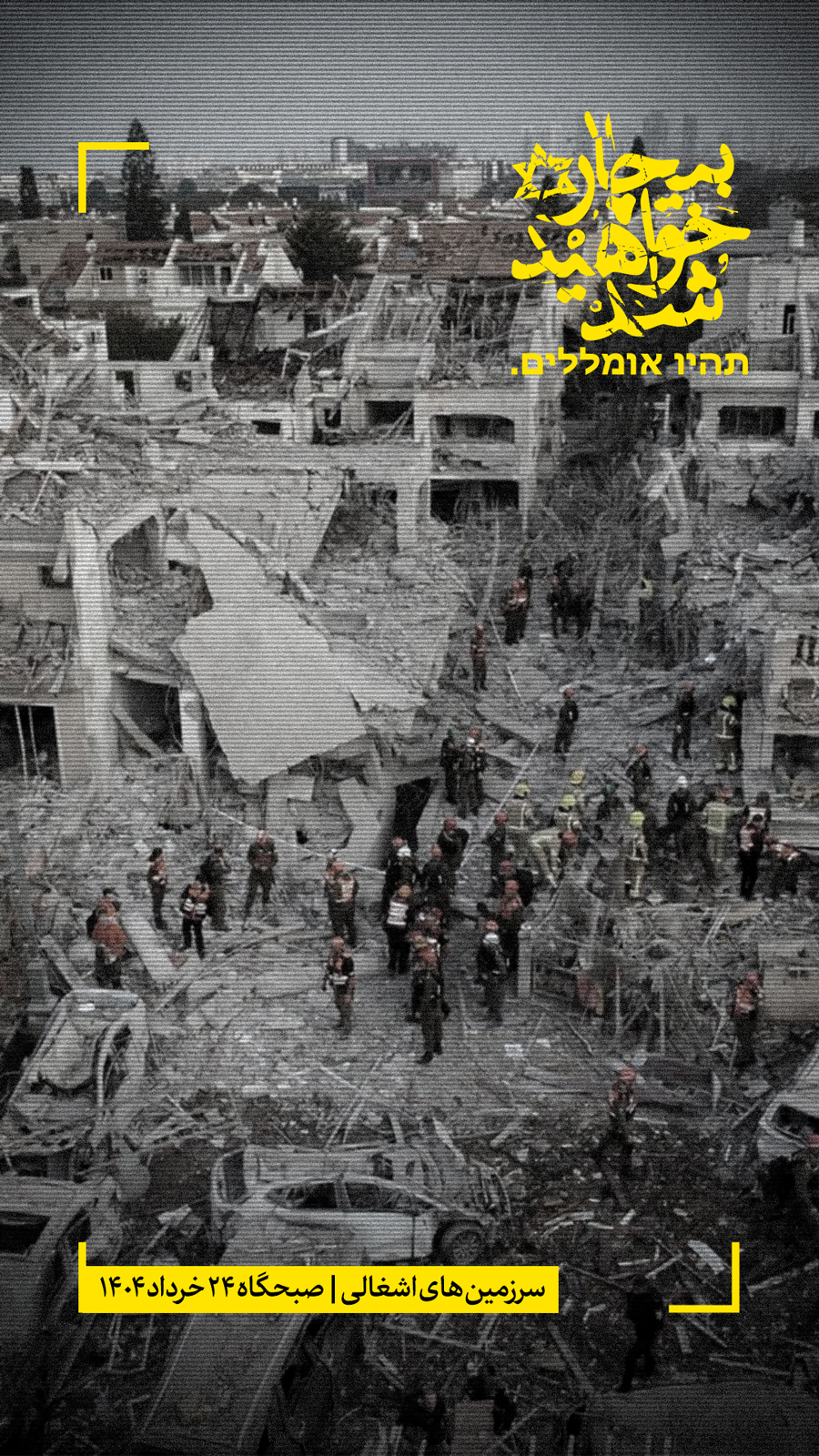 بیچاره خواهید شد | תהיו אומללים حضرت آیتالله خامنهای: «رژیم صهیونیستی اشتباه بزرگی کرد، خطای بزرگی کرد، غلطی کرد و عواقب آن، او را بیچاره خواهد کرد، به توفیق الهی. ملّت ایران از خون شهدای گرانقدر نخواهد گذشت، از تجاوز به آسمان کشورش صرفنظر نخواهد کرد. نیروهای مسلّح ما آماده هستند و مسئولین کشور و همهی آحاد مردم پشت سر نیروهای مسلّحند.» ۱۴۰۴/۰۳/۲۳رسانه KHAMENEI.IR براساس این بخش از پیام تلویزیونی رهبر انقلاب خطاب به ملت ایران، مجموعه لوح «بیچاره خواهید شد | תהיו אומללים» را منتشر میکند. [دریافت نشان] [دریافت تصاویر حساب کاربری]