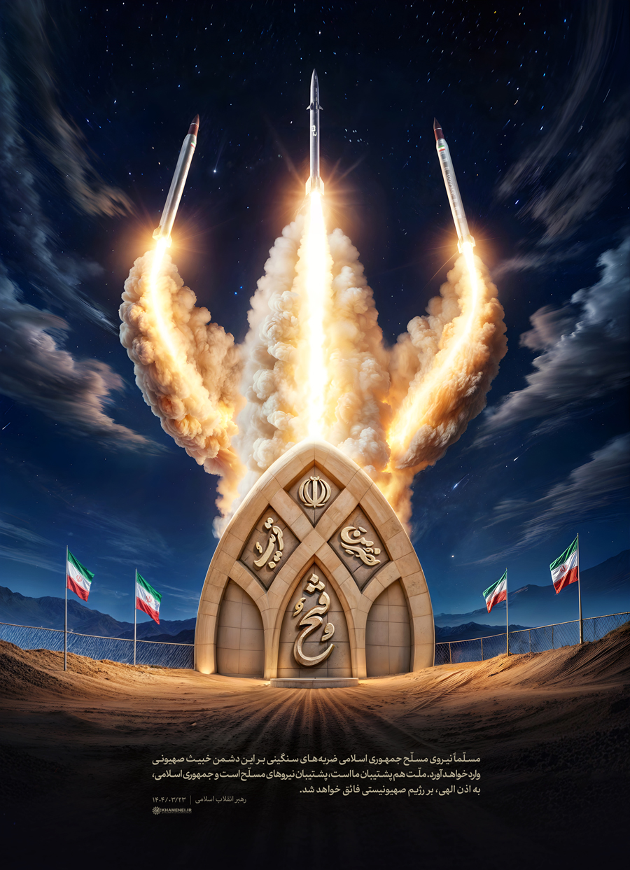 نصر من الله و فتح قریب حضرت آیتالله خامنهای: «مسلّماً نیروی مسلّح جمهوری اسلامی ضربههای سنگینی بر این دشمن خبیث صهیونی وارد خواهد آورد. ملّت هم پشتیبان ما است، پشتیبان نیروهای مسلّح است و جمهوری اسلامی، به اذن الهی، بر رژیم صهیونیستی فائق خواهد شد.» ۱۴۰۴/۰۳/۲۳رسانه KHAMENEI.IR براساس این بخش از پیام تلویزیونی رهبر انقلاب خطاب به ملت ایران، لوح «نصر من الله و فتح قریب» را منتشر میکند.