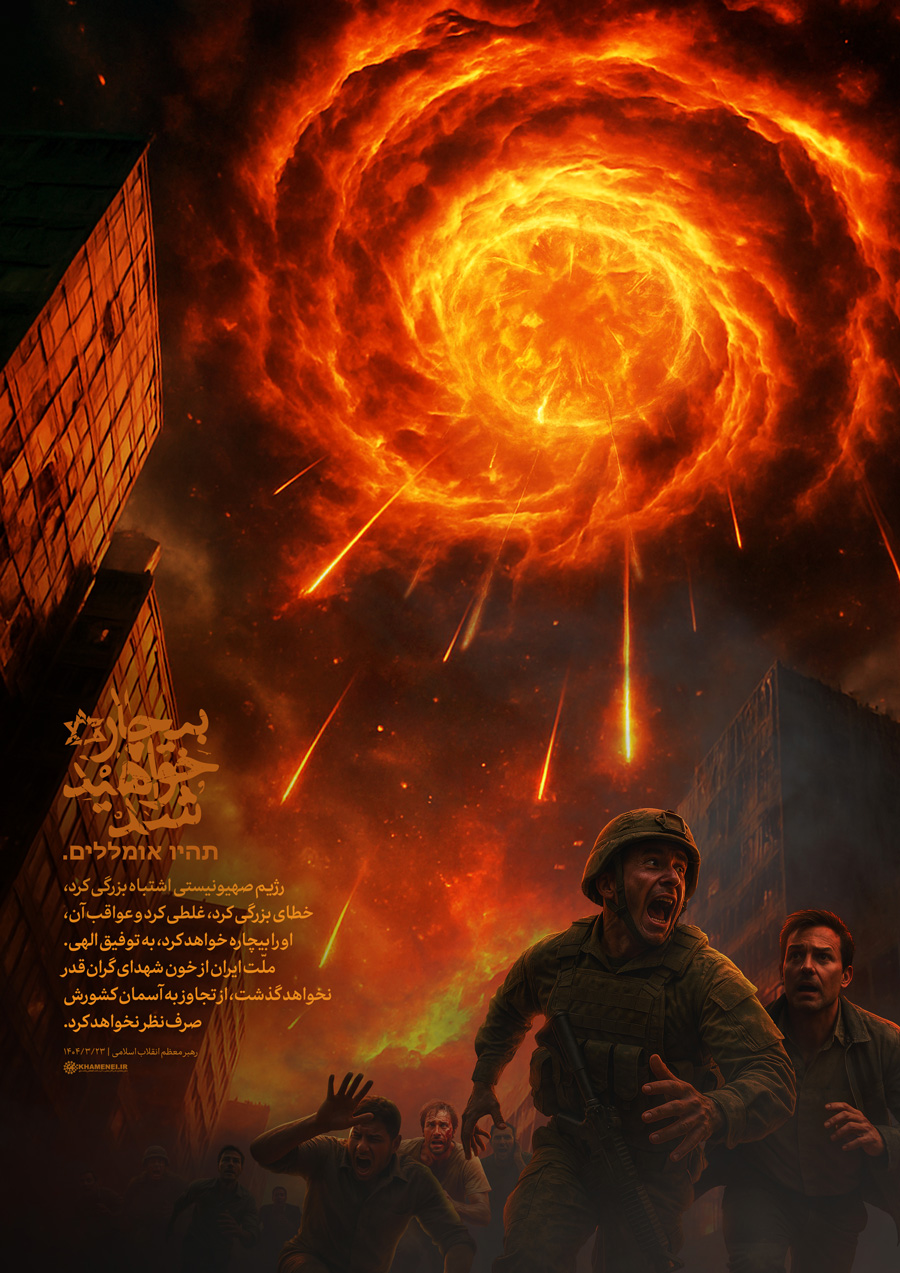 دروازهی جهنم... حضرت آیتالله خامنهای: «رژیم صهیونیستی اشتباه بزرگی کرد، خطای بزرگی کرد، غلطی کرد و عواقب آن، او را بیچاره خواهد کرد، به توفیق الهی. ملّت ایران از خون شهدای گرانقدر نخواهد گذشت، از تجاوز به آسمان کشورش صرفنظر نخواهد کرد.» ۱۴۰۴/۰۳/۲۳رسانه KHAMENEI.IR براساس این بخش از نخستین پیام تلویزیونی رهبر انقلاب خطاب به ملت ایران، لوح «دروازهی جهنم» را منتشر میکند.