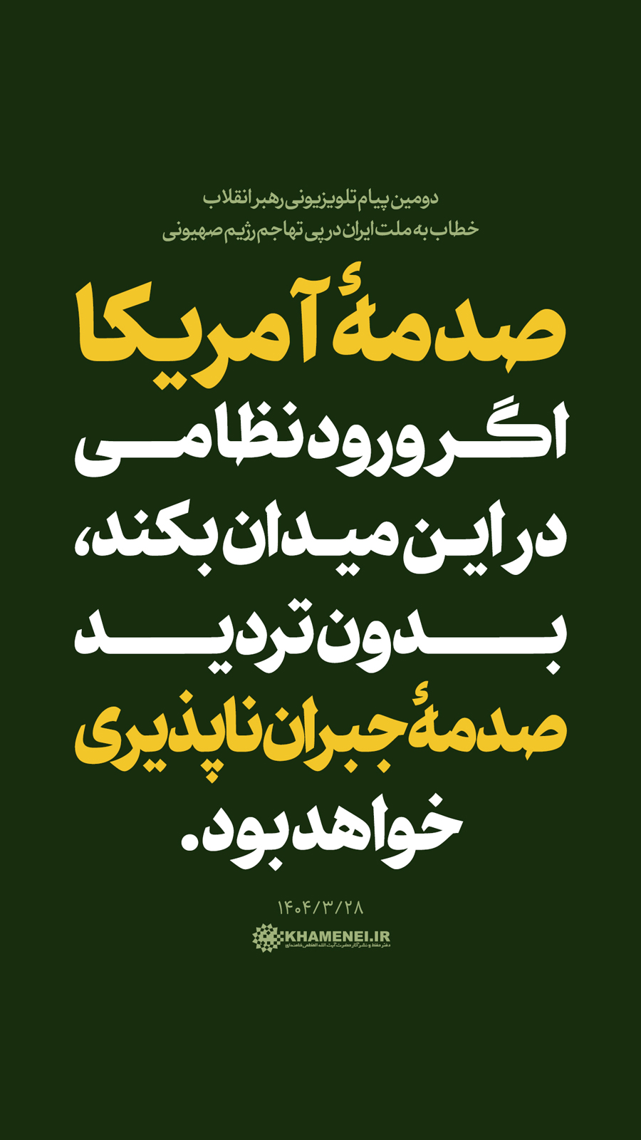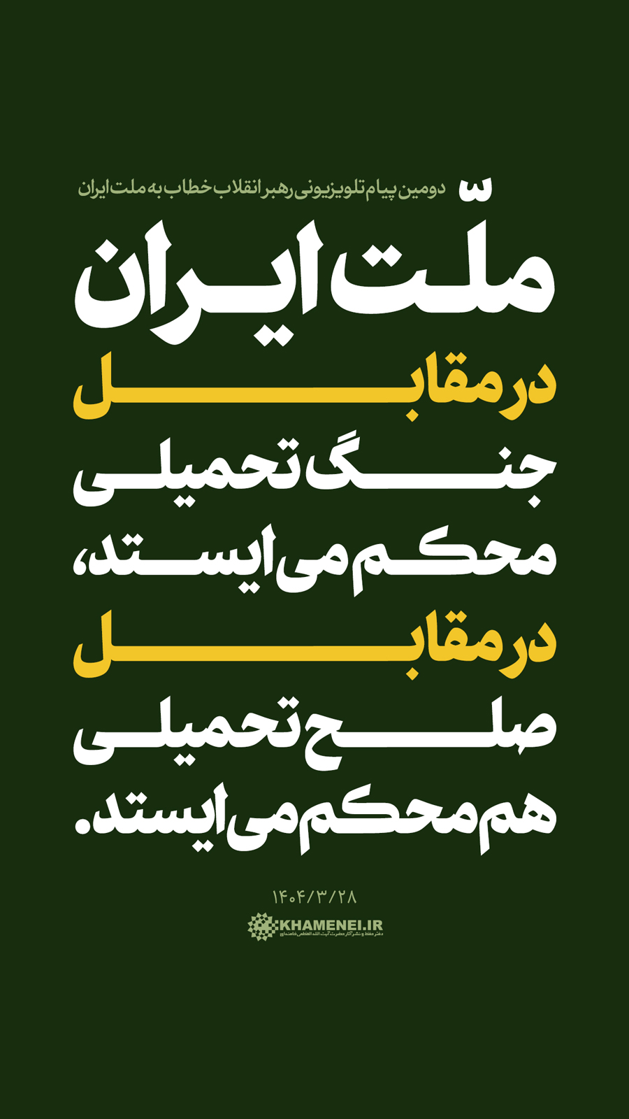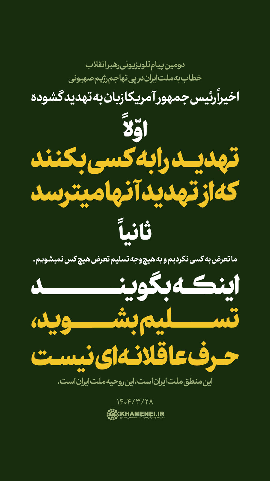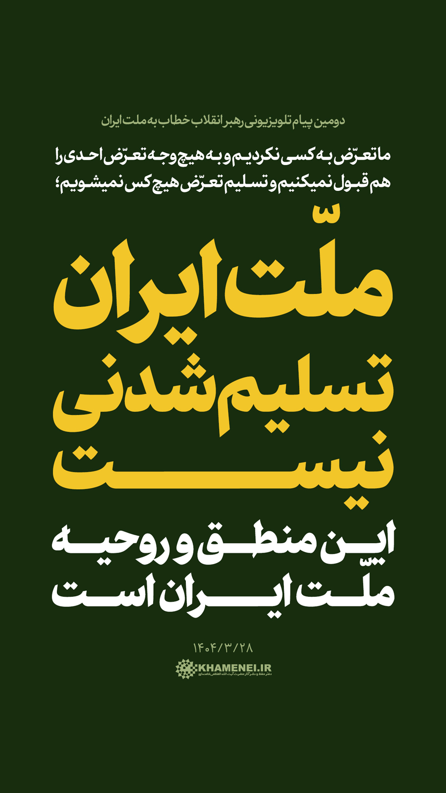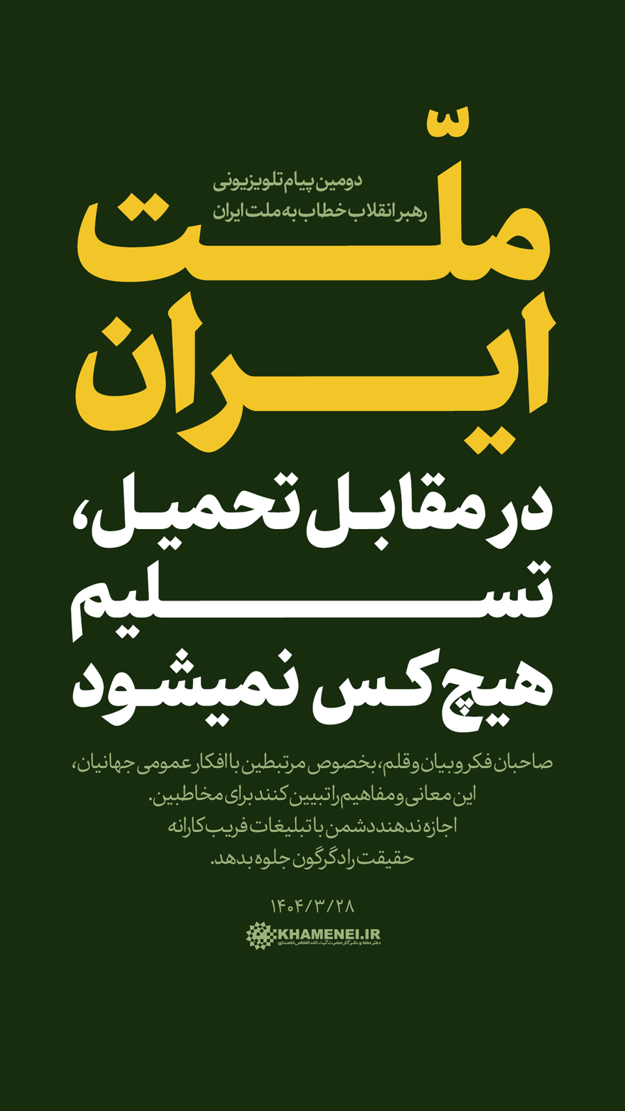 سخننگاشت | دومین پیام تلویزیونی خطاب به ملت ایران در پی تهاجم رژیم صهیونی![]() حضرت آیتالله خامنهای: «ملّت ایران در مقابل جنگ تحمیلی محکم میایستد ــ همچنان که تا حالا ایستاده ــ در مقابل صلح تحمیلی (هم) محکم میایستد.» ۱۴۰۴/۰۳/۲۸ رسانه KHAMENEI.IR در این مجموعه سخننگاشت مروری بر بیانات رهبر انقلاب اسلامی داشته است.