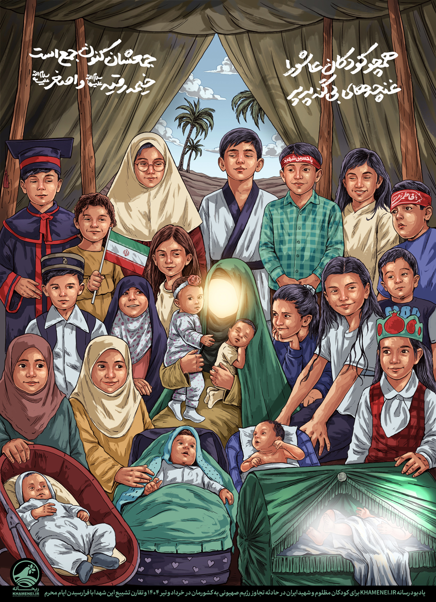 همچو کودکان عاشورا همچو کودکان عاشوراغنچههای بیگنه پرپر جمعشان کنون جمع است خیمه رقیه(س) و اصغر(ع) یادبود رسانه KHAMENEI.IR برای کودکان مظلوم و شهید ایران در حادثه تجاوز رژیم صهیونی به کشورمان در خرداد و تیر ۱۴۰۴ و تقارن تشییع این شهدا با فرارسیدن ایام محرم.