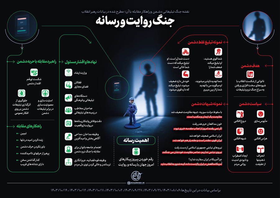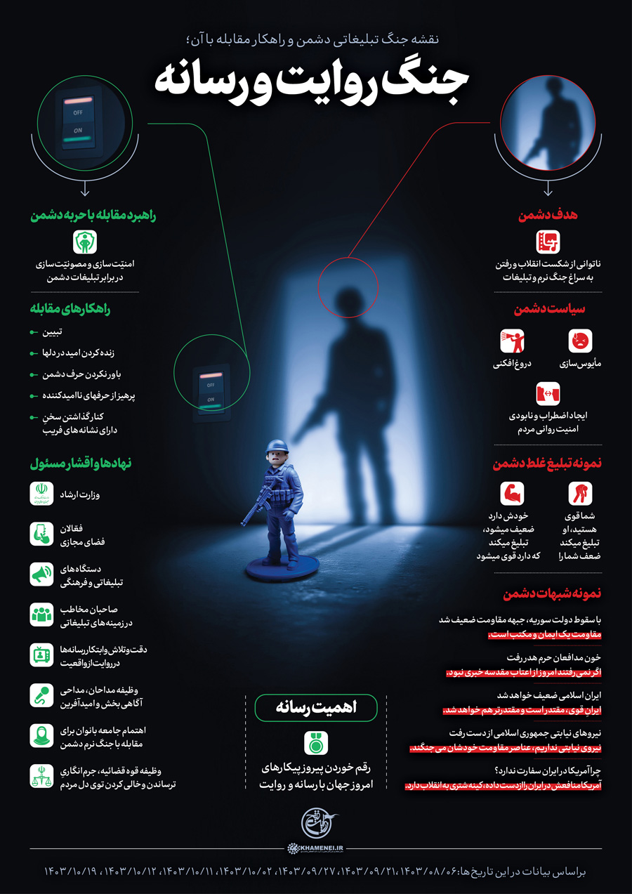 اطلاعنگاشت | جنگ روایت و رسانه رسانه KHAMENEI.IR در این اطلاعنگاشت نقشه جنگ تبلیغاتی دشمن و راهکار مقابله با آن را براساس بیانات رهبر انقلاب اسلامی، مرور میکند.