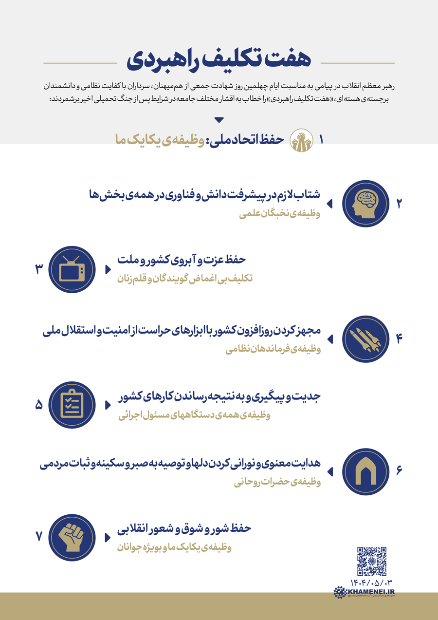 اطلاعنگاشت | هفت تکلیف راهبردی رهبر معظم انقلاب در پیامی به مناسبت ایام چهلمین روز شهادت جمعی از هممیهنان، سرداران با کفایت نظامی و دانشمندان برجستهی هستهای، «هفت تکلیف راهبردی» را خطاب به اقشار مختلف جامعه در شرایط پس از جنگ تحمیلی اخیر برشمردند که رسانه KHAMENEI.IR در این اطلاعنگاشت این موارد را مرور میکند.