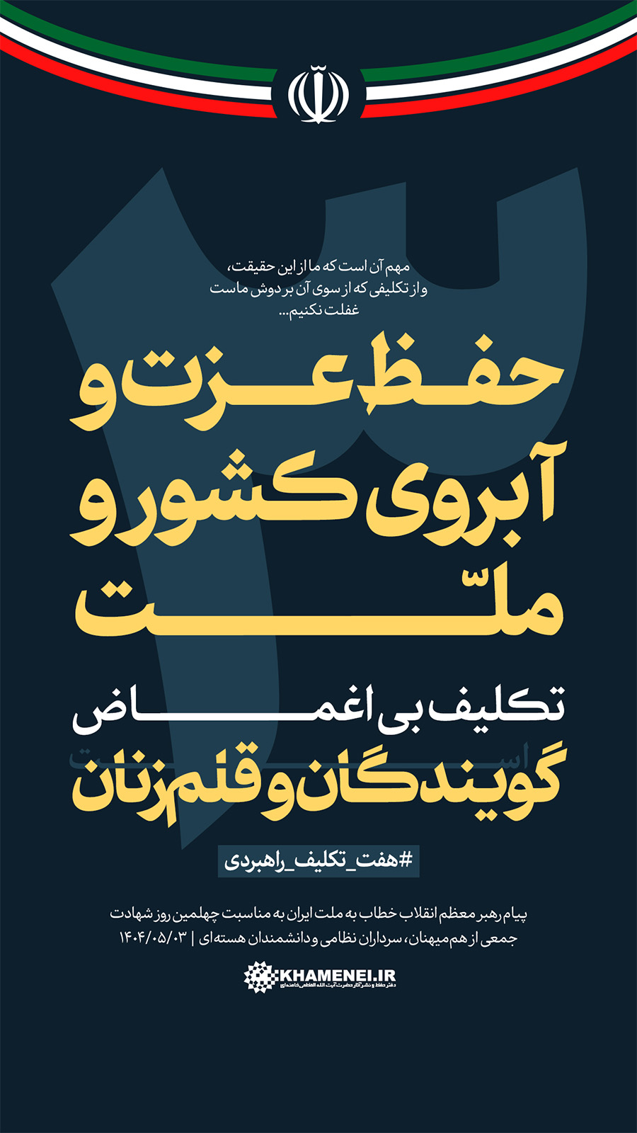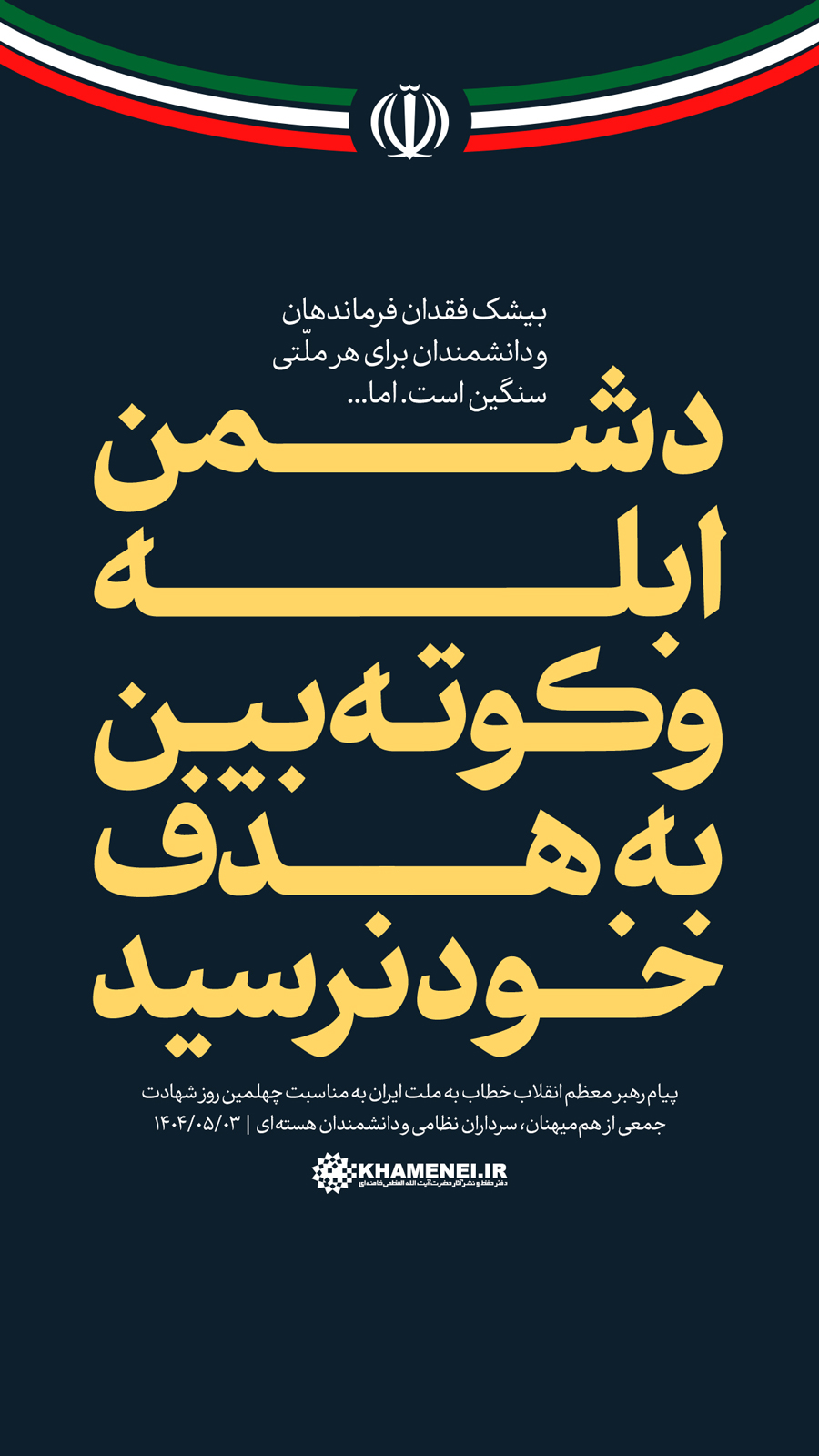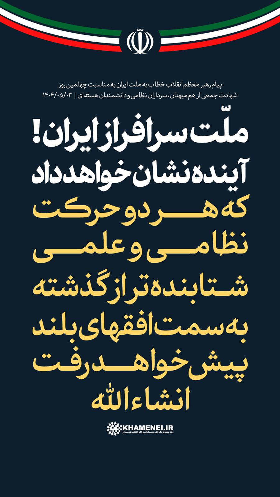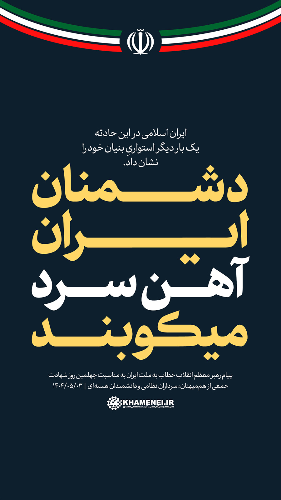 سخننگاشت | پیام خطاب به ملت ایران به مناسبت چهلمین روز شهادت جمعی از هممیهنان، سرداران نظامی و دانشمندان هستهای![]() به مناسبت چهلمین روز شهادت جمعی از هممیهنان، سرداران با کفایت نظامی و دانشمندان برجستهی هستهای کشور توسط رژیم خبیث و جنایتکار صهیونی، حضرت آیتالله خامنهای پیامی صادر کردند. رسانه KHAMENEI.IR در این مجموعه سخننگاشت مروری بر پیام رهبر انقلاب داشته است.