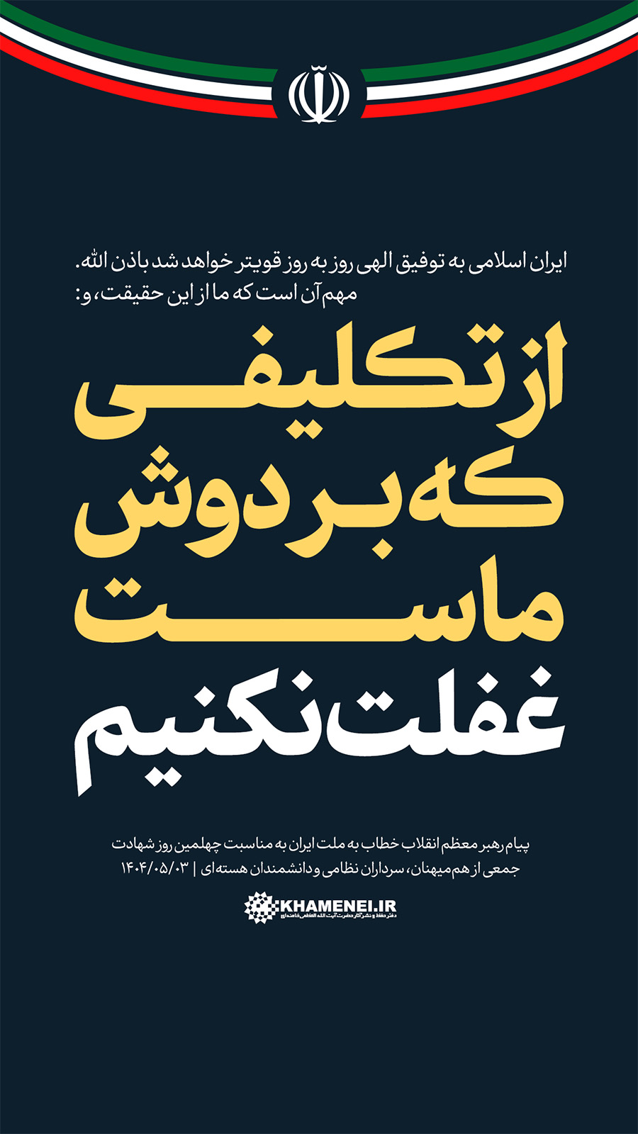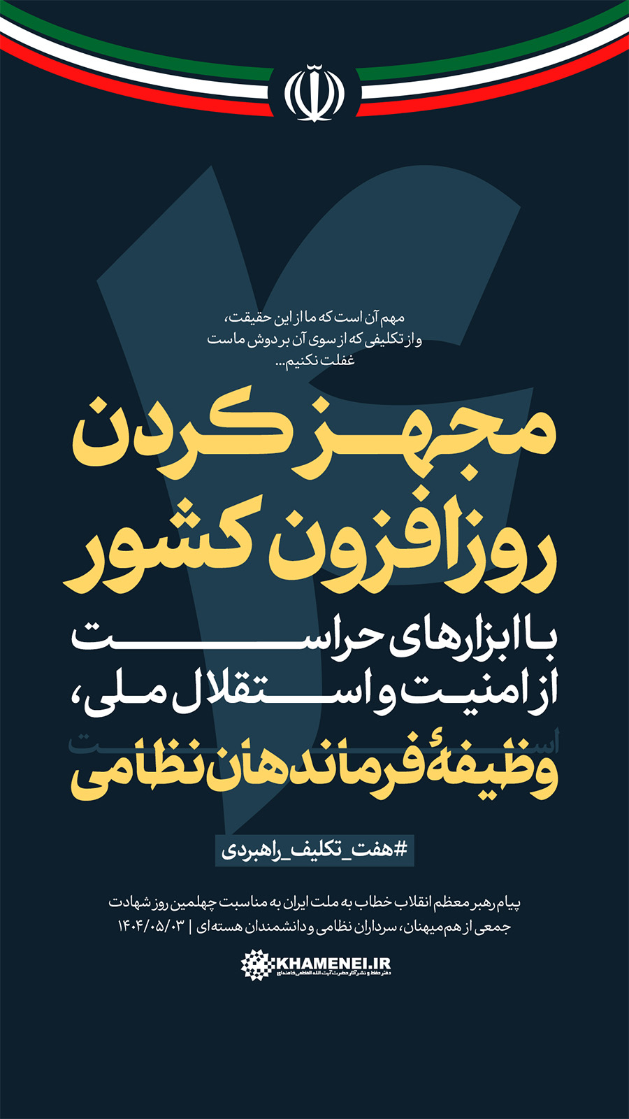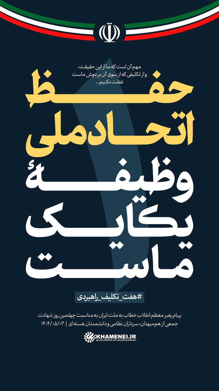 سخننگاشت | پیام خطاب به ملت ایران به مناسبت چهلمین روز شهادت جمعی از هممیهنان، سرداران نظامی و دانشمندان هستهای![]() به مناسبت چهلمین روز شهادت جمعی از هممیهنان، سرداران با کفایت نظامی و دانشمندان برجستهی هستهای کشور توسط رژیم خبیث و جنایتکار صهیونی، حضرت آیتالله خامنهای پیامی صادر کردند. رسانه KHAMENEI.IR در این مجموعه سخننگاشت مروری بر پیام رهبر انقلاب داشته است.