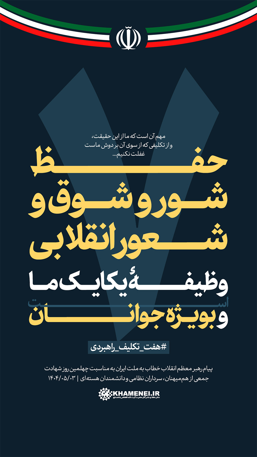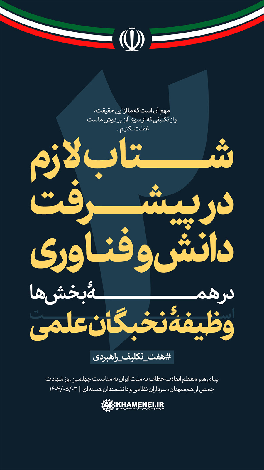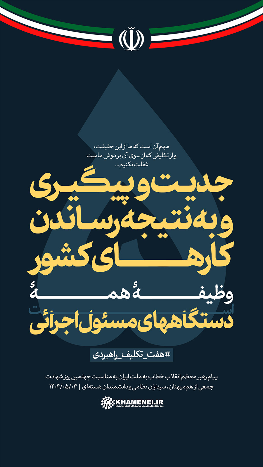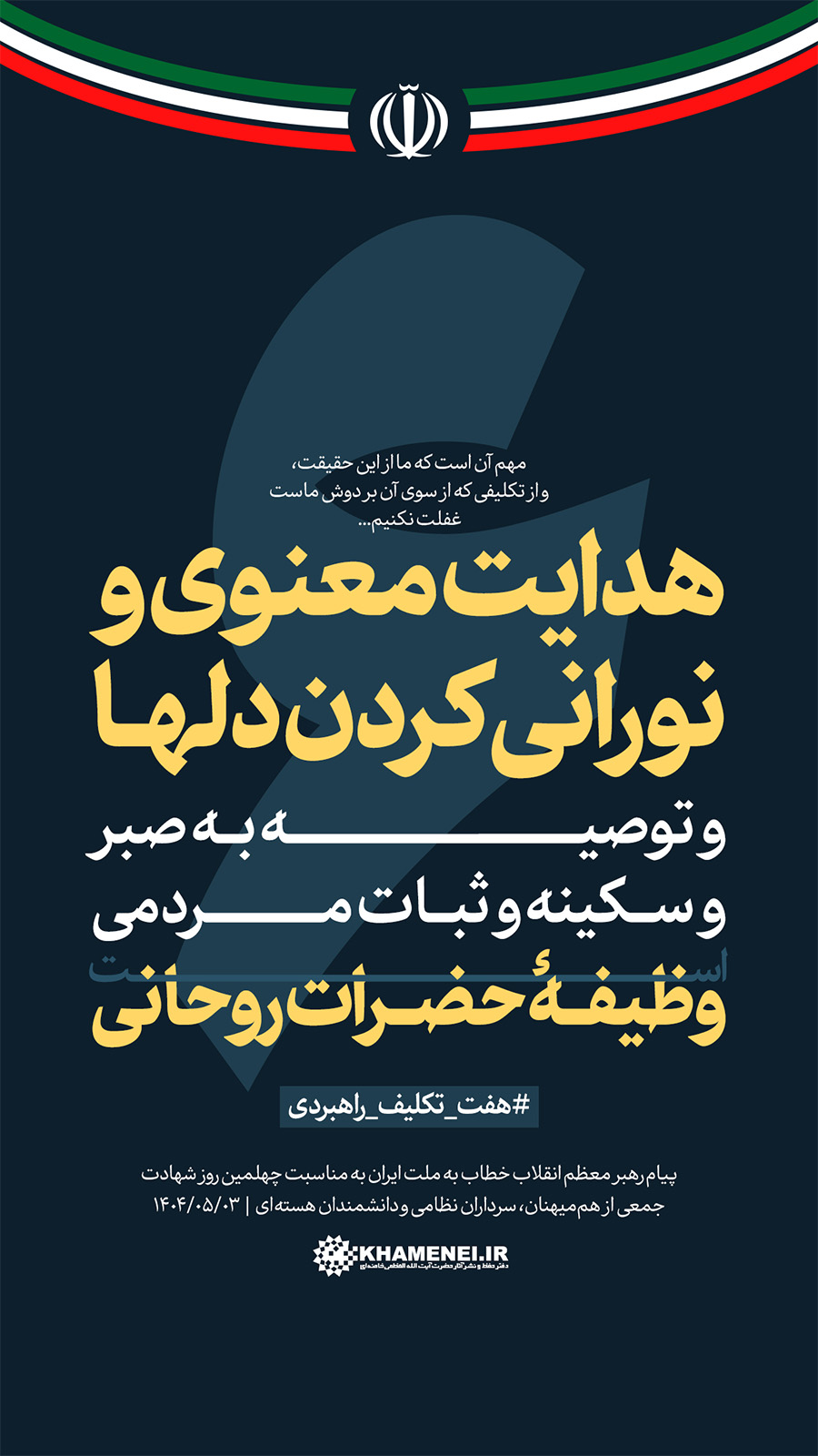 سخننگاشت | پیام خطاب به ملت ایران به مناسبت چهلمین روز شهادت جمعی از هممیهنان، سرداران نظامی و دانشمندان هستهای![]() به مناسبت چهلمین روز شهادت جمعی از هممیهنان، سرداران با کفایت نظامی و دانشمندان برجستهی هستهای کشور توسط رژیم خبیث و جنایتکار صهیونی، حضرت آیتالله خامنهای پیامی صادر کردند. رسانه KHAMENEI.IR در این مجموعه سخننگاشت مروری بر پیام رهبر انقلاب داشته است.