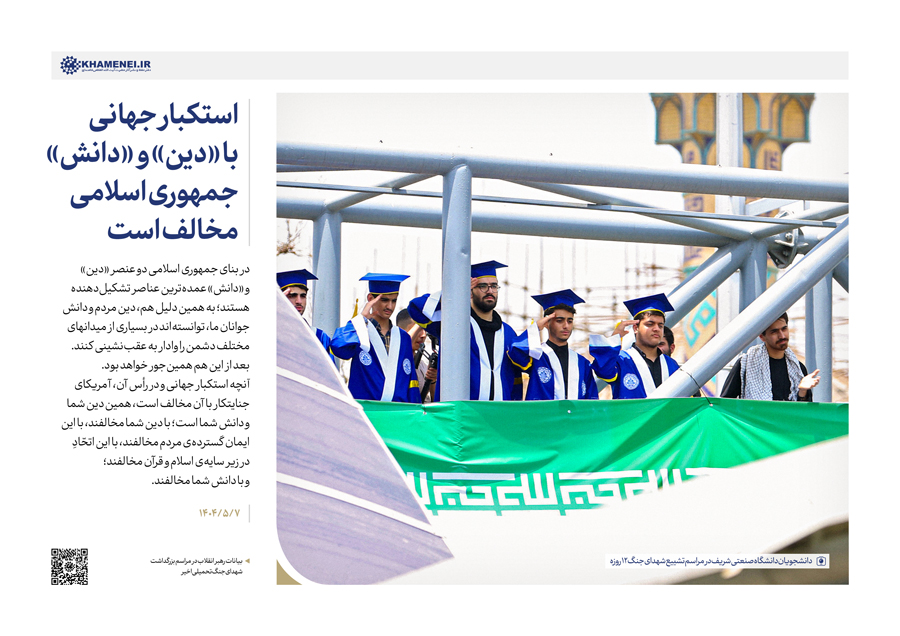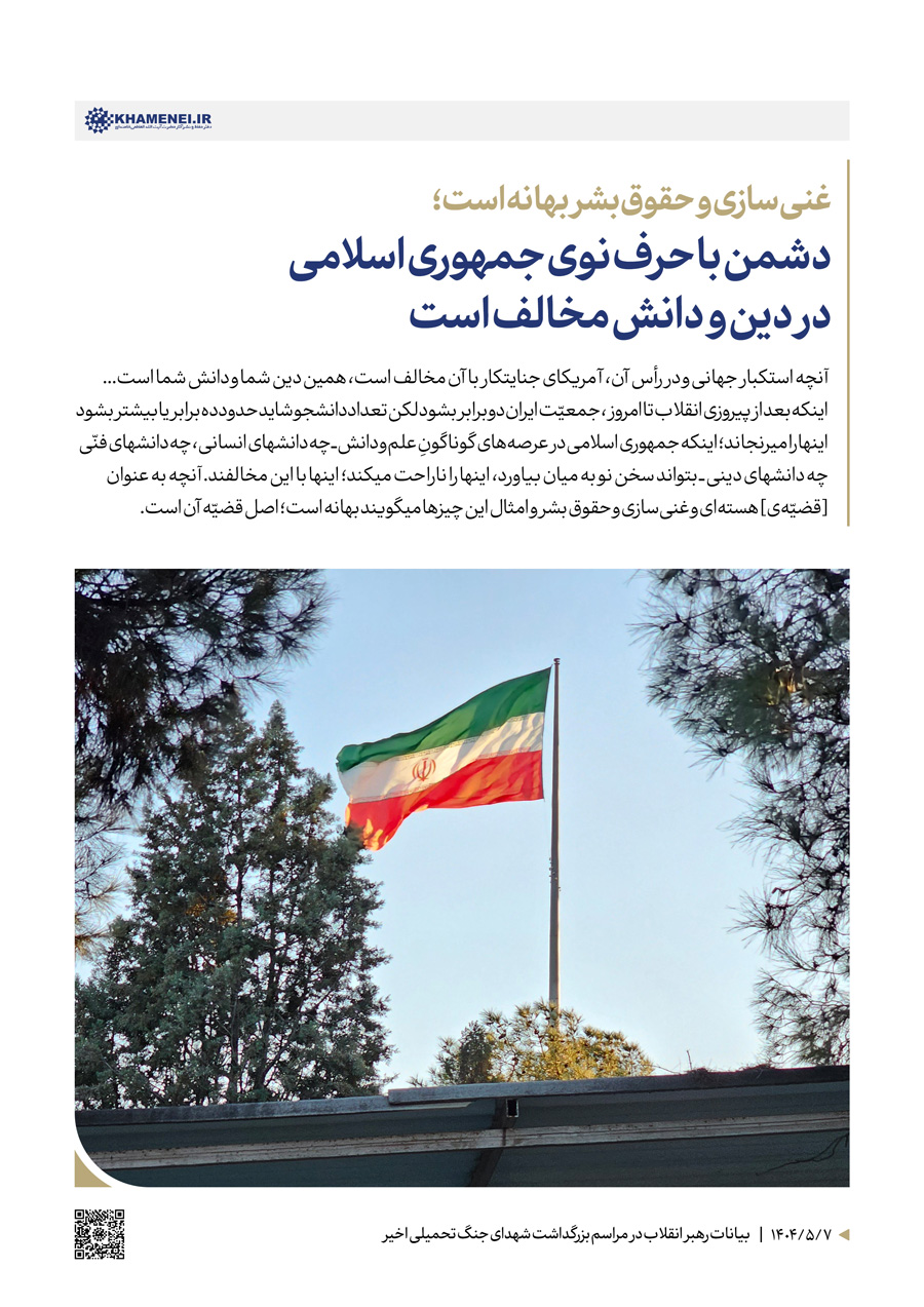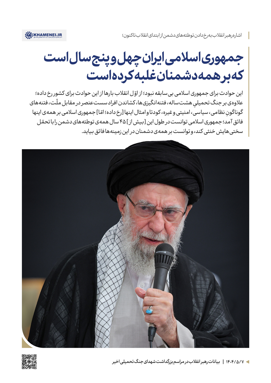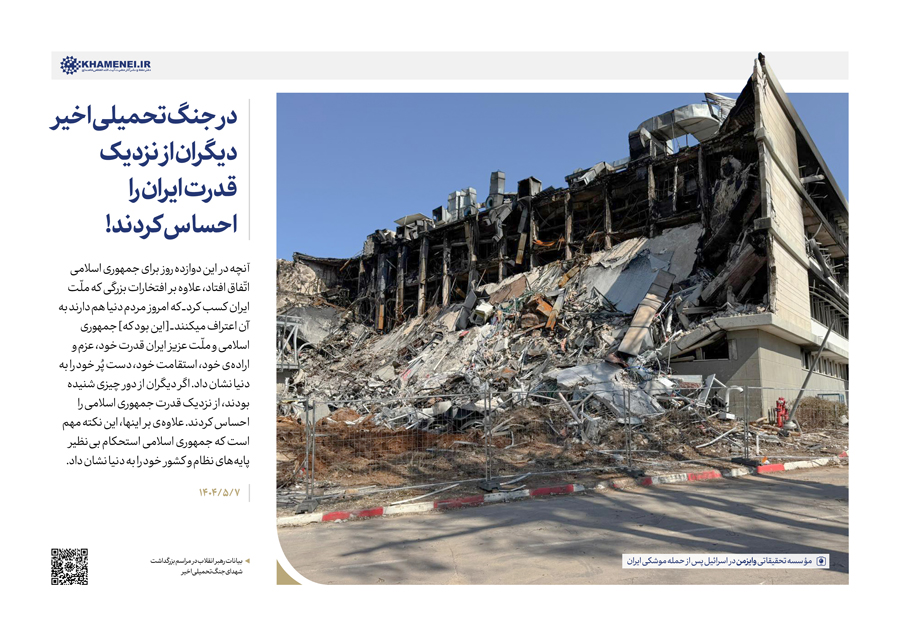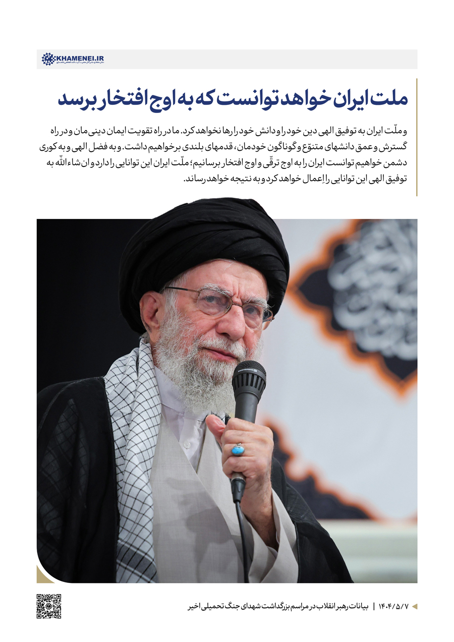 سخننگاشت | بیانات در مراسم بزرگداشت شهدای جنگ تحمیلی اخیر مراسم بزرگداشت شهدای جنگ تحمیلی اخیر با حضور رهبر انقلاب اسلامی، خانوادههای معظم شهیدان، جمعی از مسئولان ارشد کشور و لشکری و عموم مردم، صبح امروز سهشنبه ۷ مردادماه ۱۴۰۴ در حسینیه امام خمینی(ره) برگزار شد.حضرت آیتالله خامنهای در بخشی از این مراسم، دقایقی به سخنرانی پرداختند. رسانه KHAMENEI.IR در این مجموعه سخننگاشت مروری بر بیانات رهبر انقلاب داشته است. در این