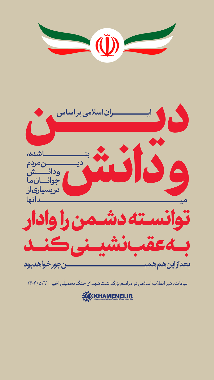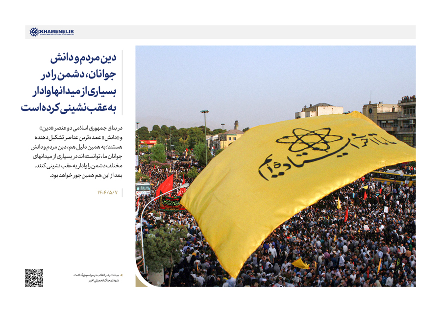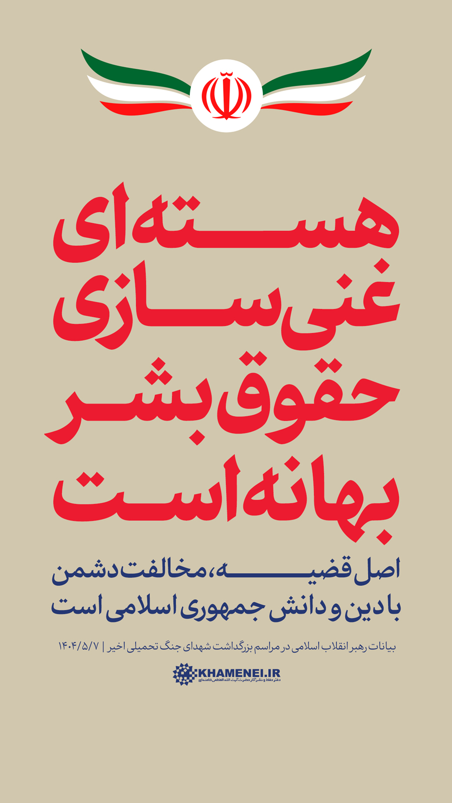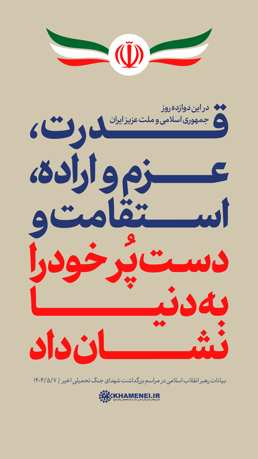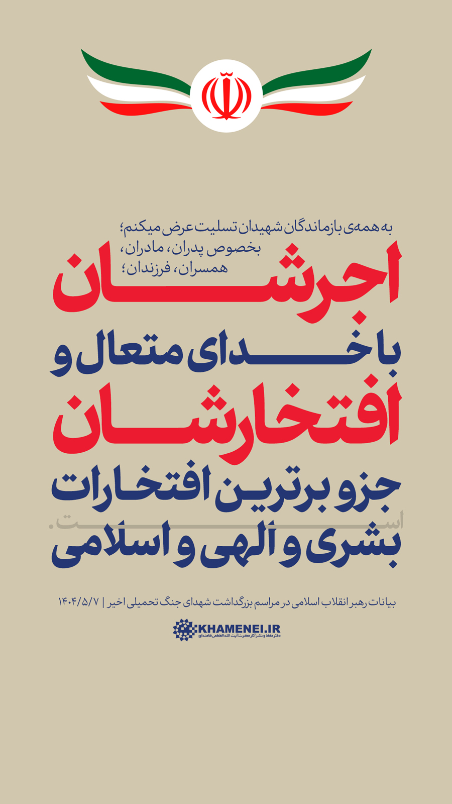 سخننگاشت | بیانات در مراسم بزرگداشت شهدای جنگ تحمیلی اخیر مراسم بزرگداشت شهدای جنگ تحمیلی اخیر با حضور رهبر انقلاب اسلامی، خانوادههای معظم شهیدان، جمعی از مسئولان ارشد کشور و لشکری و عموم مردم، صبح امروز سهشنبه ۷ مردادماه ۱۴۰۴ در حسینیه امام خمینی(ره) برگزار شد.حضرت آیتالله خامنهای در بخشی از این مراسم، دقایقی به سخنرانی پرداختند. رسانه KHAMENEI.IR در این مجموعه سخننگاشت مروری بر بیانات رهبر انقلاب داشته است. در این