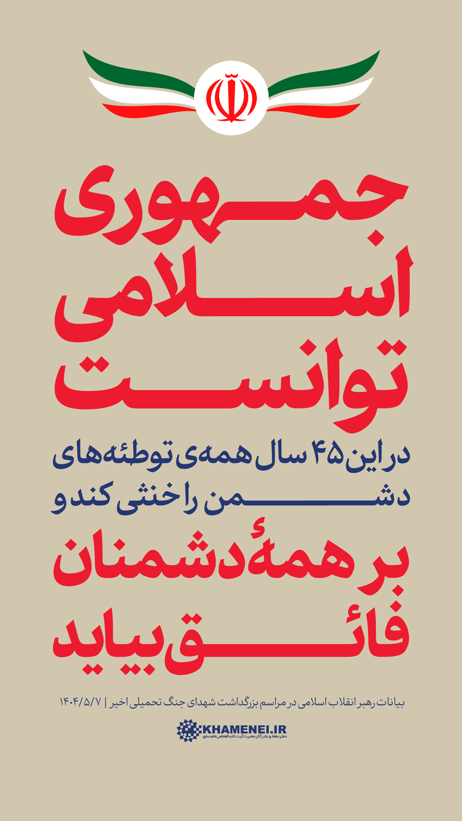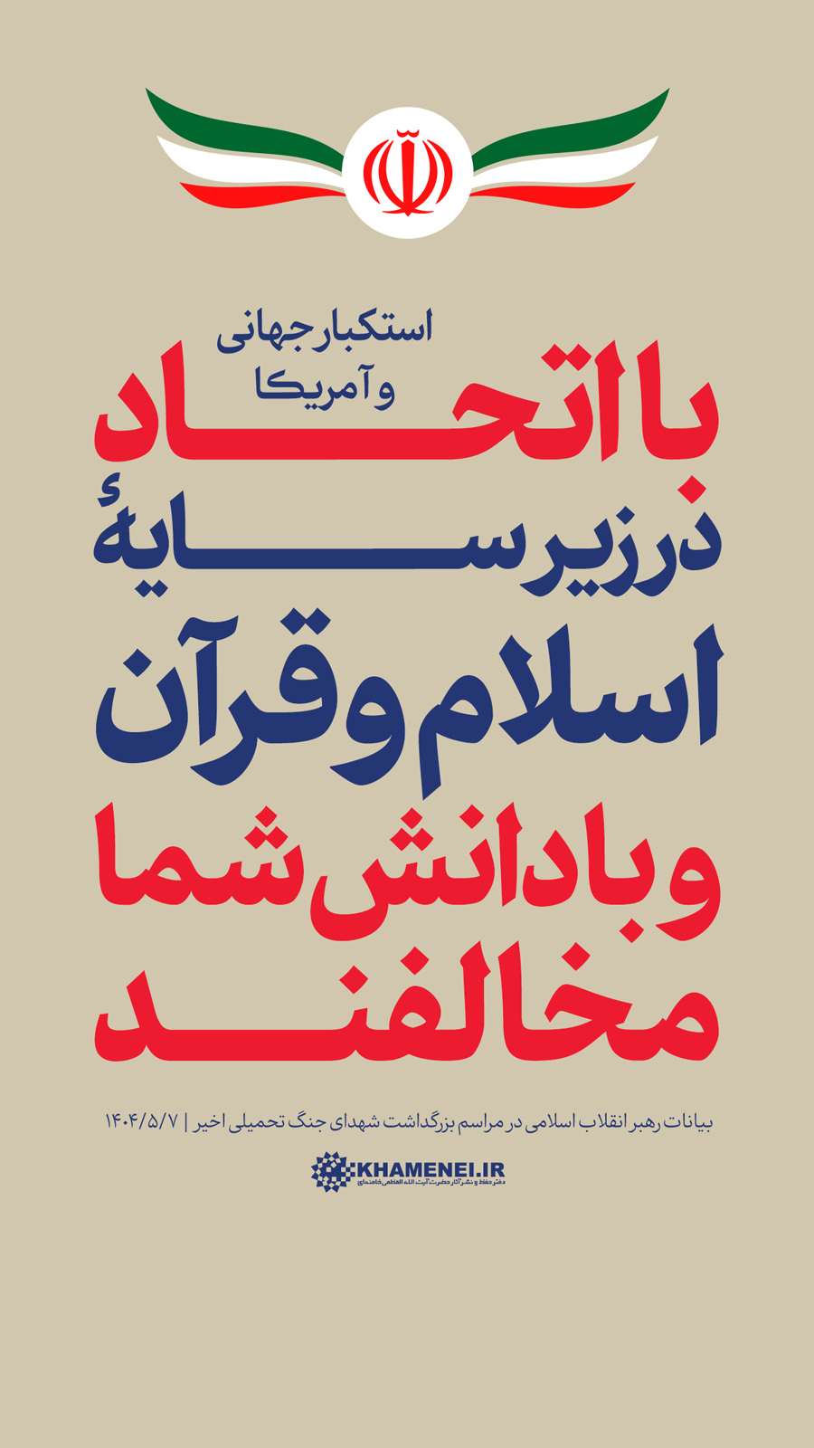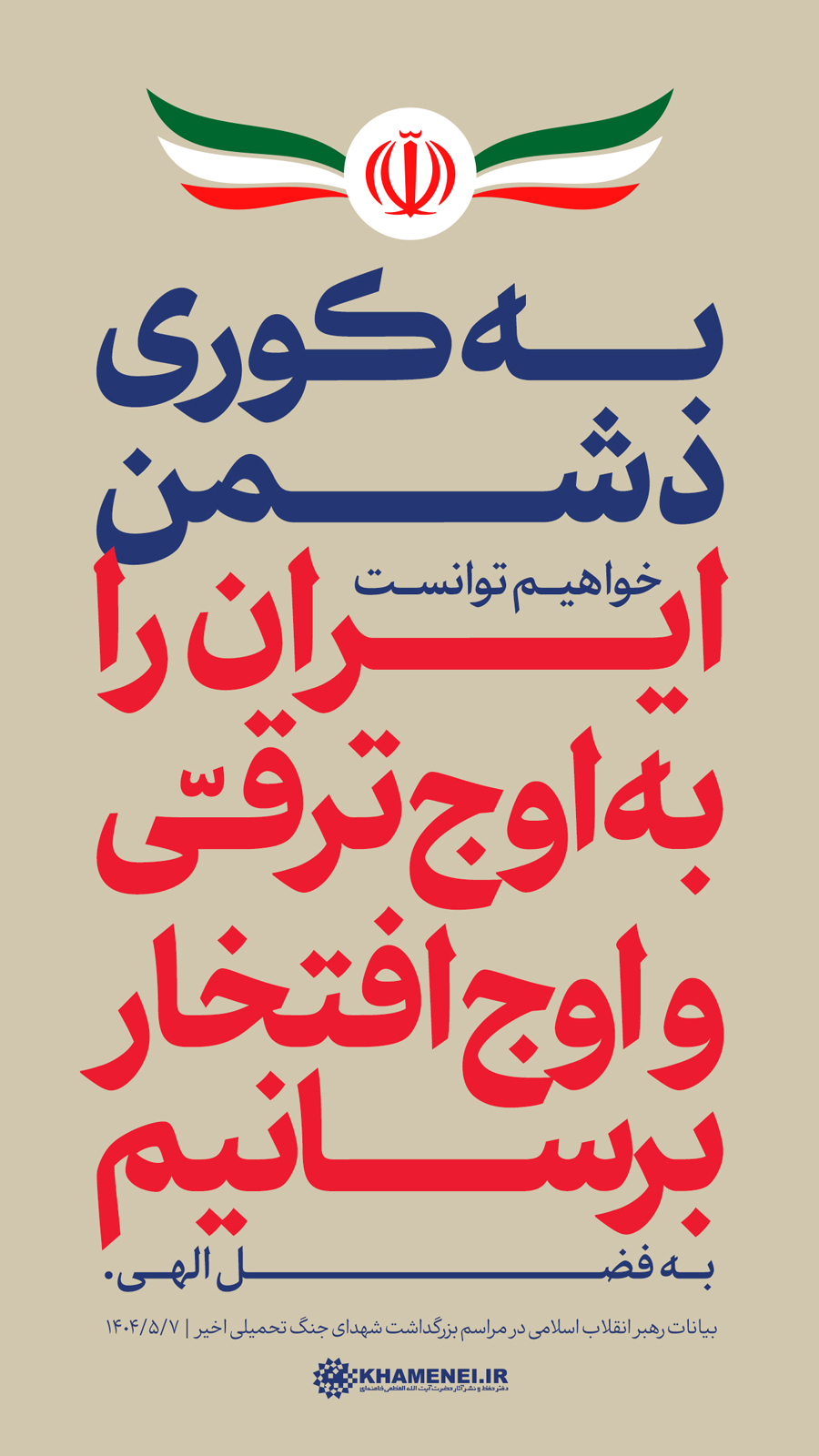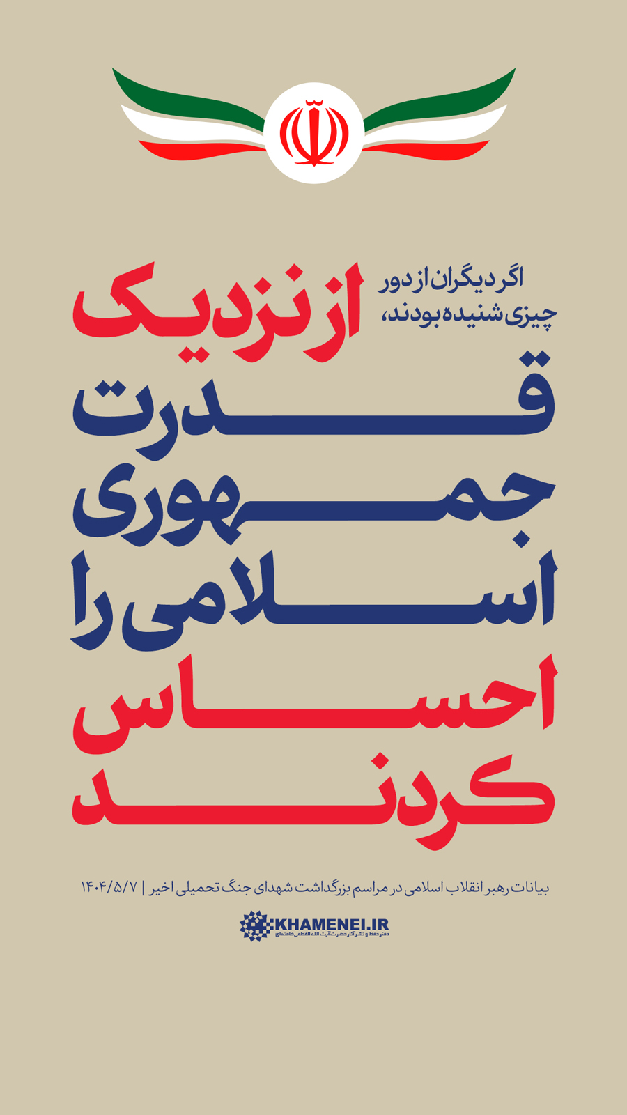 سخننگاشت | بیانات در مراسم بزرگداشت شهدای جنگ تحمیلی اخیر مراسم بزرگداشت شهدای جنگ تحمیلی اخیر با حضور رهبر انقلاب اسلامی، خانوادههای معظم شهیدان، جمعی از مسئولان ارشد کشور و لشکری و عموم مردم، صبح امروز سهشنبه ۷ مردادماه ۱۴۰۴ در حسینیه امام خمینی(ره) برگزار شد.حضرت آیتالله خامنهای در بخشی از این مراسم، دقایقی به سخنرانی پرداختند. رسانه KHAMENEI.IR در این مجموعه سخننگاشت مروری بر بیانات رهبر انقلاب داشته است. در این