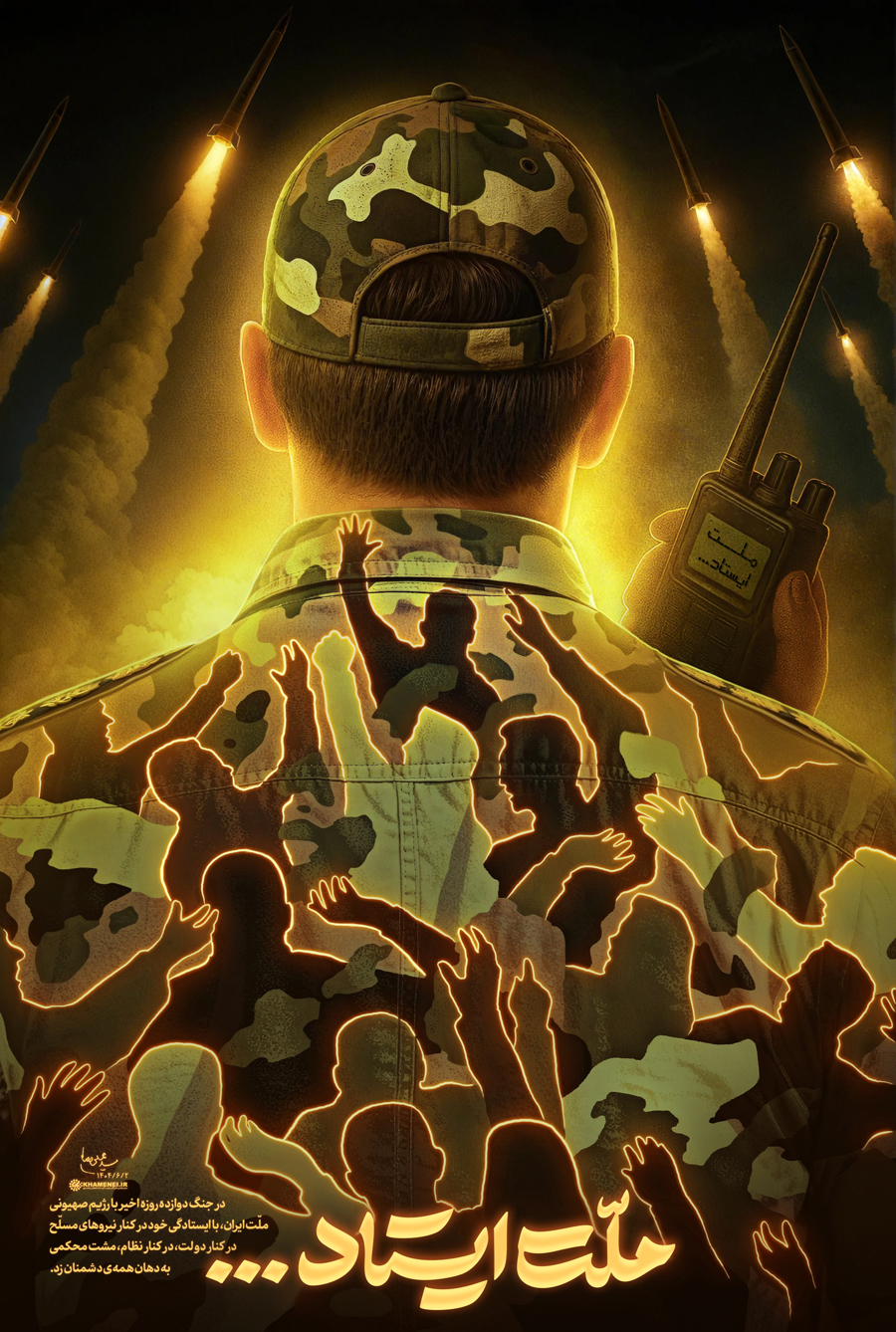 ملت ایستاد... حضرت آیتالله خامنهای: در جنگ دوازده روزه اخیر با رژیم صهیونی، ملّت ایران، با ایستادگی خود در کنار نیروهای مسلّح در کنار دولت، در کنار نظام، مشت محکمی به دهان همهی دشمنان زد. ۱۴۰۴/۶/۲رسانه KHAMENEI.IR براساس این بخش از بیانات رهبر انقلاب، لوح «ملّت ایستاد...» را منتشر میکند.