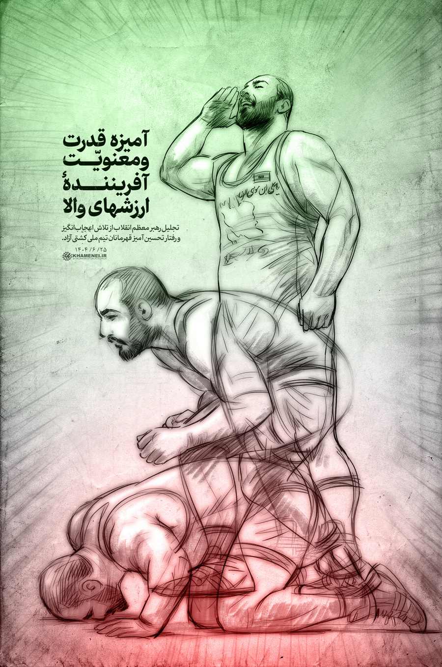 آمیزه قدرت و معنویت آفریننده ارزشهای والا حضرت آیتالله خامنهای در پیام تبریک به مناسبت قهرمانی تیم ملّی کشتی آزاد در مسابقات جهانی ۲۰۲۵: «آمیزهی قدرت و معنویّت، آفرینندهی ارزشهای والا است. آفرین بر شما!» ۱۴۰۴/۰۶/۲۵رسانه KHAMENEI.IR به مناسبت افتخارآفرینی قهرمانان تیم ملی کشتی آزاد کشورمان، لوح «آمیزه قدرت و معنویت آفریننده ارزشهای والا» منتشر میکند.