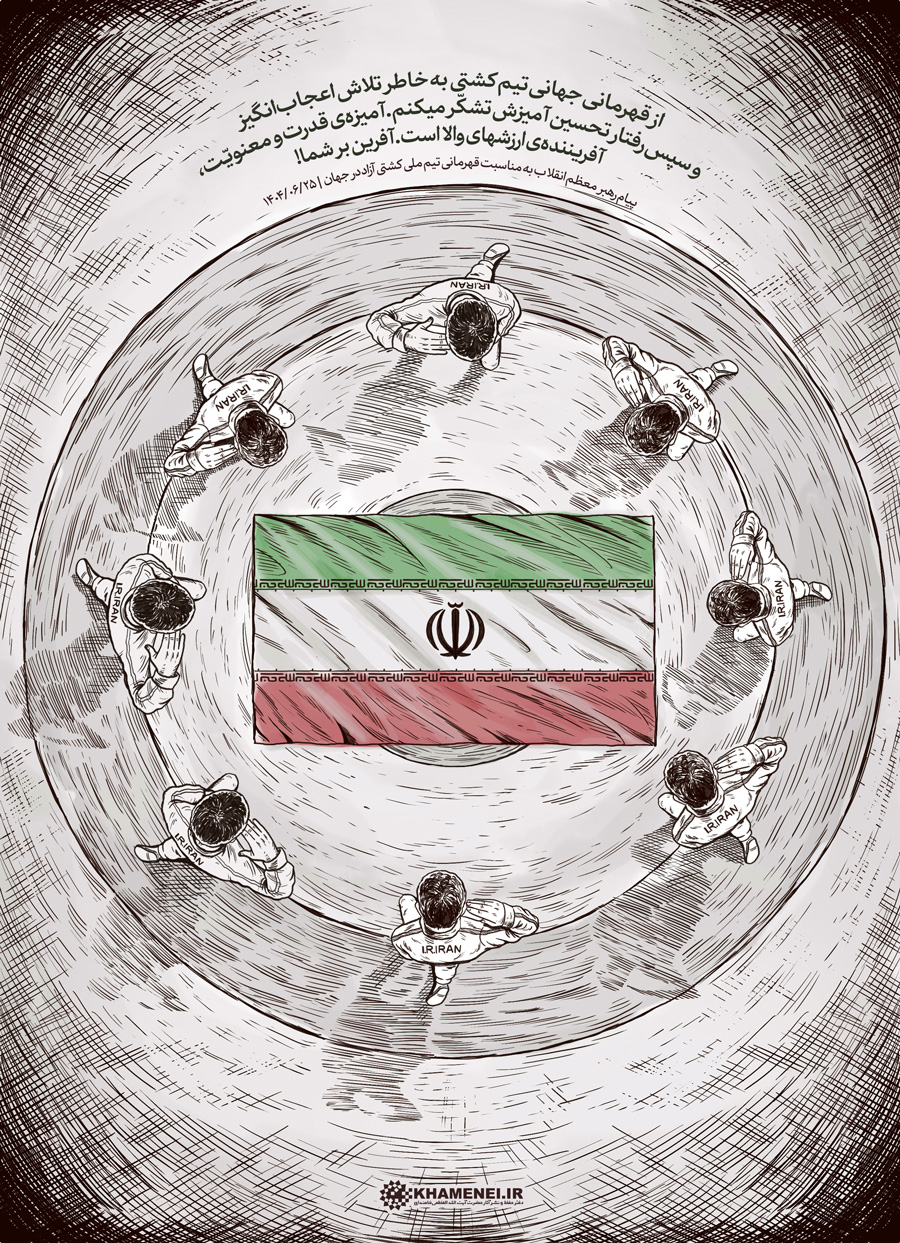 آفرین بر شما حضرت آیتالله خامنهای در پیام تبریک به مناسبت قهرمانی تیم ملّی کشتی آزاد در مسابقات جهانی ۲۰۲۵: «از قهرمانی جهانی تیم کشتی به خاطر تلاش اعجابانگیز و سپس رفتار تحسینآمیزش تشکّر میکنم. آمیزهی قدرت و معنویّت، آفرینندهی ارزشهای والا است. آفرین بر شما!» ۱۴۰۴/۰۶/۲۵رسانه KHAMENEI.IR به مناسبت افتخارآفرینی قهرمانان تیم ملی کشتی آزاد کشورمان، لوح «آفرین بر شما» منتشر میکند.