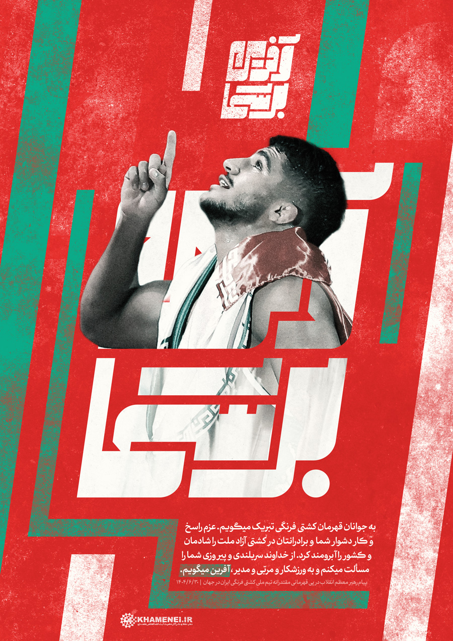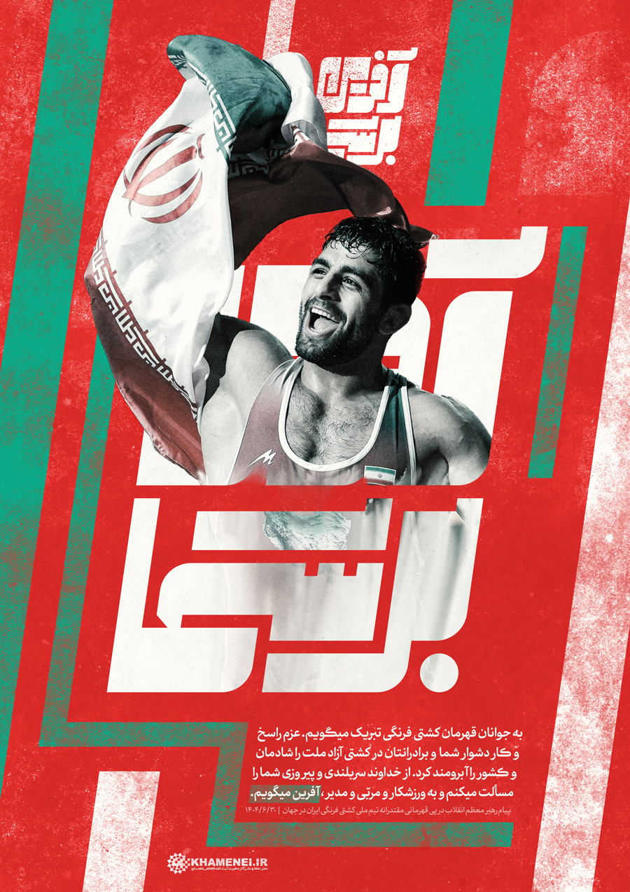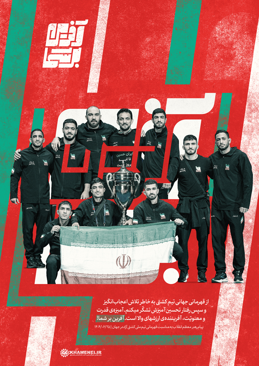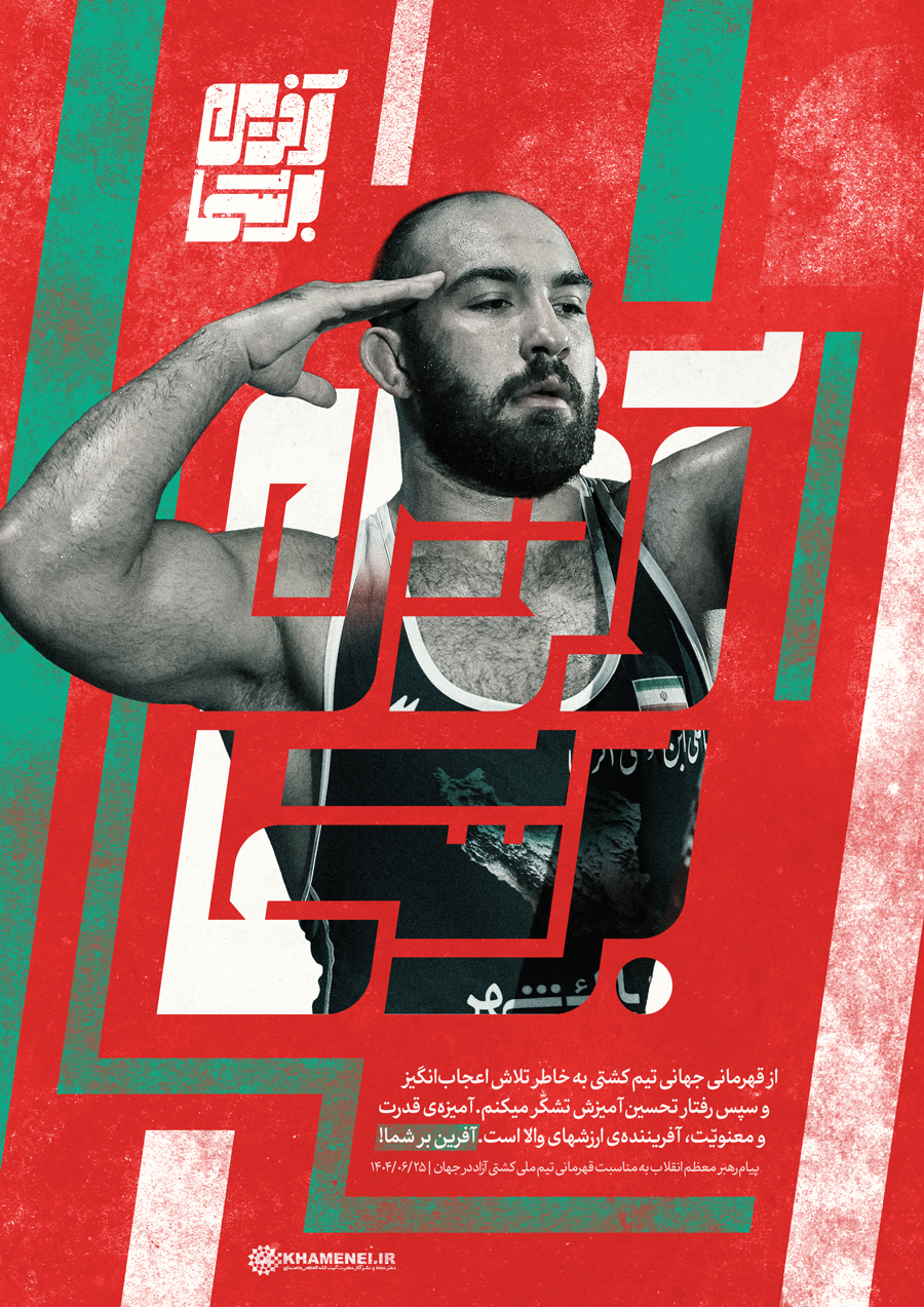 آفرین بر شما حضرت آیتالله خامنهای در پیامهایی قهرمانی تیمهای ملی کشتی آزاد و فرنگی کشورمان در مسابقات جهانی ۲۰۲۵ را تبریک گفتند.رسانه KHAMENEI.IR به مناسبت افتخارآفرینی قهرمانان تیمهای ملّی کشتی آزاد و فرنگی کشورمان، مجموعه لوح «آفرین بر شما» منتشر میکند.