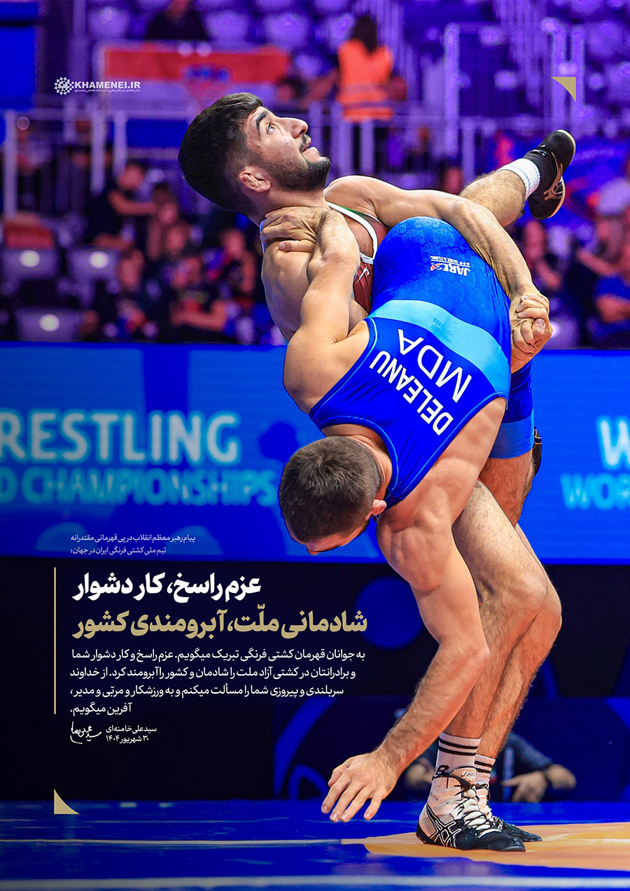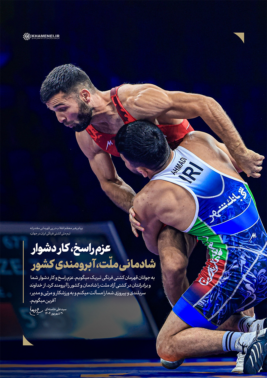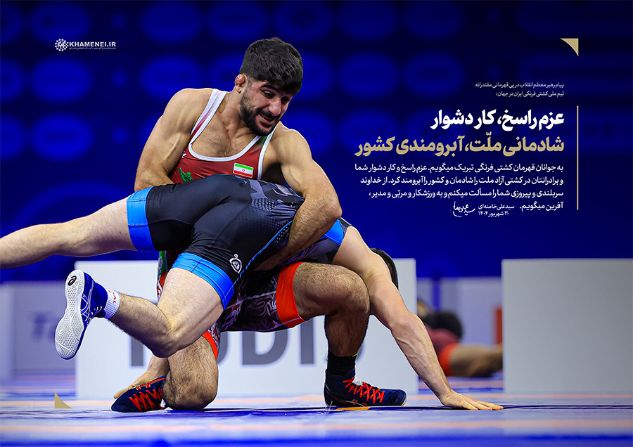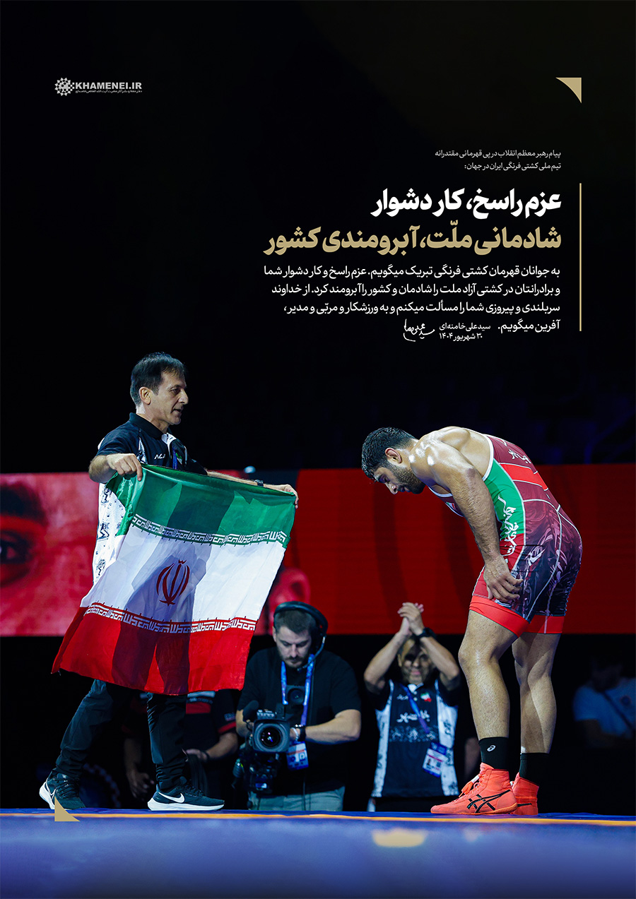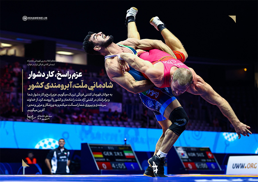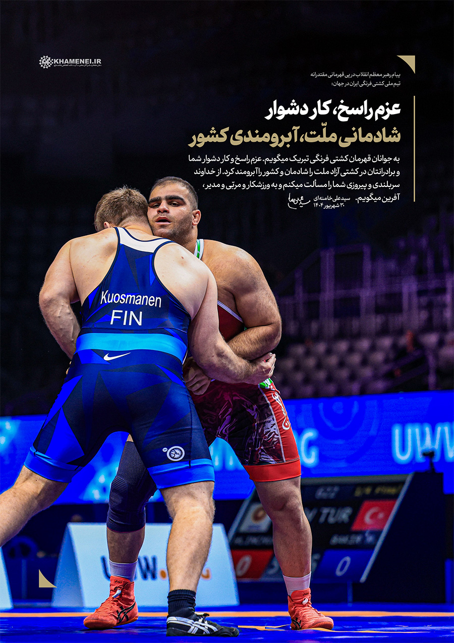 عزم راسخ، کار دشوار؛ شادمانی ملّت، آبرومندی کشور حضرت آیتالله خامنهای در پیام تبریک به مناسبت قهرمانی تیم ملّی کشتی فرنگی در مسابقات جهانی ۲۰۲۵: «به جوانان قهرمان کشتی فرنگی تبریک میگویم. عزم راسخ و کار دشوار شما و برادرانتان در کشتی آزاد، ملّت را شادمان و کشور را آبرومند کرد. از خداوند سربلندی و پیروزی شما را مسئلت میکنم و به ورزشکار و مربّی و مدیر، آفرین میگویم.» ۱۴۰۴/۰۶/۳۰رسانه KHAMENEI.IR برهمین اساس، قابهایی از افتخارآفرینی قهرمانان تیم ملّی کشتی فرنگی را در مجموعه «عزم راسخ، کار دشوار؛ شادمانی ملّت، آبرومندی کشور» منتشر میکند. در این