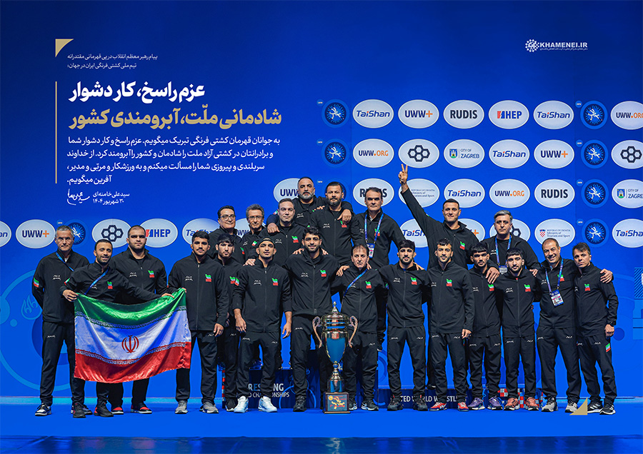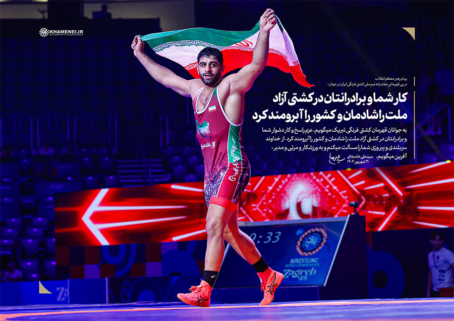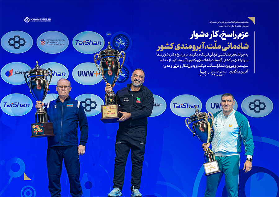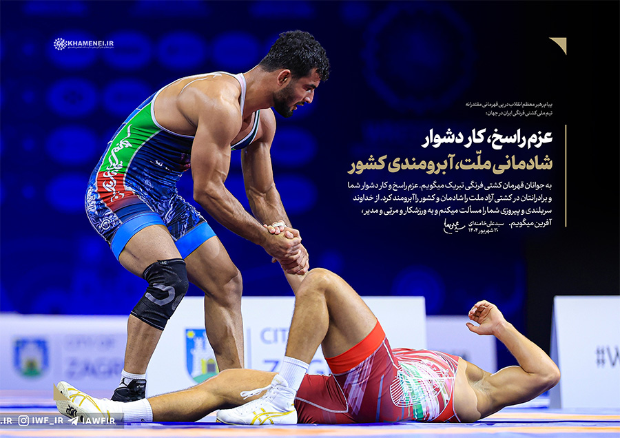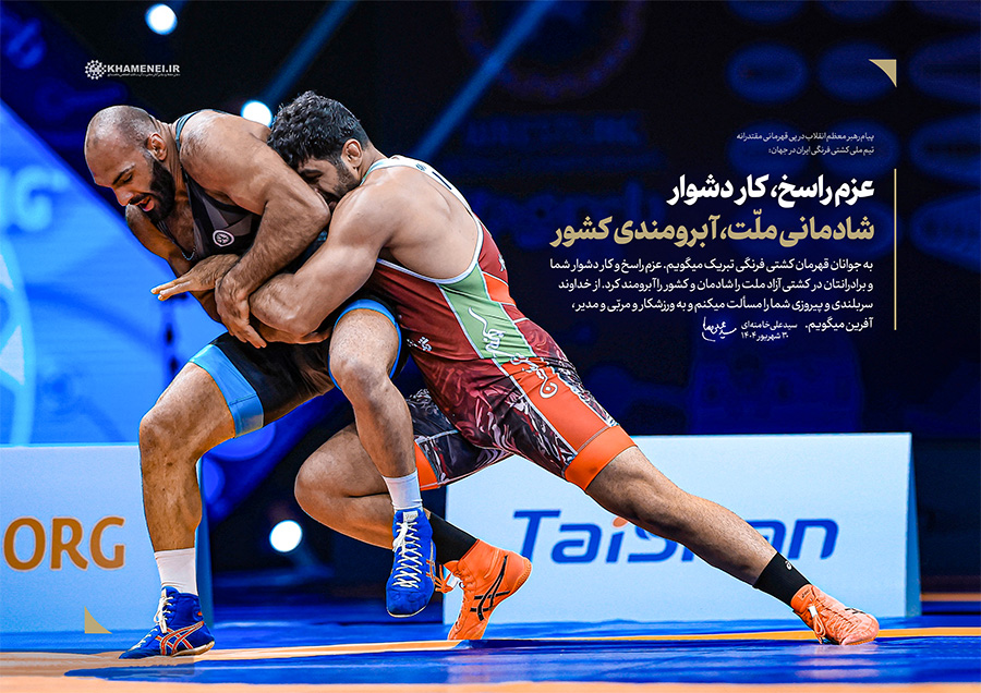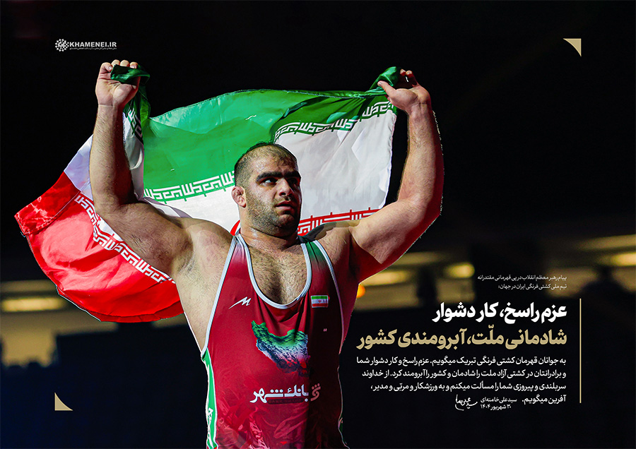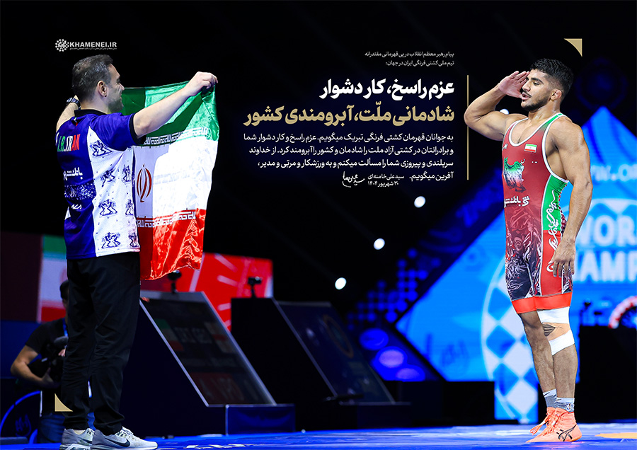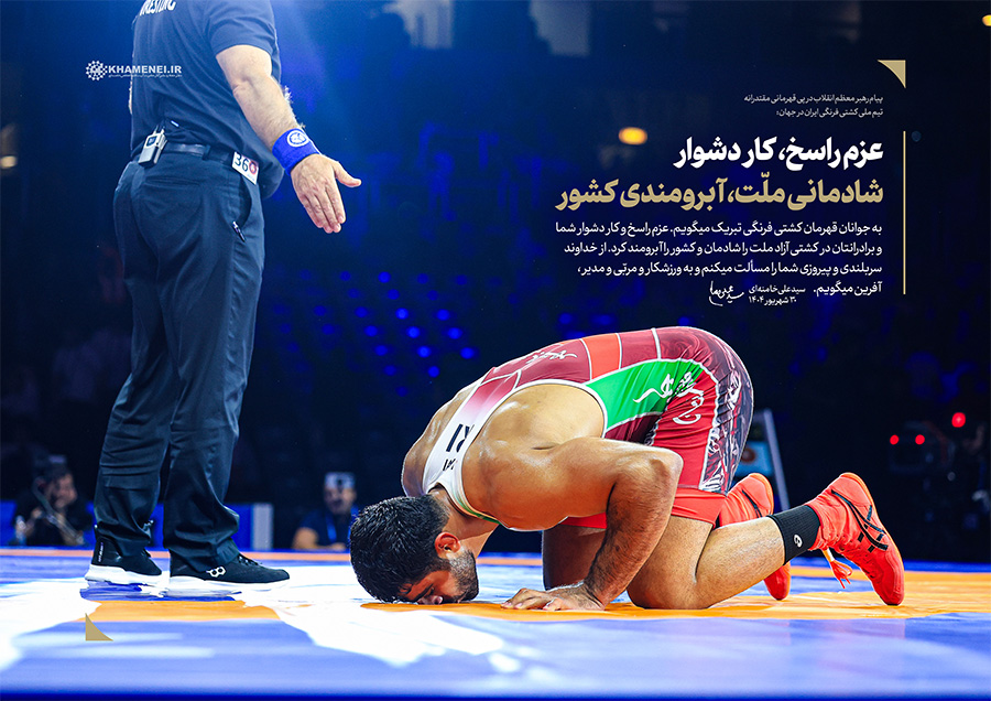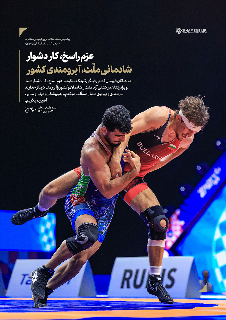 عزم راسخ، کار دشوار؛ شادمانی ملّت، آبرومندی کشور حضرت آیتالله خامنهای در پیام تبریک به مناسبت قهرمانی تیم ملّی کشتی فرنگی در مسابقات جهانی ۲۰۲۵: «به جوانان قهرمان کشتی فرنگی تبریک میگویم. عزم راسخ و کار دشوار شما و برادرانتان در کشتی آزاد، ملّت را شادمان و کشور را آبرومند کرد. از خداوند سربلندی و پیروزی شما را مسئلت میکنم و به ورزشکار و مربّی و مدیر، آفرین میگویم.» ۱۴۰۴/۰۶/۳۰رسانه KHAMENEI.IR برهمین اساس، قابهایی از افتخارآفرینی قهرمانان تیم ملّی کشتی فرنگی را در مجموعه «عزم راسخ، کار دشوار؛ شادمانی ملّت، آبرومندی کشور» منتشر میکند. در این