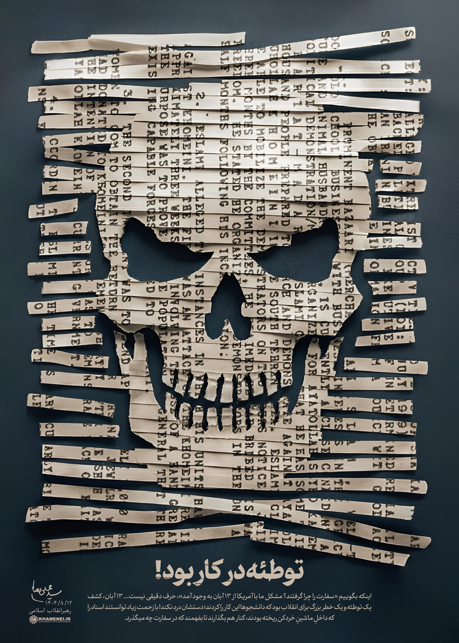 حضرت آیتالله خامنهای: «اینکه بگوییم «سفارت را چرا گرفتند؟ مشکل ما با آمریکا از ۱۳ آبان به وجود آمد»، حرف دقیقی نیست... ۱۳ آبان، کشف یک توطئه و یک خطر بزرگ برای انقلاب بود که دانشجوها این کار را کردند؛ دستشان درد نکند! با زحمت زیاد توانستند اسناد را که داخلِ ماشینِ خردکن ریخته بودند، کنار هم بگذارند تا بفهمند که در سفارت چه میگذرد.» ۱۴۰۴/۰۸/۱۲ رسانه KHAMENEI.IR براساس این بخش از بیانات رهبر انقلاب و به مناسبت سالروز تسخیر لانه جاسوسی در سیزدهم آبانماه ۱۳۵۸، لوح «توطئه در کار بود!» را منتشر میکند.