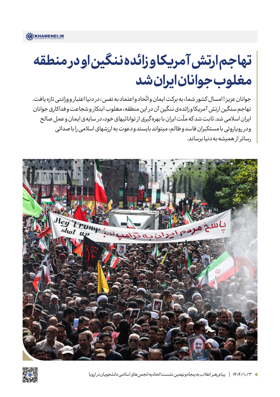 حضرت آیتالله خامنهای در پیامی به پنجاه و نهمین نشست سالانهی اتّحادیه انجمنهای اسلامی دانشجویان در اروپا با اشاره به شکست تهاجم سنگین ارتش آمریکا و زائده ننگین آن در منطقه، به دلیل ابتکار و شجاعت و فداکاری جوانان ایران اسلامی، تأکید کردند: علّت اصلی آشفتگی زورگویان فاسد و مفسد، نه بحث هستهای، بلکه برافراشته شدن پرچم مقابله با نظم ناعادلانه و تحکّم نظام سلطه در جهان و روی آوردن به نظام عادلانه ملی و بینالمللی اسلامی از جانب ایران اسلامی است.